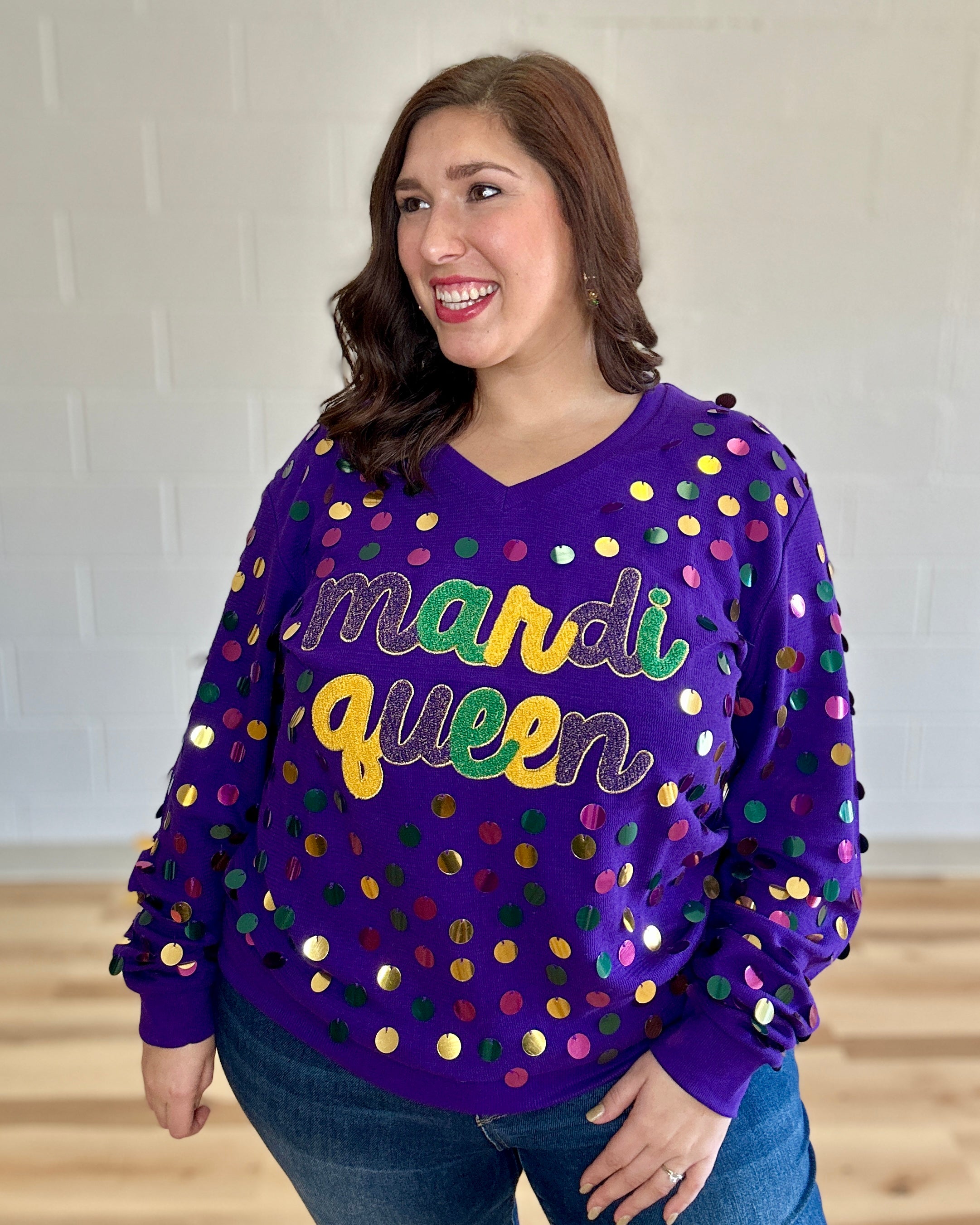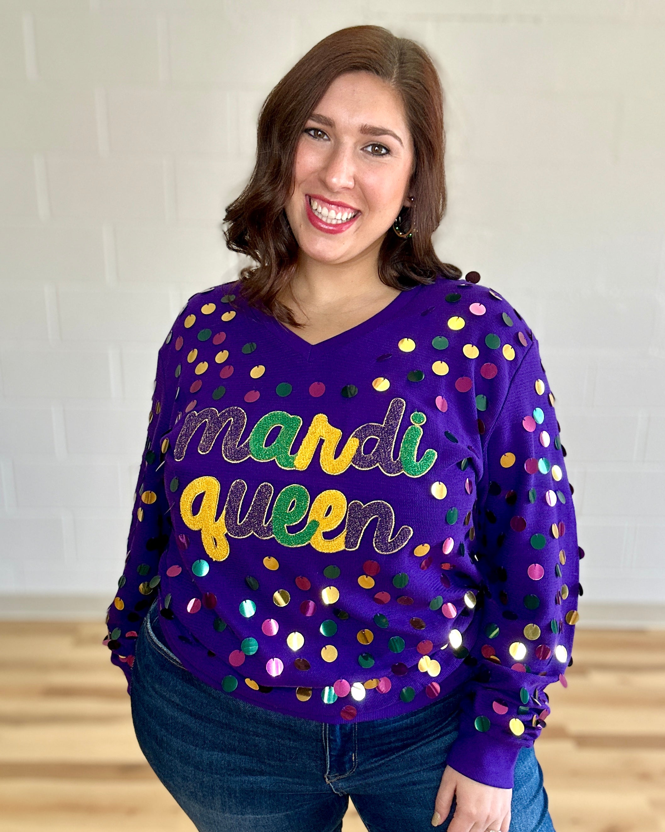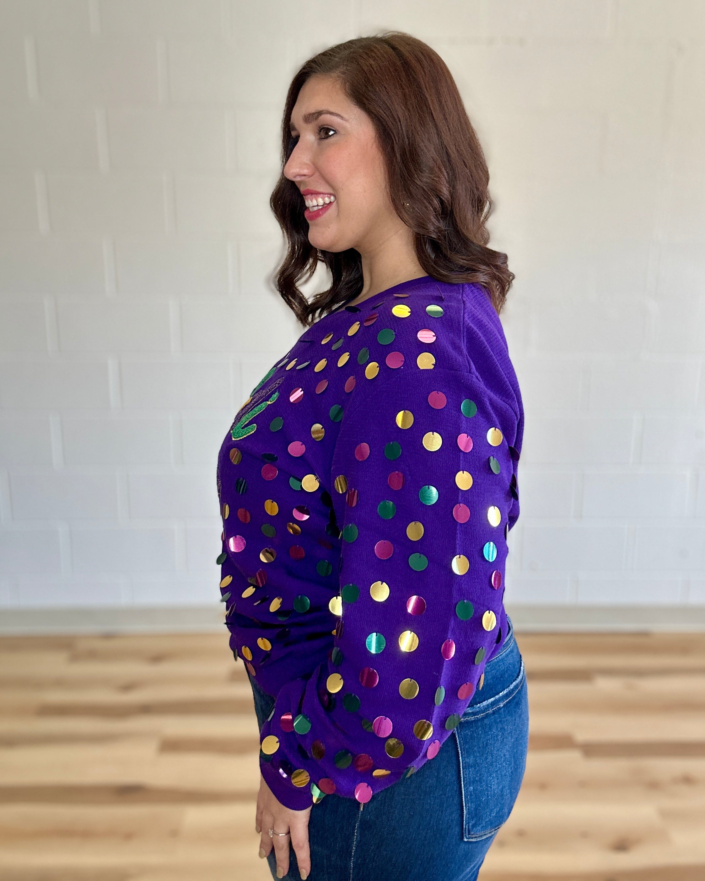Stay ahead of the carnival crowd in style with the Mardi Queen V-Neck Top in purple. Featuring oversized sequins in purple, green, and gold this fun and flirty pullover is the perfect way to get your shine on, no matter the time of year. Get your vivacious vibes on and snag yourself this sparkly sensation!