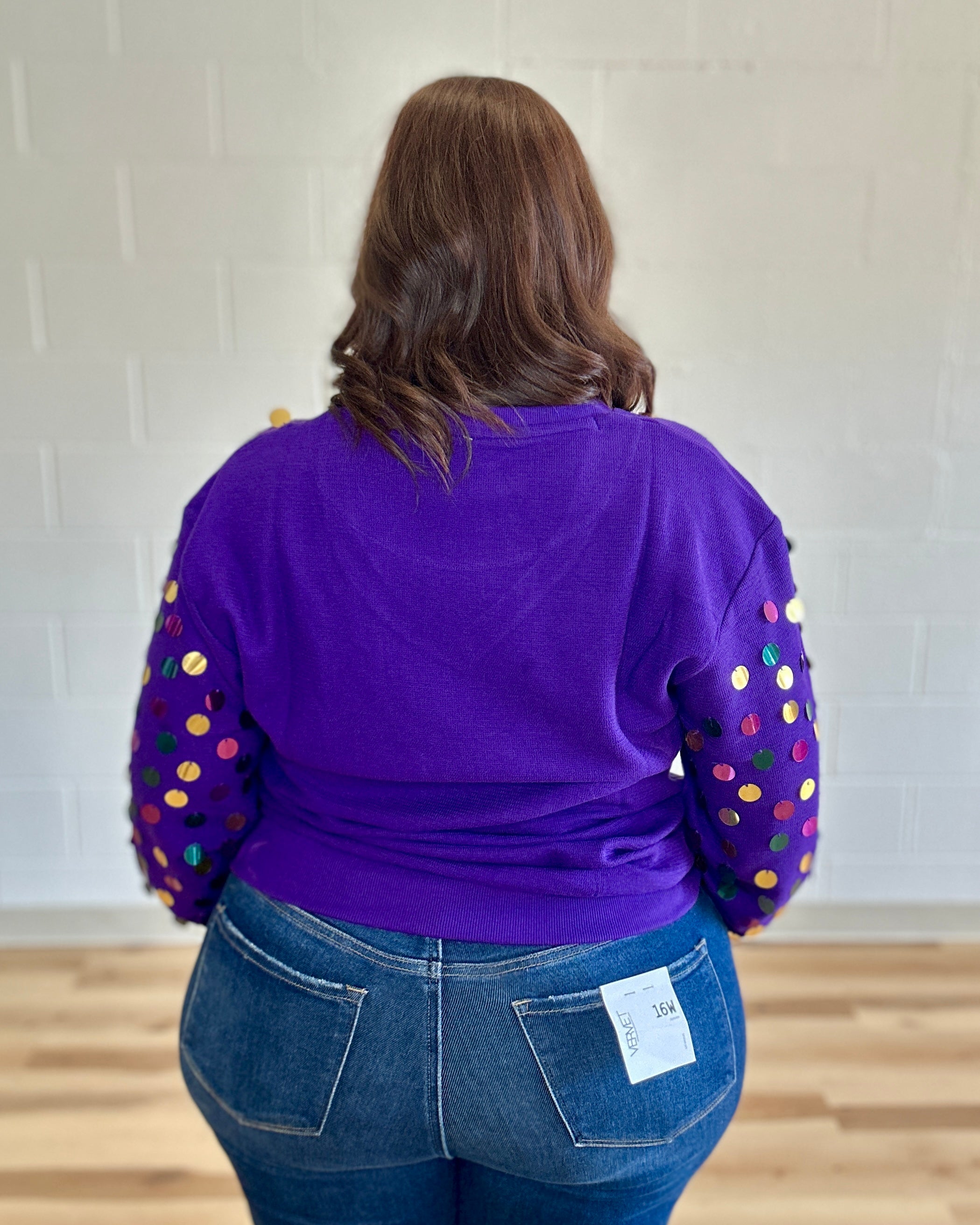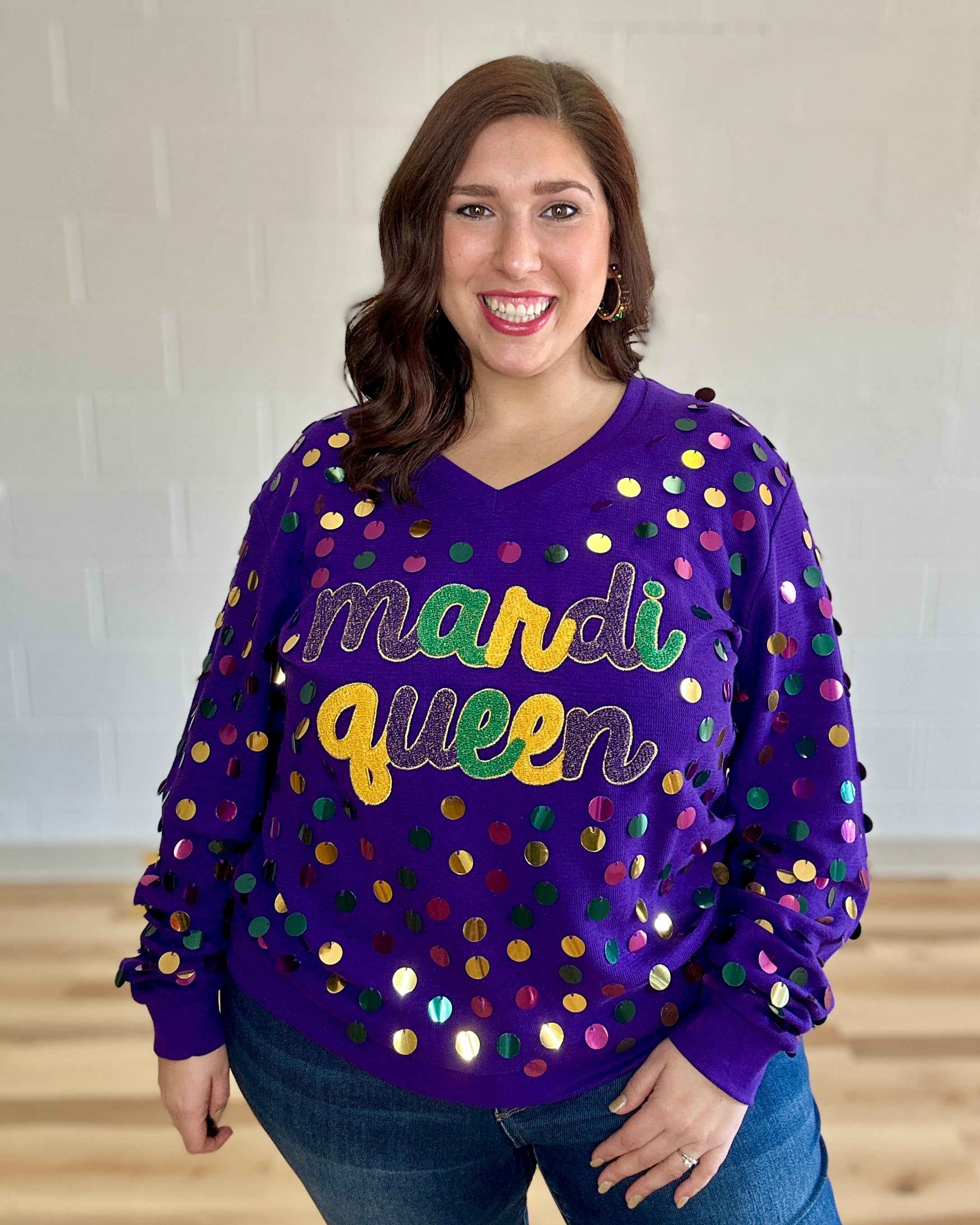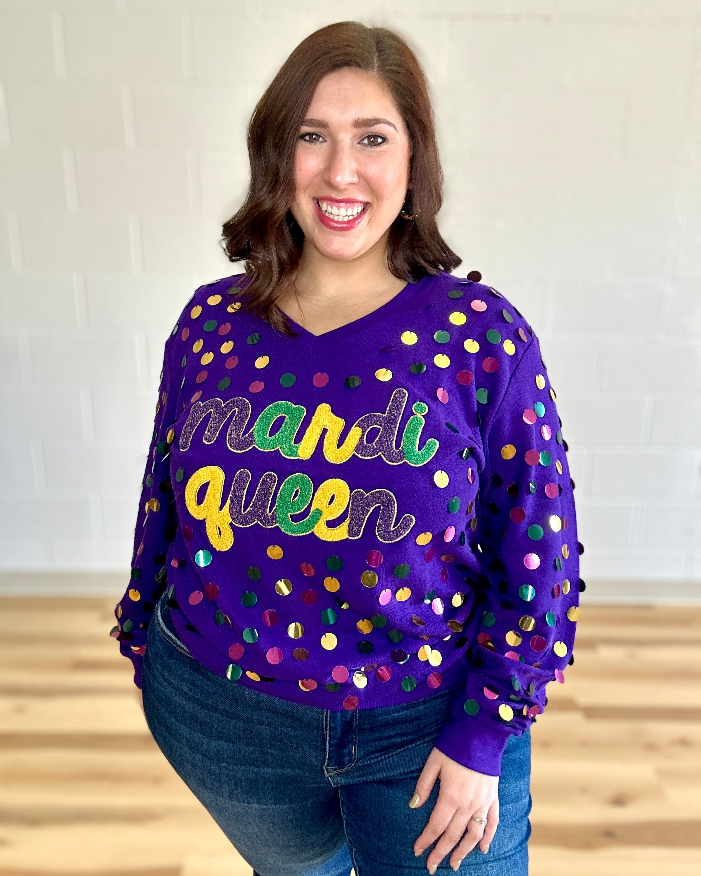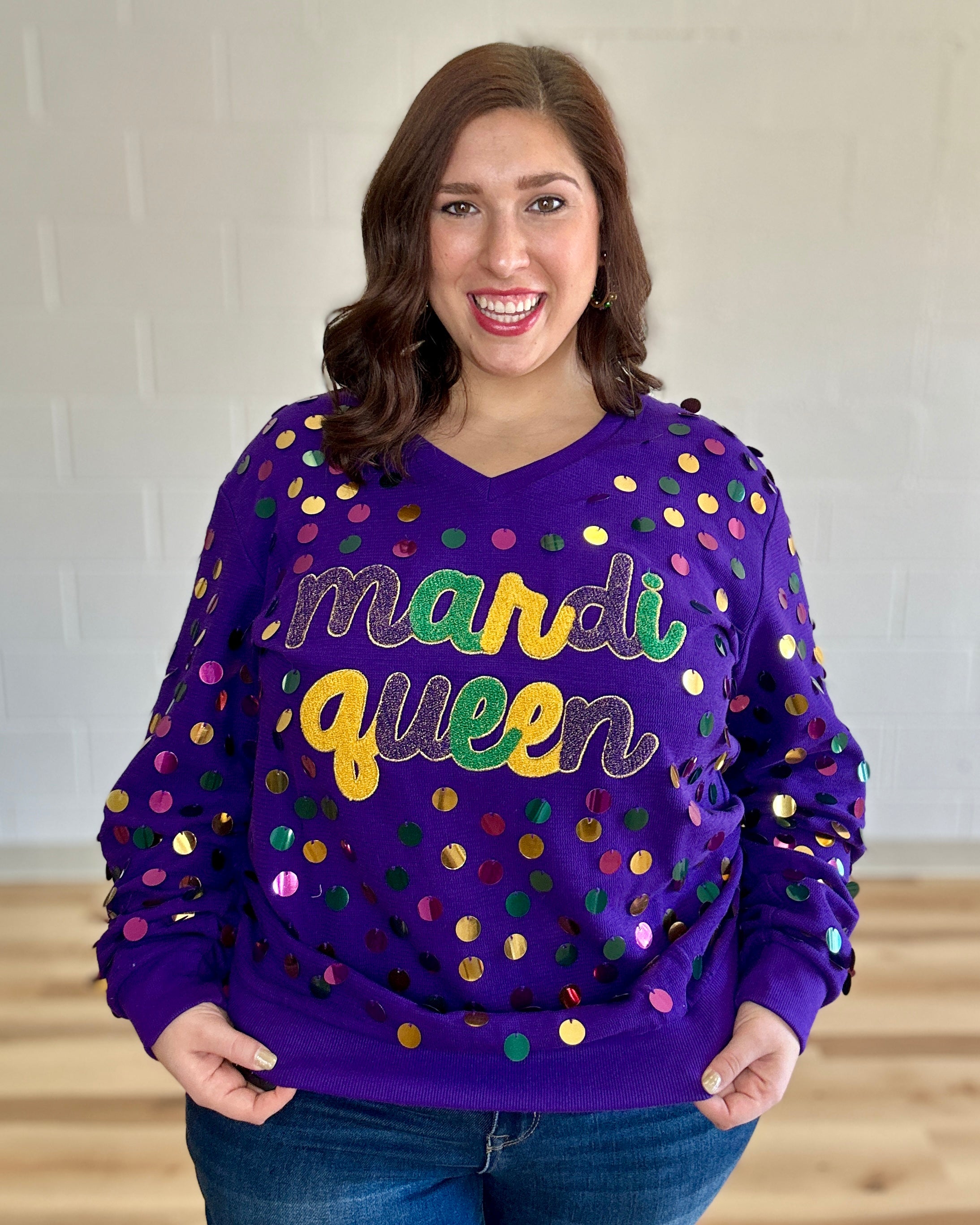 Stay ahead of the carnival crowd in style with the Mardi Queen V-Neck Top in purple. Featuring oversized sequins in purple, green, and gold this fun and flirty pullover is the perfect way to get your shine on, no matter the time of year. Get your vivacious vibes on and snag yourself this sparkly sensation!