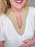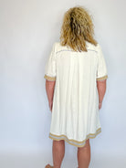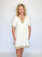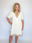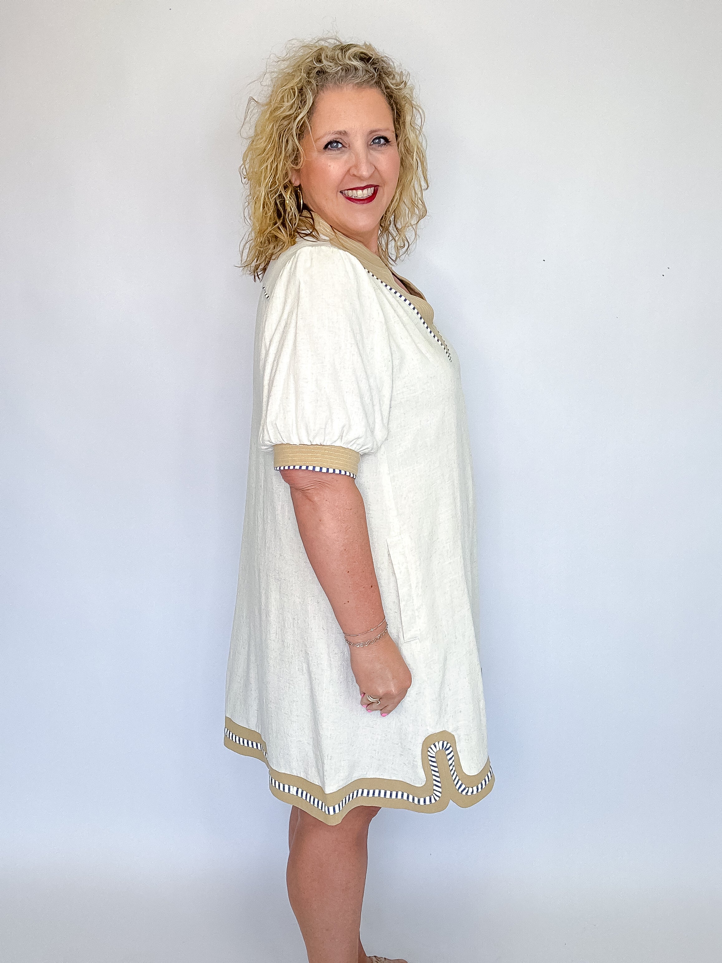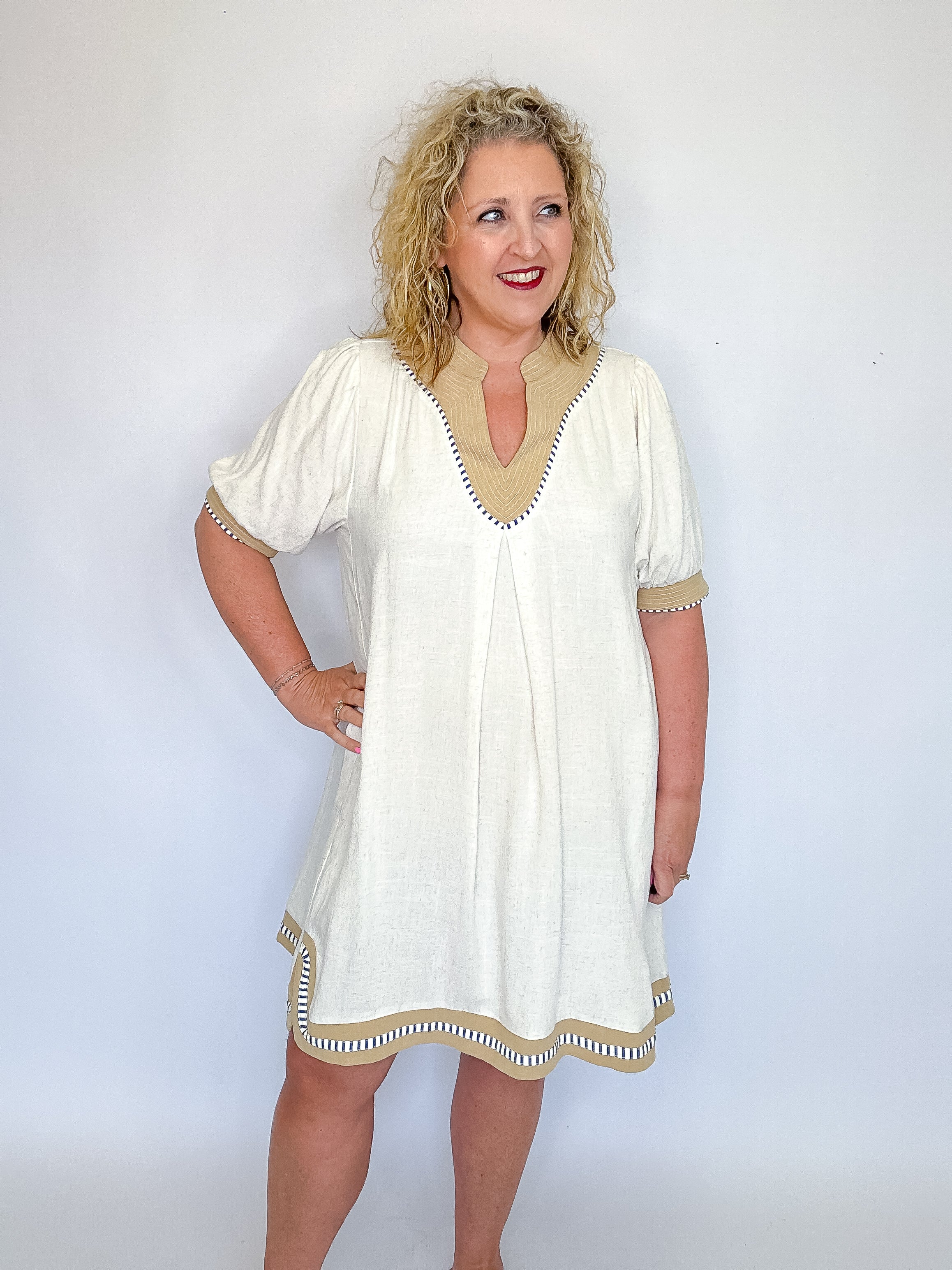 Embrace effortless elegance with this striking linen blend dress that commands attention. The deep V-notch neckline framed by structured contrast trim creates a bold, flattering silhouette, while short puff sleeves add a playful touch of sophistication. Unlined for breathable comfort, this piece transitions seamlessly from day to evening, delivering understated confidence with every wear.