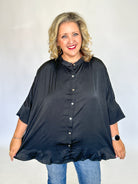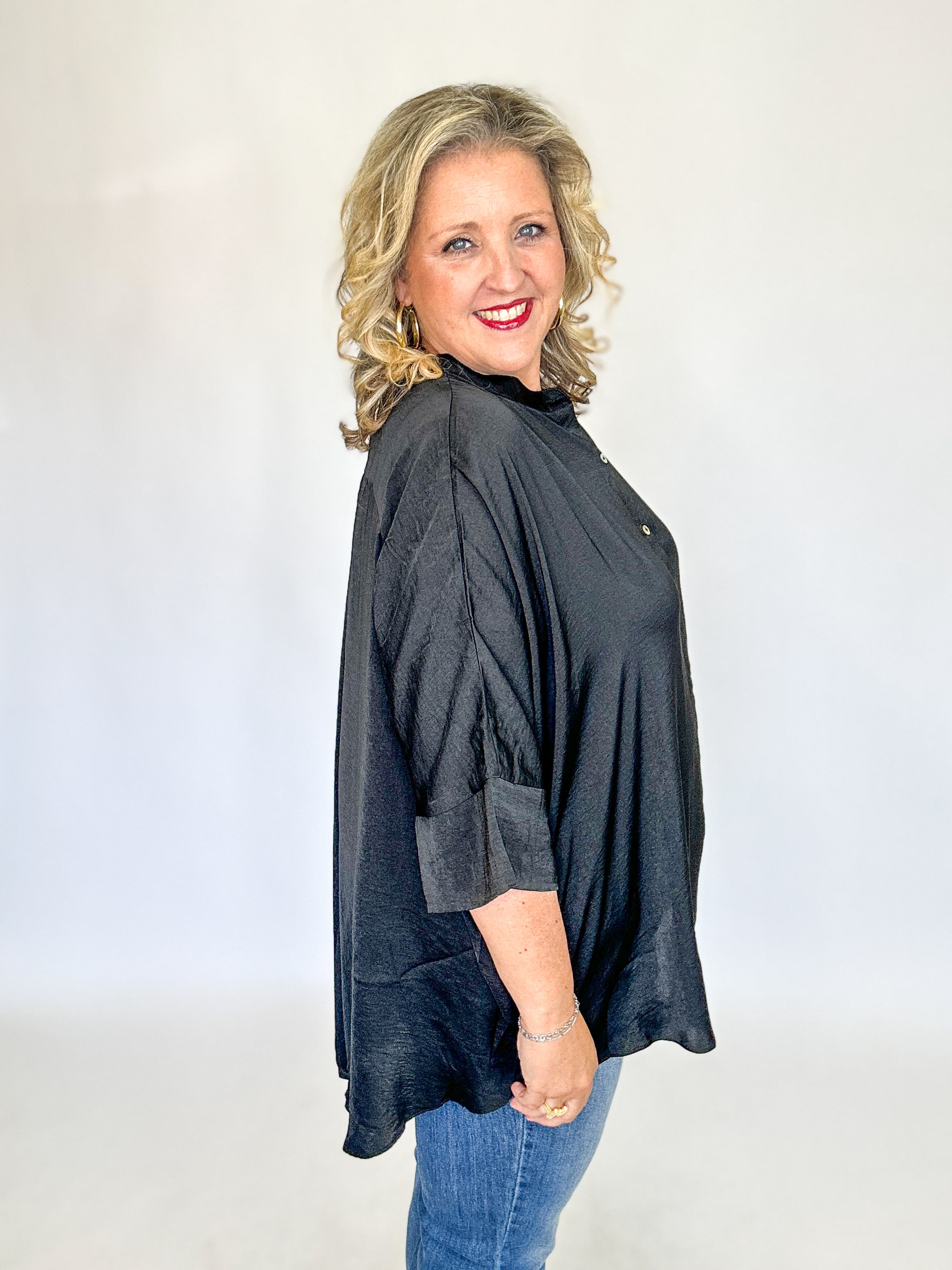 This black hi-lo top is the perfect statement piece for easy, everyday style. Designed with a relaxed, flowy silhouette, it drapes beautifully for a comfortable and flattering fit you’ll reach for again and again.