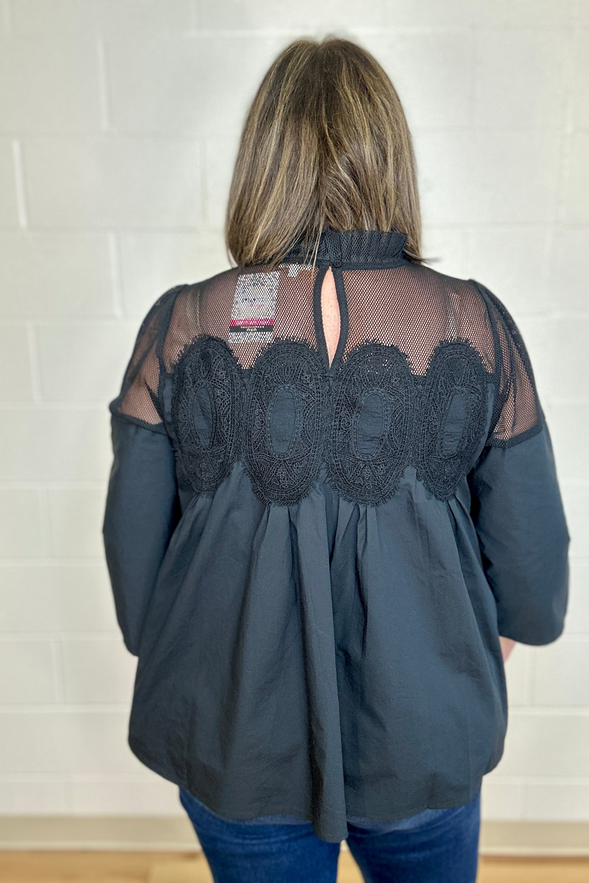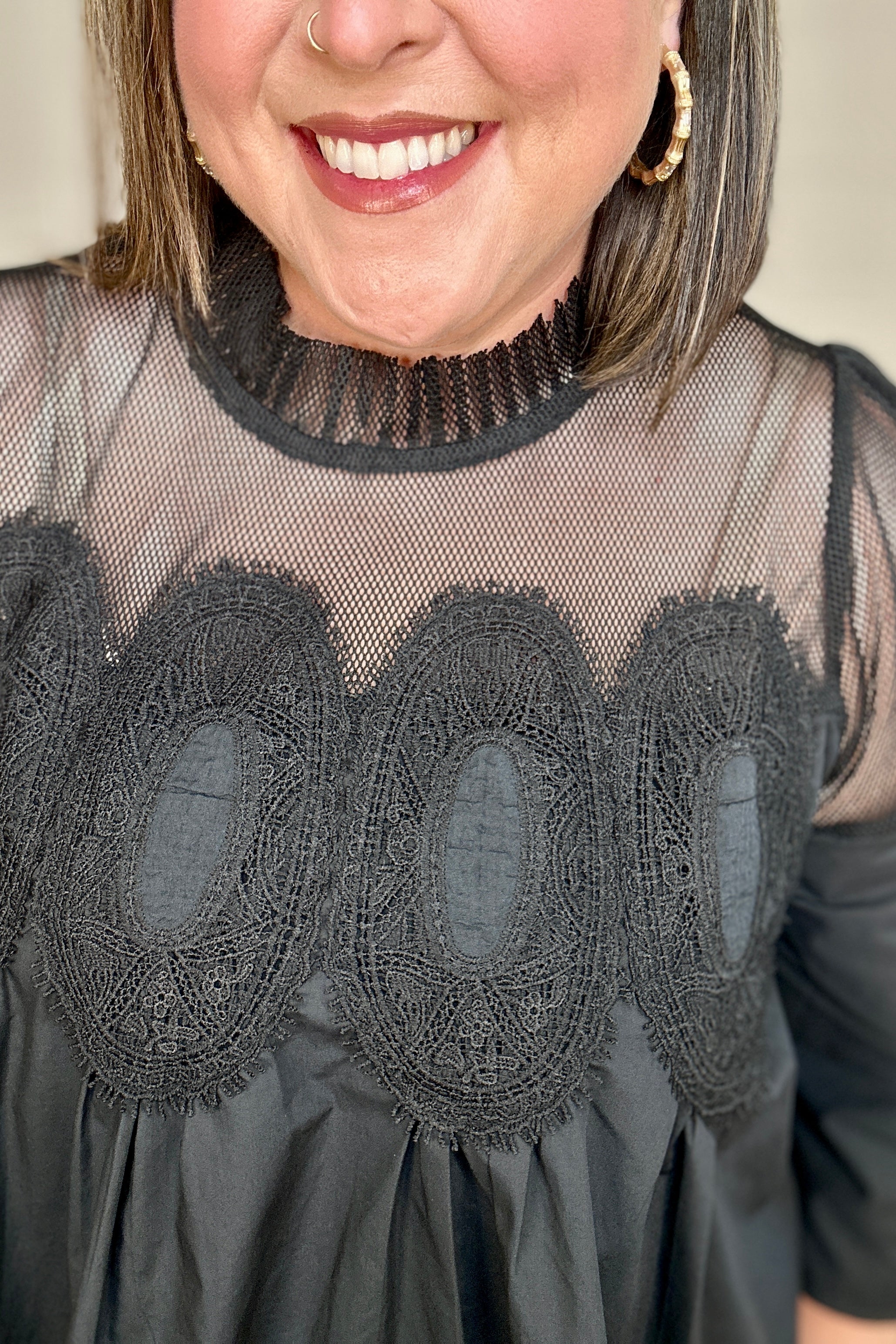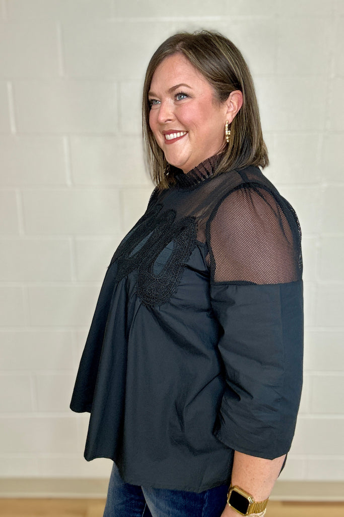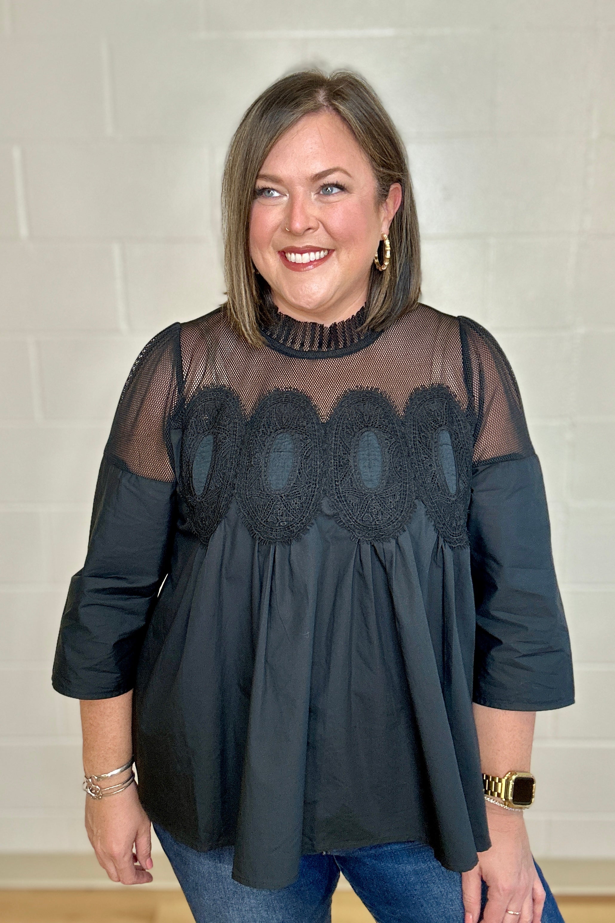 This Black Babydoll Top offers a flattering fit with comfortable 3/4 sleeves. The elegant mesh contrast and delicate crochet accents add stylish detail, while the button closure at the back provides an easy, secure fit. Designed to blend comfort and sophistication, this top supports you in feeling confident and effortlessly chic.