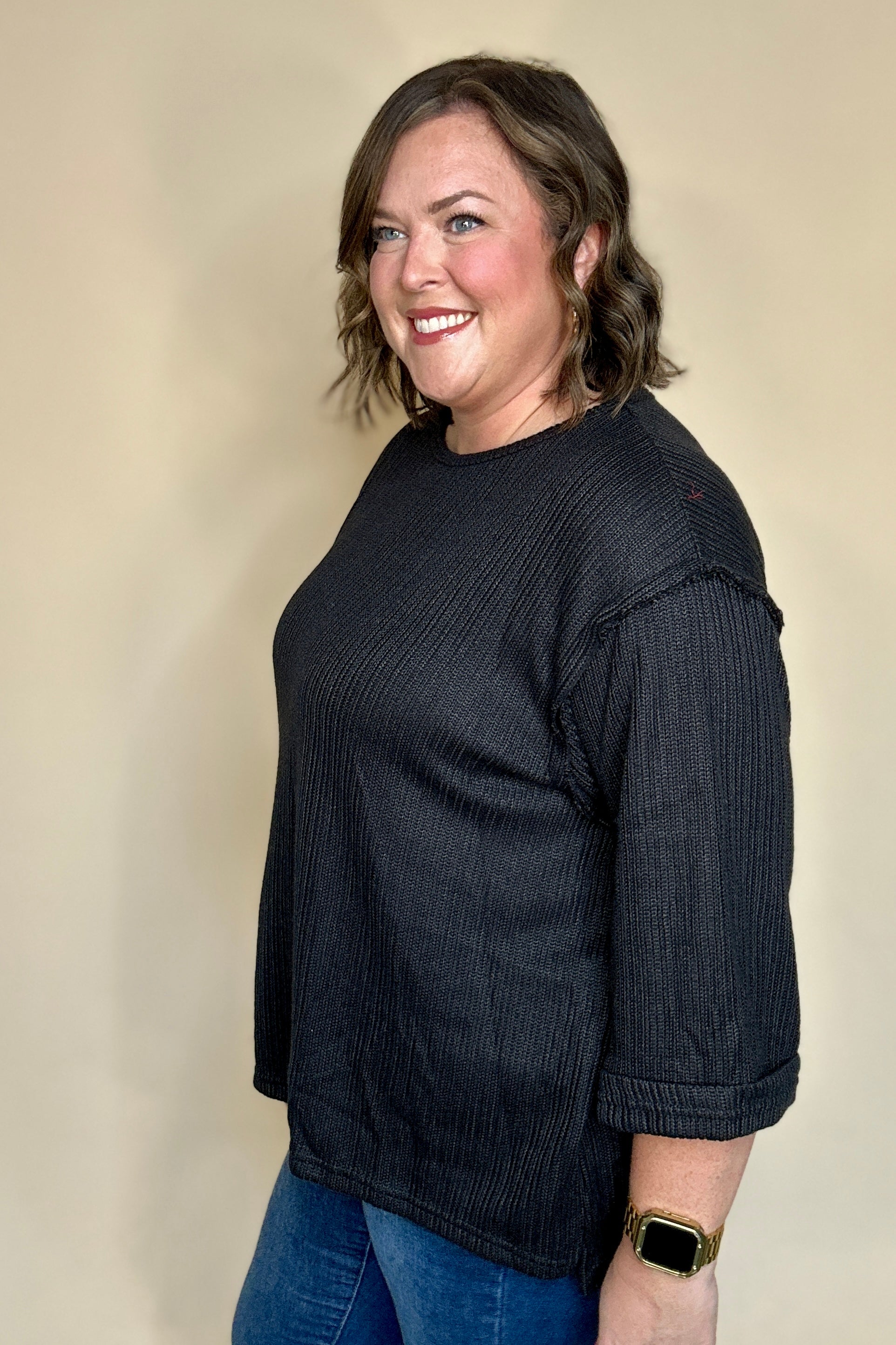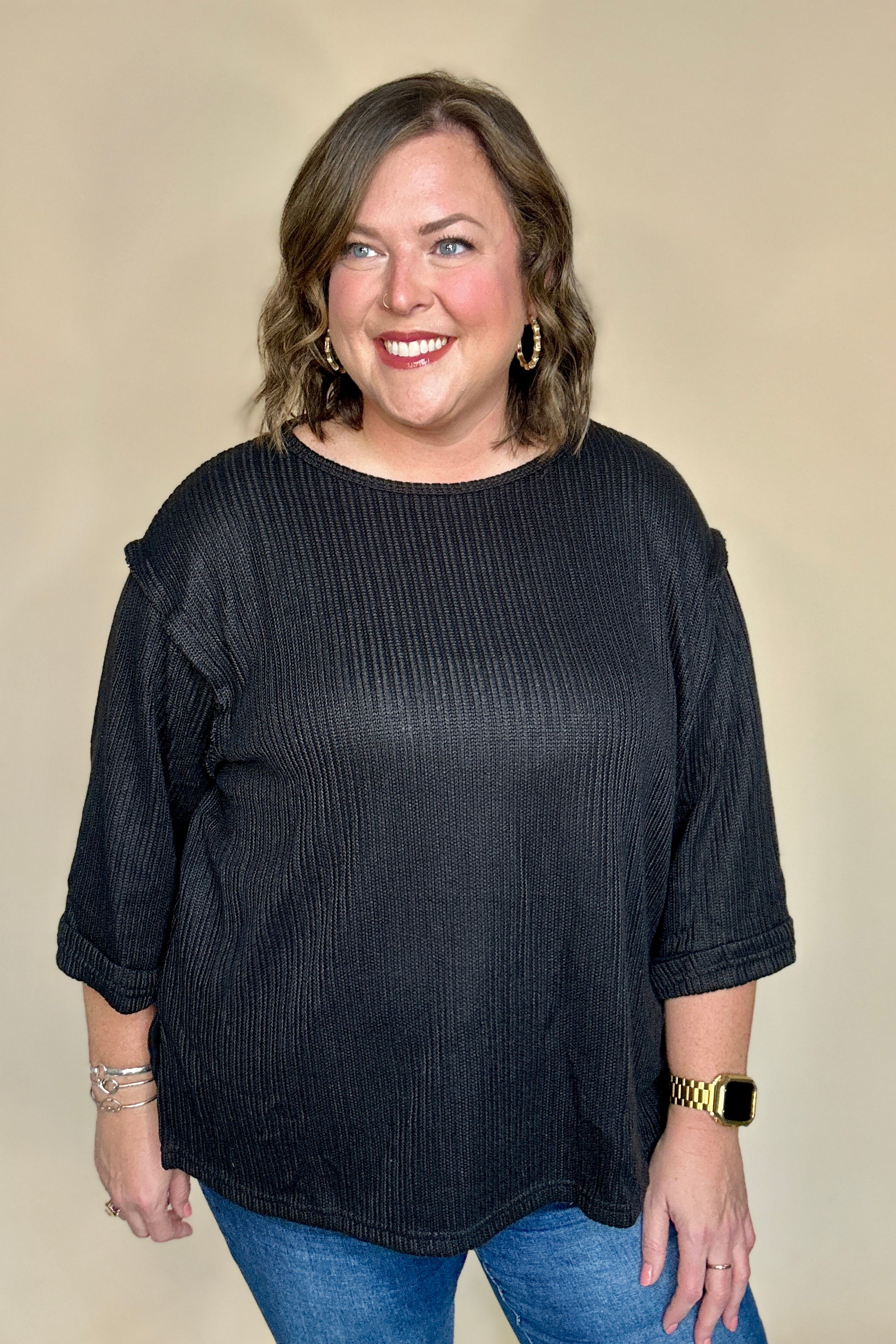 Elevate your everyday wardrobe with this versatile knit top from She+Sky. The signature 3/4 folded sleeves offer a refined silhouette that transitions seamlessly from office to weekend wear. Crafted from quality knit fabric, this piece provides comfortable stretch and breathability for all-day wear. The thoughtfully designed sleeve detail adds visual interest while maintaining a polished, put-together aesthetic. A wardrobe essential that works as hard as you do.