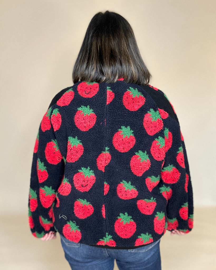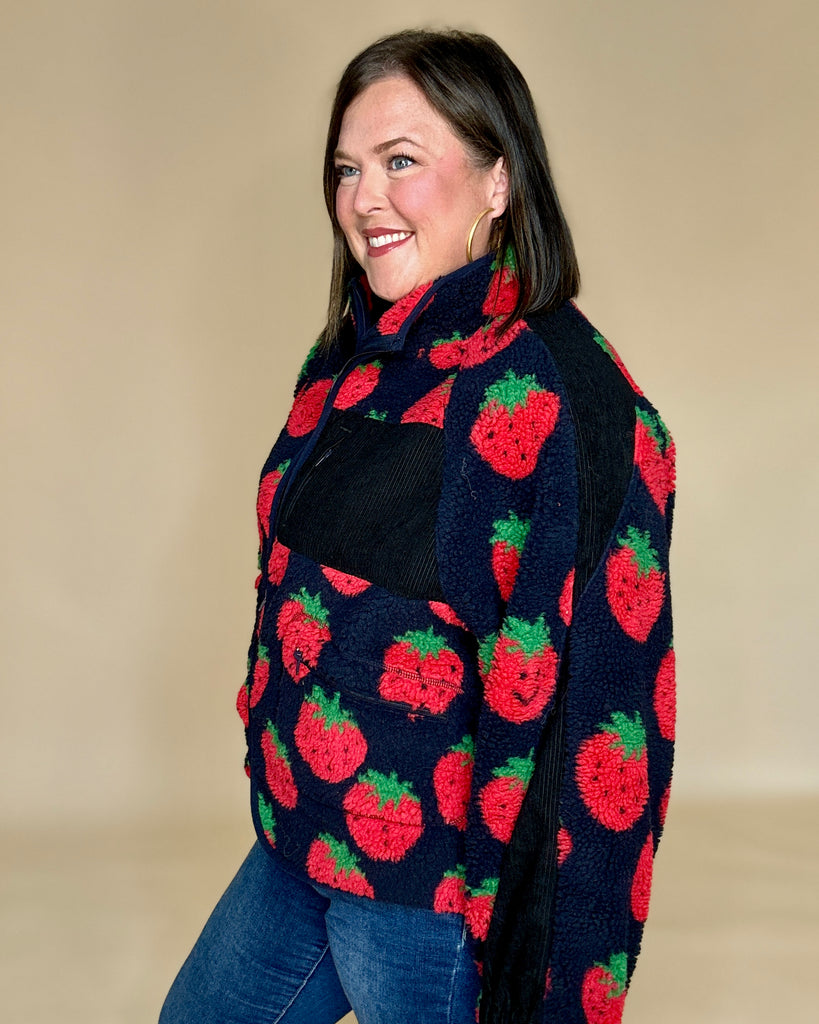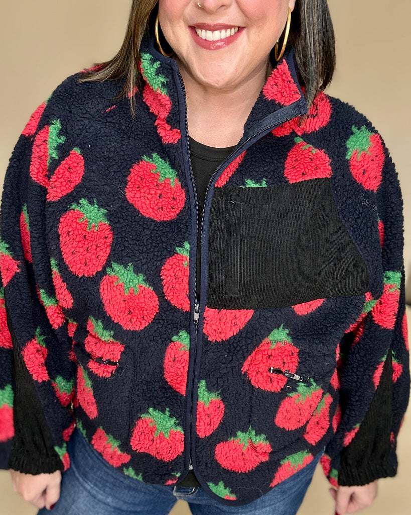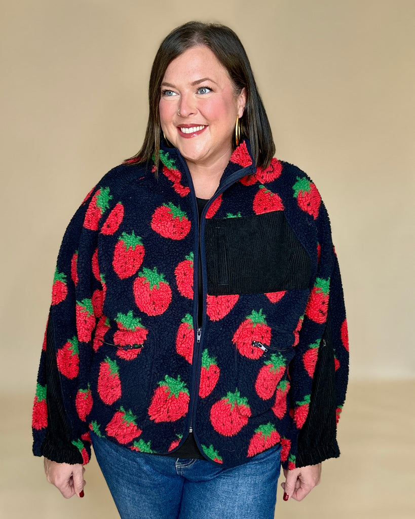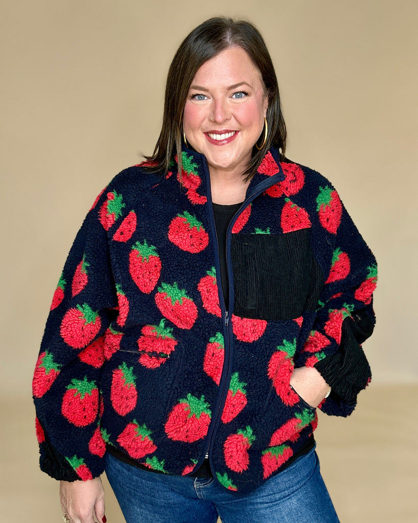 Stay cozy and cute in this Strawberry Print Fleece Jacket by VeryJ. Featuring a playful strawberry pattern, soft fleece fabric, and a classic collar, it’s perfect for adding a fun twist to your chilly days. The zip front opening and zippered pockets keep your essentials secure while making it easy to layer up. Embrace warmth with a splash of sweetness!