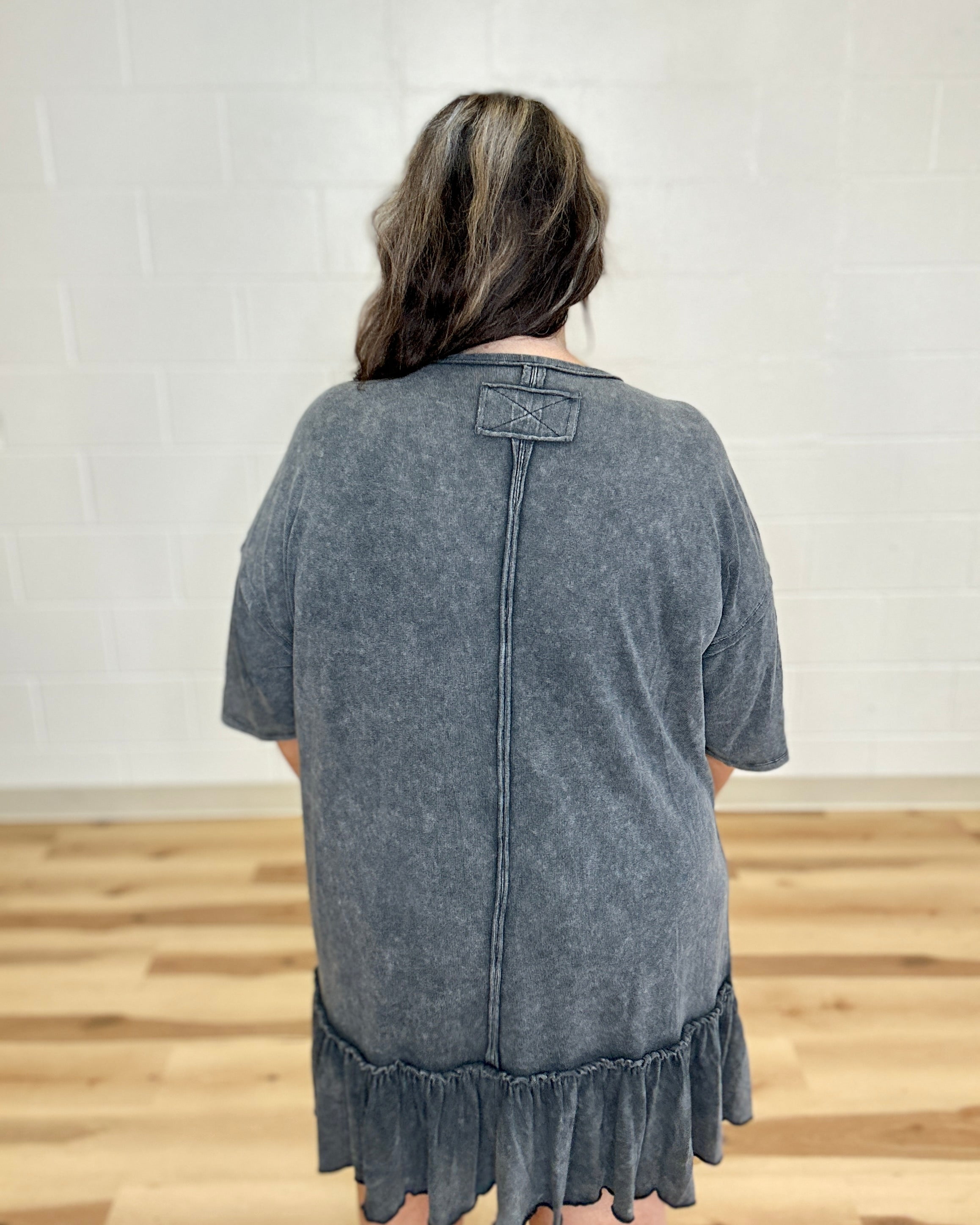 Effortlessly chic, this mineral-washed cotton tunic dress combines casual comfort with refined details. The relaxed silhouette features a rounded neckline and dropped shoulders for an easy, flattering fit. A delicate floral crochet lace patch adorns the front, while a ruffled hemline adds subtle movement and texture. Perfect for layering or wearing solo, this versatile piece transitions seamlessly from day to evening.