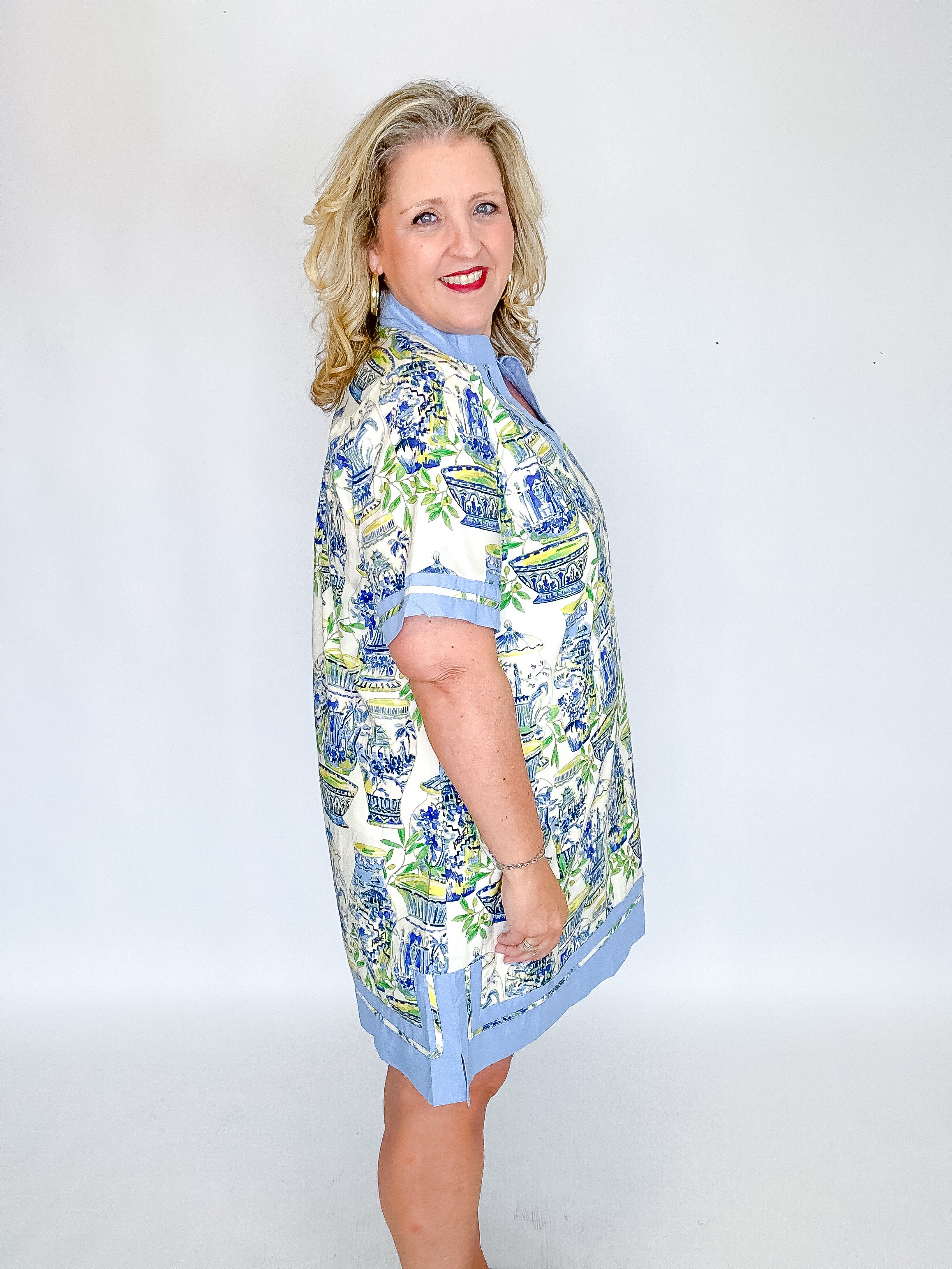 Serving statement style with a splash of charm. This peachy beauty is giving European garden party vibes in the best way. Featuring a playful blue and green chinoiserie porcelain-inspired print, this dress feels like a stroll through a Mediterranean market. The contrast blue neckline and trim add the perfect tailored touch, while the split V-neck with layered detail keeps it polished yet effortless.