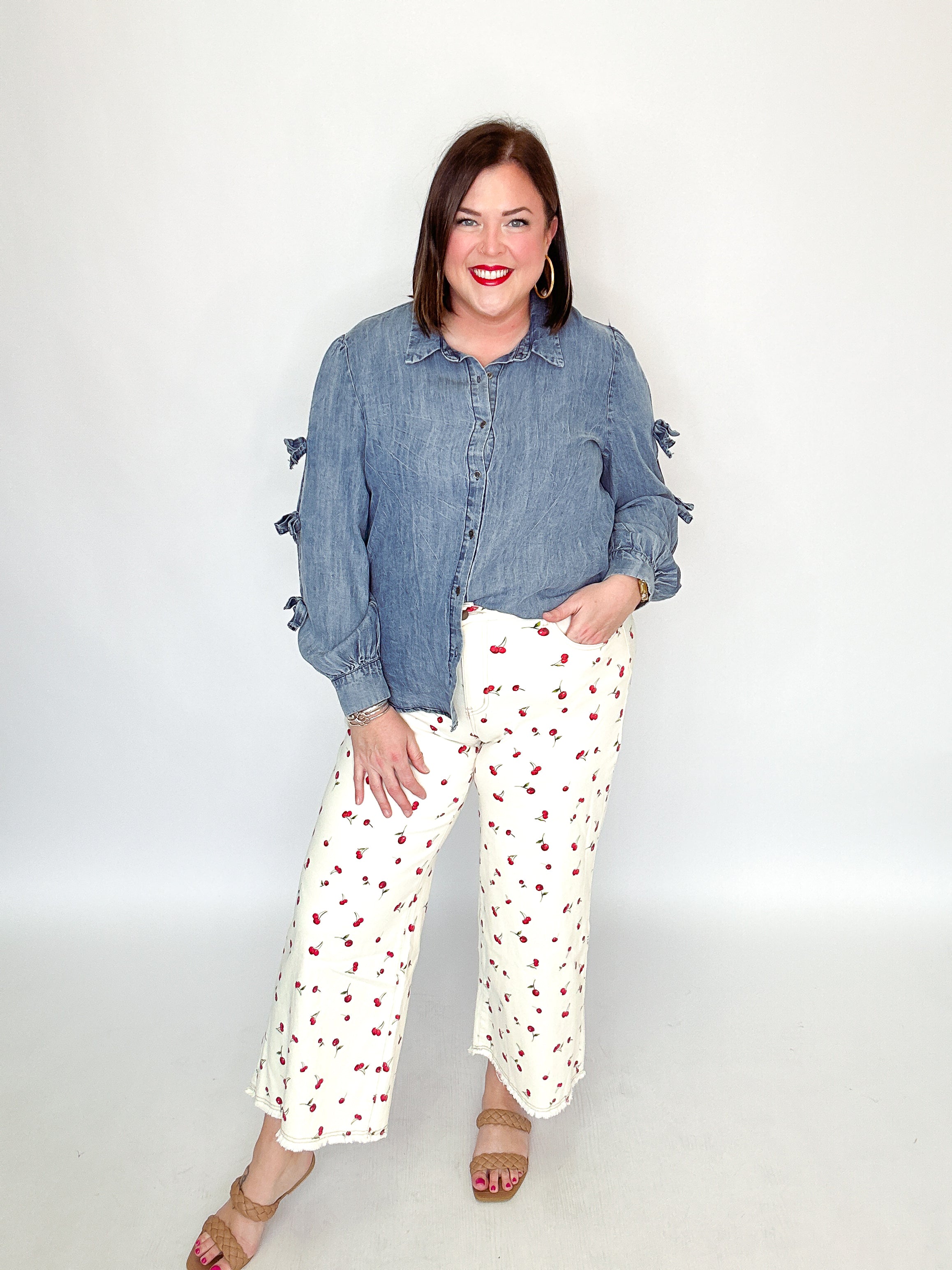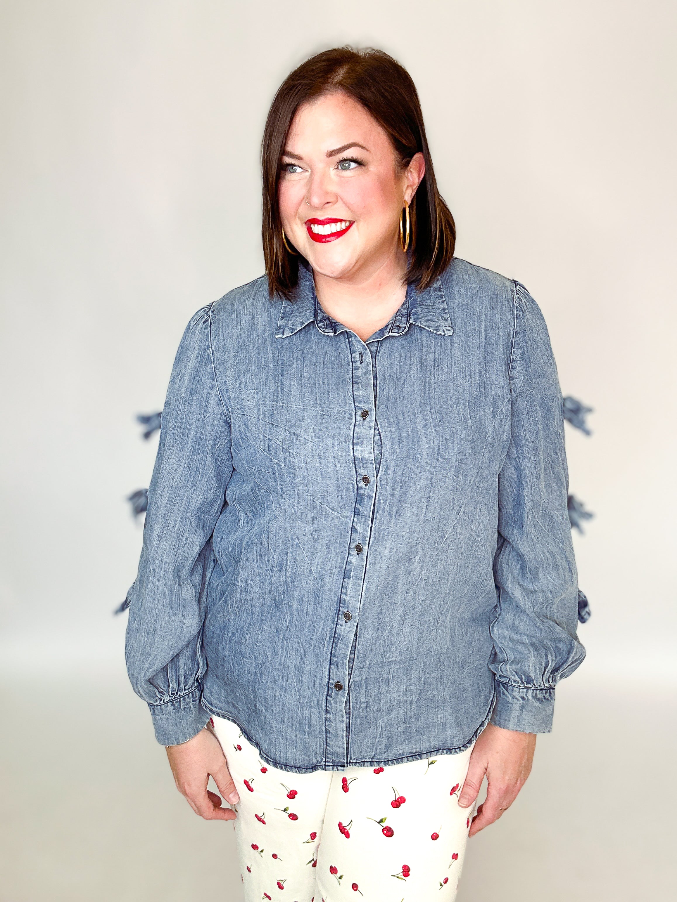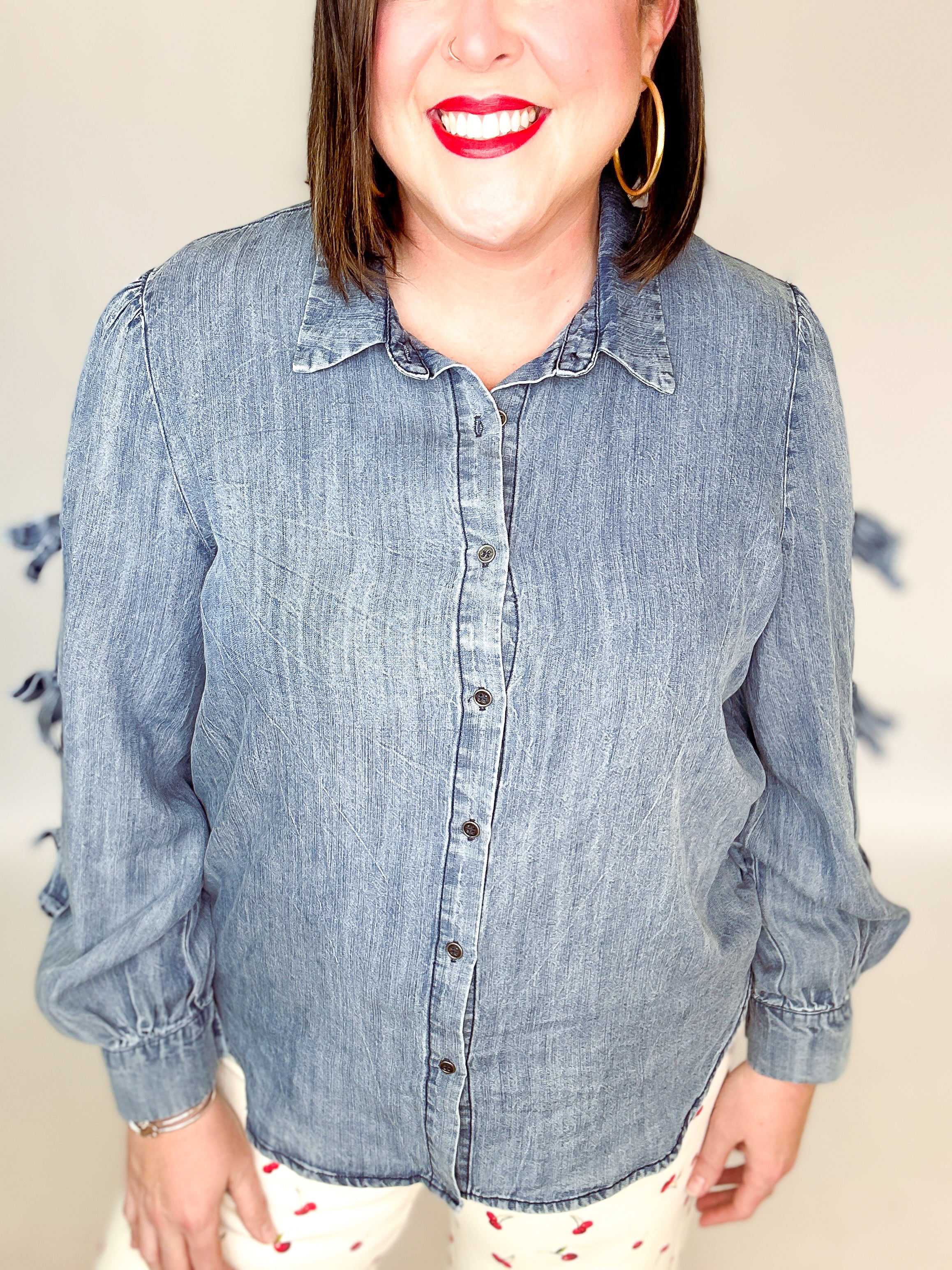Effortless charm meets casual cool in this washed denim top from Easel. Featuring a crisp collared neckline and playful self-tie bows adorning the sleeves, it's designed for relaxed, easy-going style. The button-down front and loose fit make it perfect for layering or wearing solo—a versatile piece that transitions seamlessly from weekend brunch to laid-back office vibes.