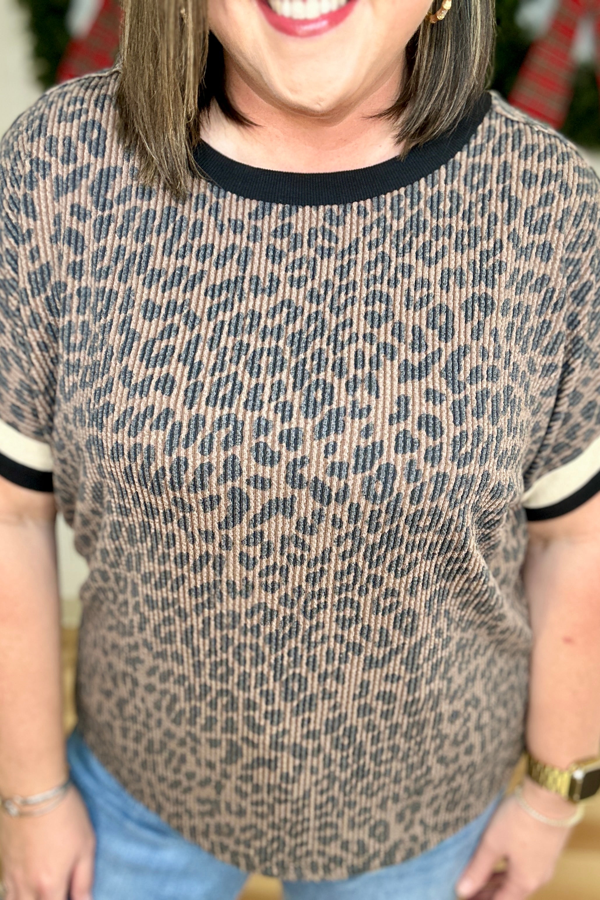 Embrace your wild side with this textured leopard printed knit top from Oddi. Crafted from soft, breathable knit fabric, it features an eye-catching leopard print that adds instant personality to any outfit. The contrast rib neckline and sleeve bands provide a polished, structured finish that keeps the look refined and put-together. Perfect for layering or wearing solo, this short sleeve style transitions effortlessly from casual days to weekend adventures. A versatile piece that celebrates your confidence and individual style.