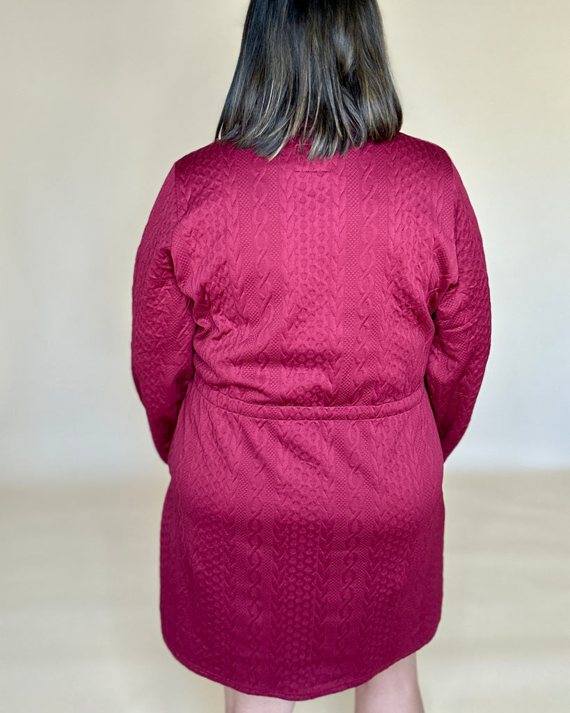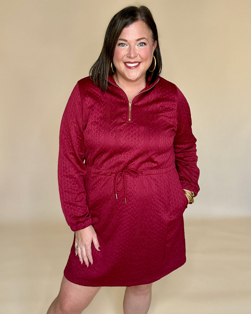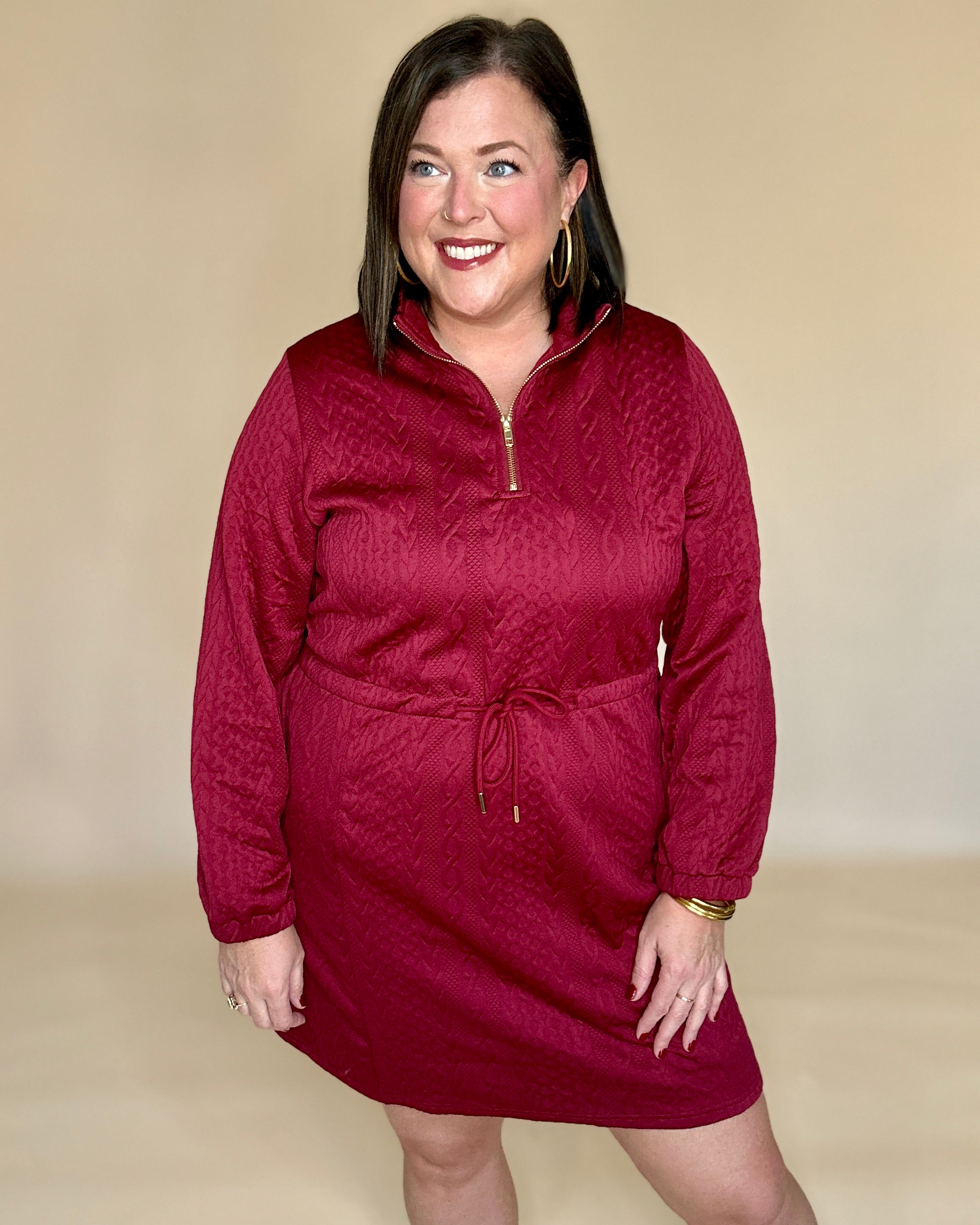 Elevate your wardrobe with this Burgundy Half Zip Textured Dress from Umgee. Featuring a quarter-zip high collar and long sleeves, it combines comfort with refined style. The scalloped detail and intricate cable knit add subtle texture and sophistication, making it perfect for both casual and dressier occasions. Designed without lining for a lightweight feel, this dress offers effortless elegance in a rich burgundy hue.