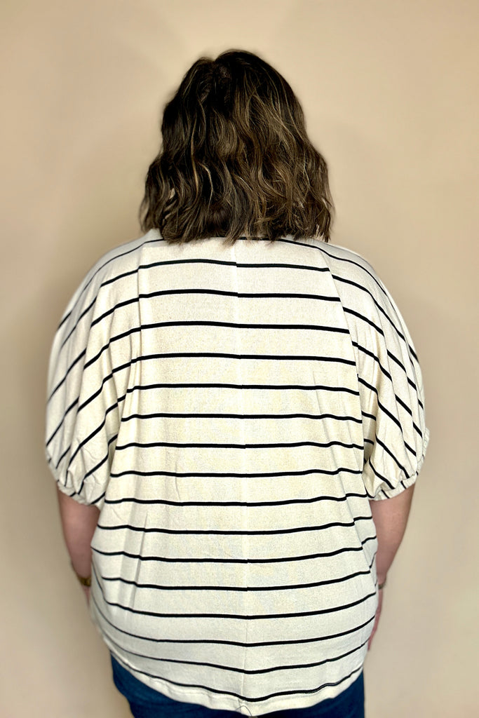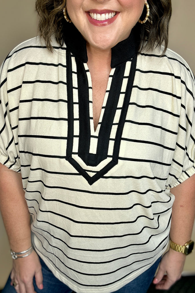 This lightweight, striped short dolman sleeve top by Entro combines comfort and style effortlessly. Featuring a contrast trim split V-neck and elasticated sleeve openings, it offers a flattering fit without compromising ease of movement. Made from non-sheer knit fabric and unlined for breathable wear, it’s perfect for layering or wearing on its own during warmer days. Elevate your casual wardrobe with this versatile piece that balances relaxed fit and chic detailing.