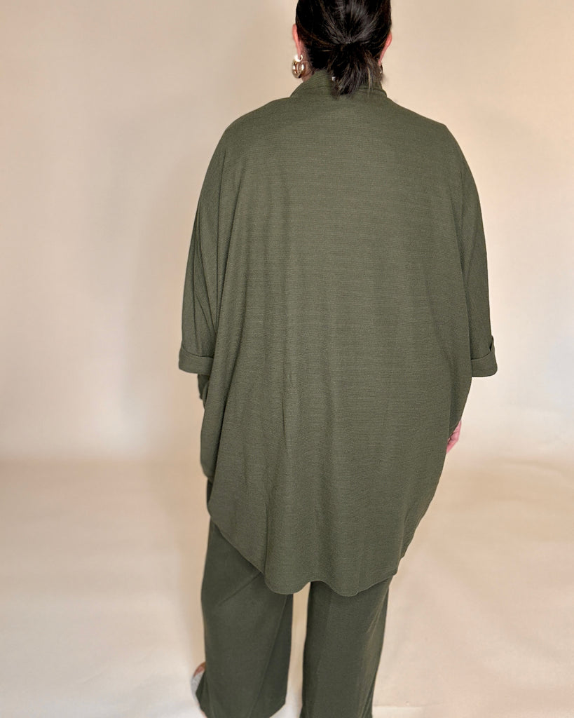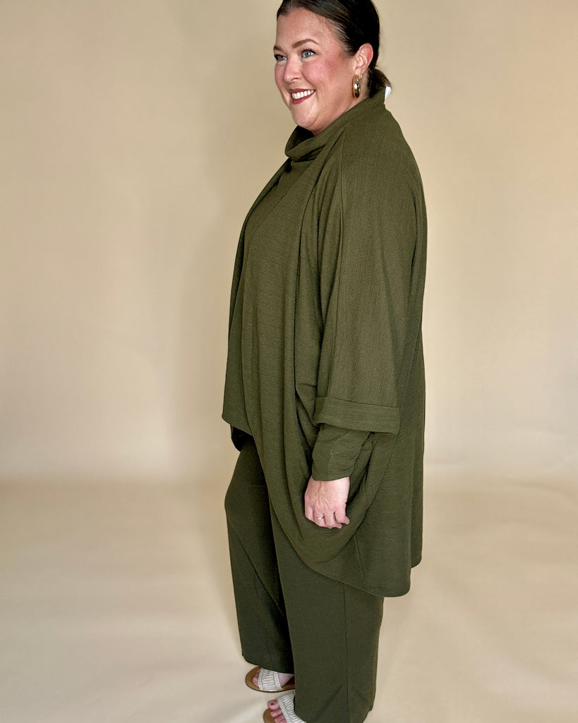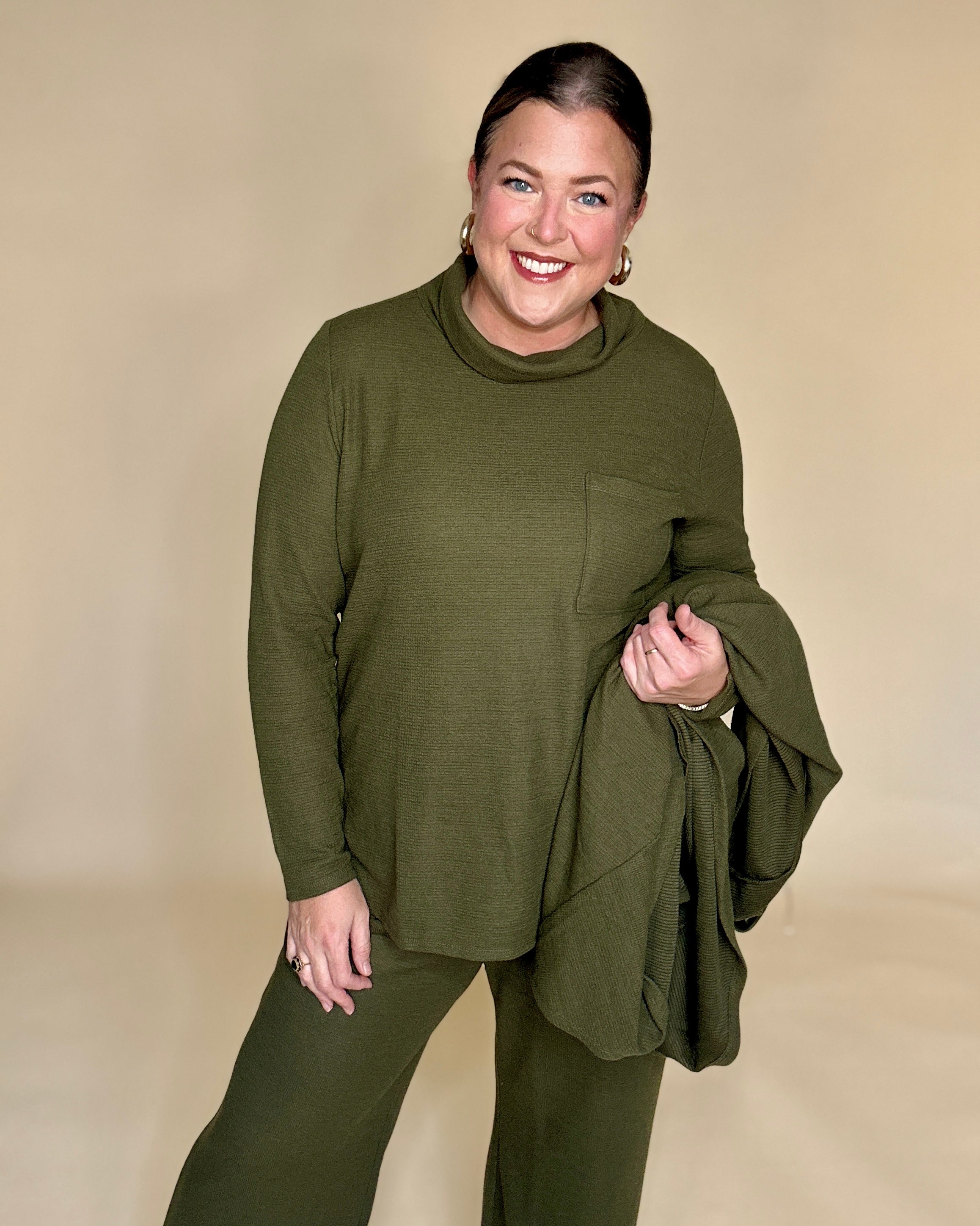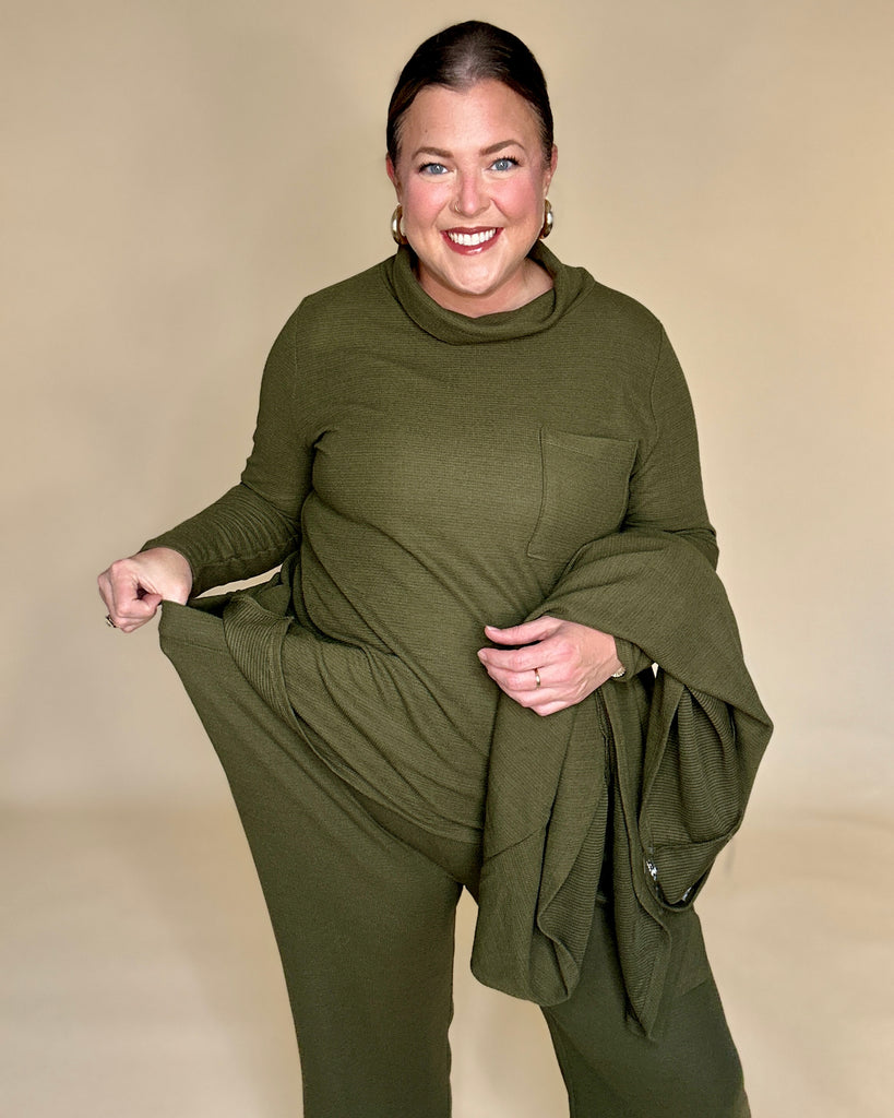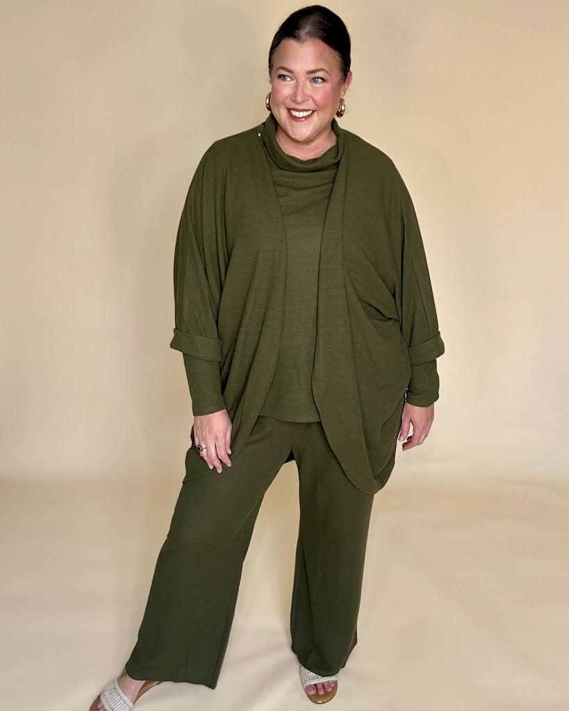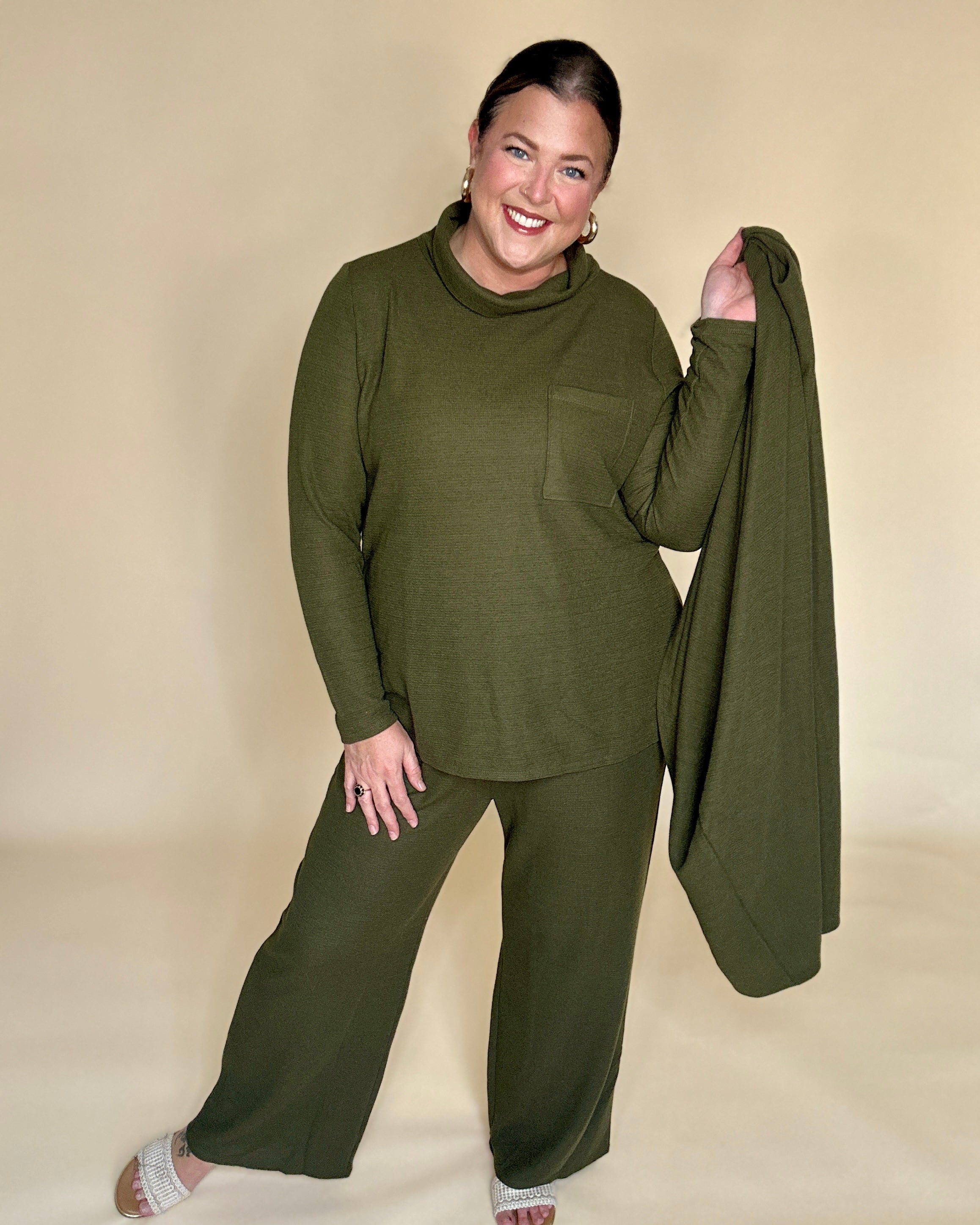 This dark olive 3-piece set from Dear Scarlett brings cozy vibes with playful charm. Featuring a long sleeve top with side slits, a cowl neckline, and a handy chest pocket, paired with a breezy open-front cardigan with side pockets, plus wide-leg bottoms with an adjustable drawstring waist and extra pockets. Made from an ultra-soft waffle knit blend of 96% polyester and 4% spandex, it’s perfect for lounging in style or casual adventures. Comfortable, versatile, and ready to brighten your day!
