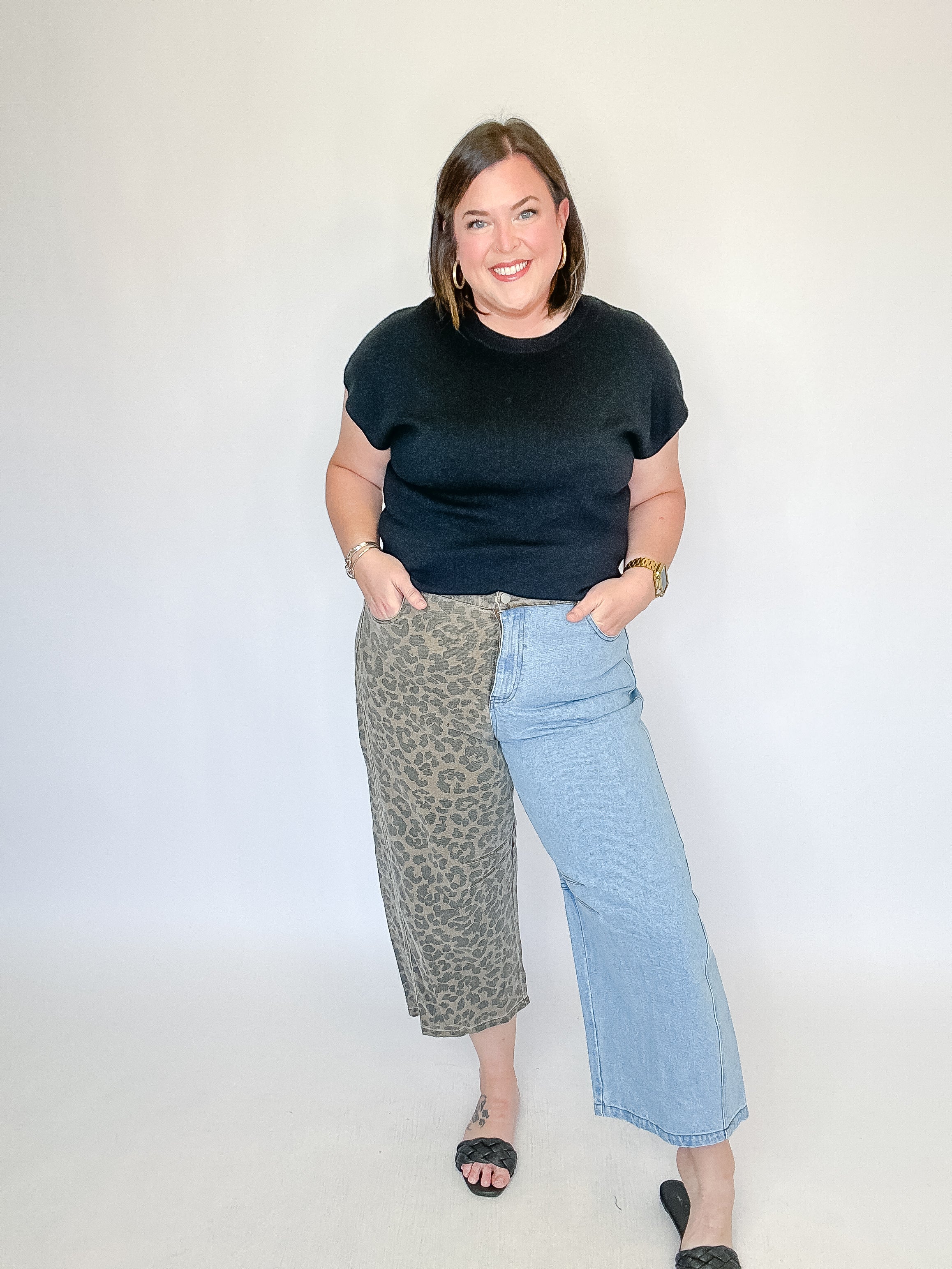 These statement jeans feature a bold split design that mixes classic denim with a striking leopard pattern panel for an instant edge. The wide-leg silhouette offers a relaxed, easy fit while still making a high-impact style statement. Finished with functional pockets and a comfortable waistband, they’re perfect for adding personality to any casual look.