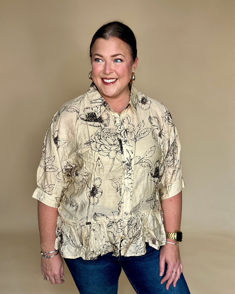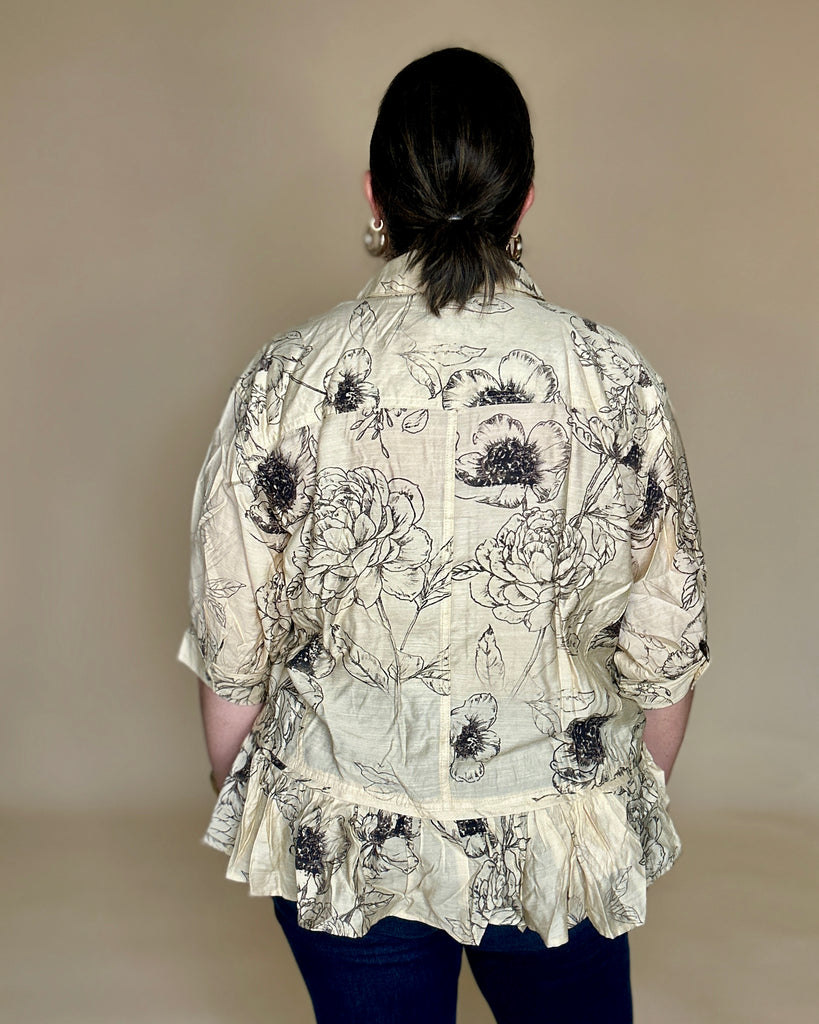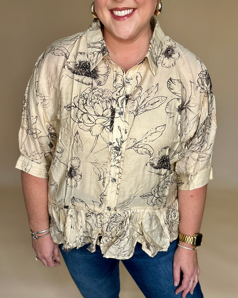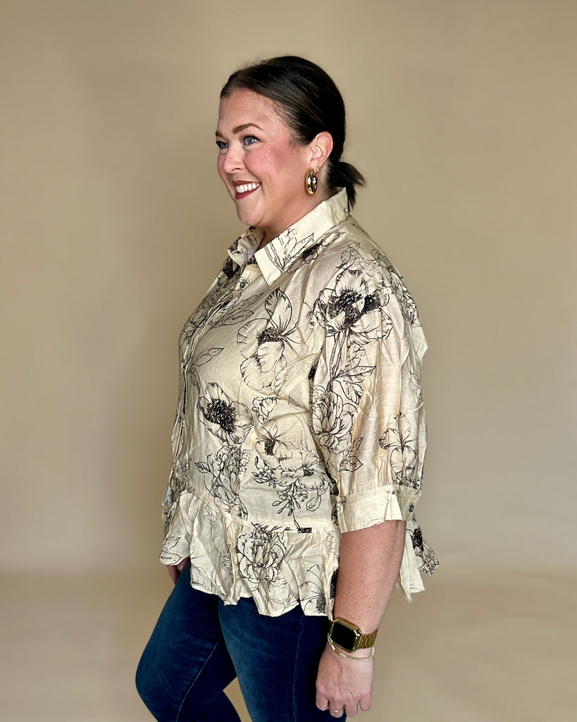 Add a splash of whimsy to your wardrobe with this floral print top from Entro. The 3/4 roll-tab sleeves and ruffle hem bring playful charm, while the high-low design adds a fun twist to your look. Lightweight and non-sheer, it’s perfect for breezy days, and the button closures at front and cuffs keep it effortlessly stylish. Unlined for comfort, this woven top is your new go-to for vibrant, easygoing vibes.