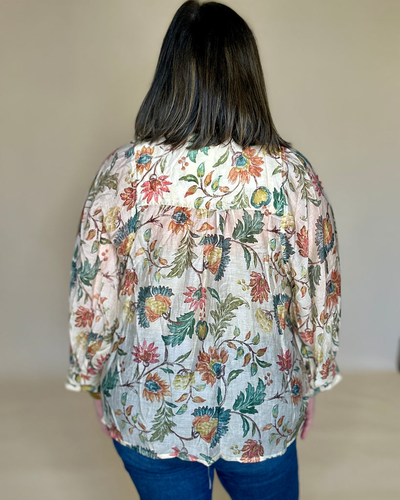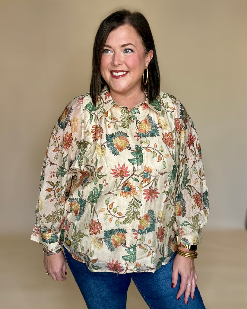 This elegant long sleeve button-down top from Entro showcases a delicate floral print and a refined woven fabric that is lightweight yet opaque. Featuring dropped shoulders and buttoned cuffs, it offers a relaxed yet polished silhouette. The fully lined construction ensures comfort and a smooth fit, while the classic button closure adds a timeless touch. Perfect for sophisticated daytime or evening wear.