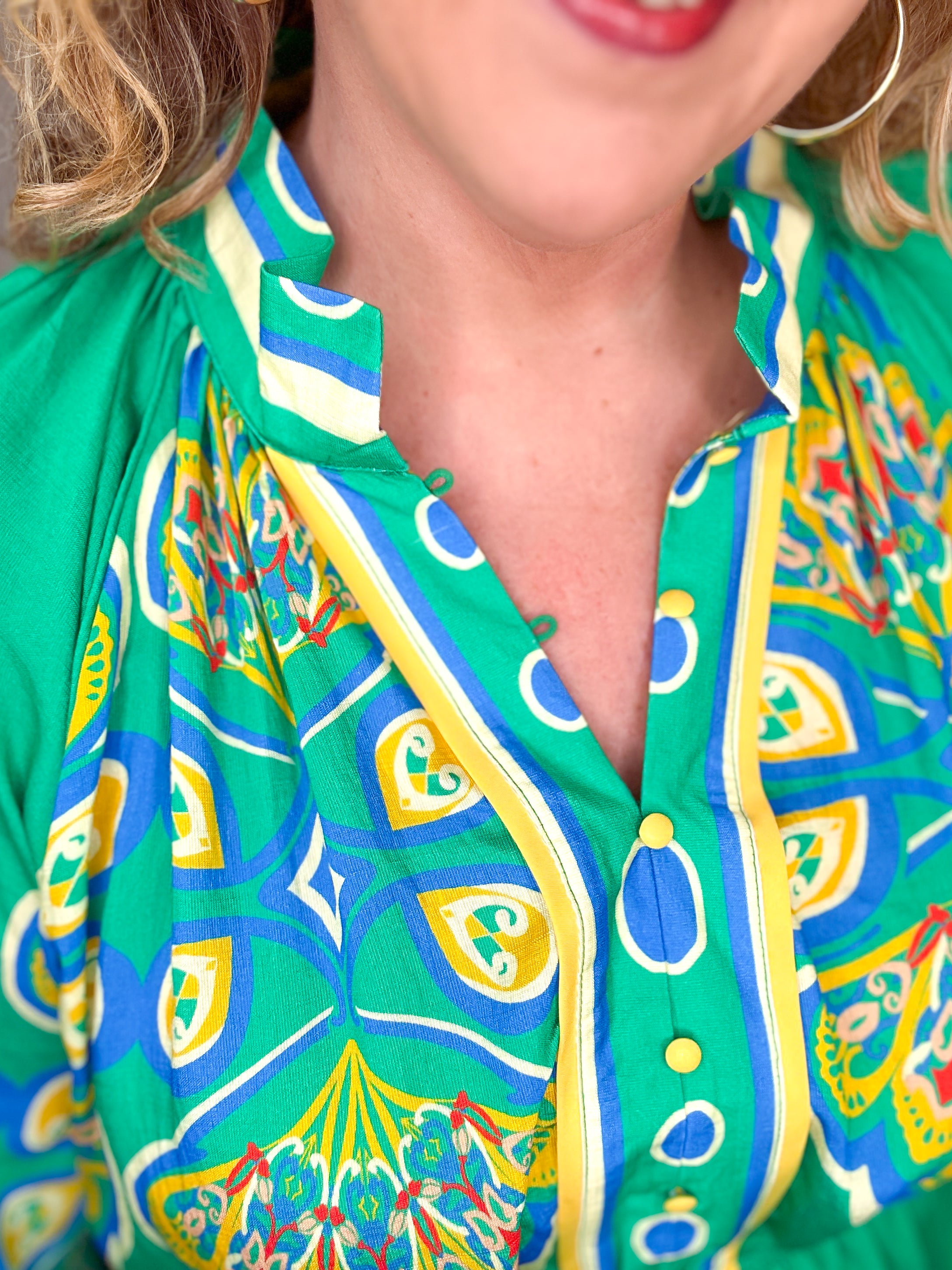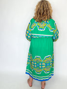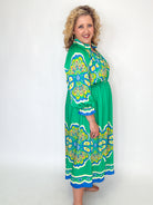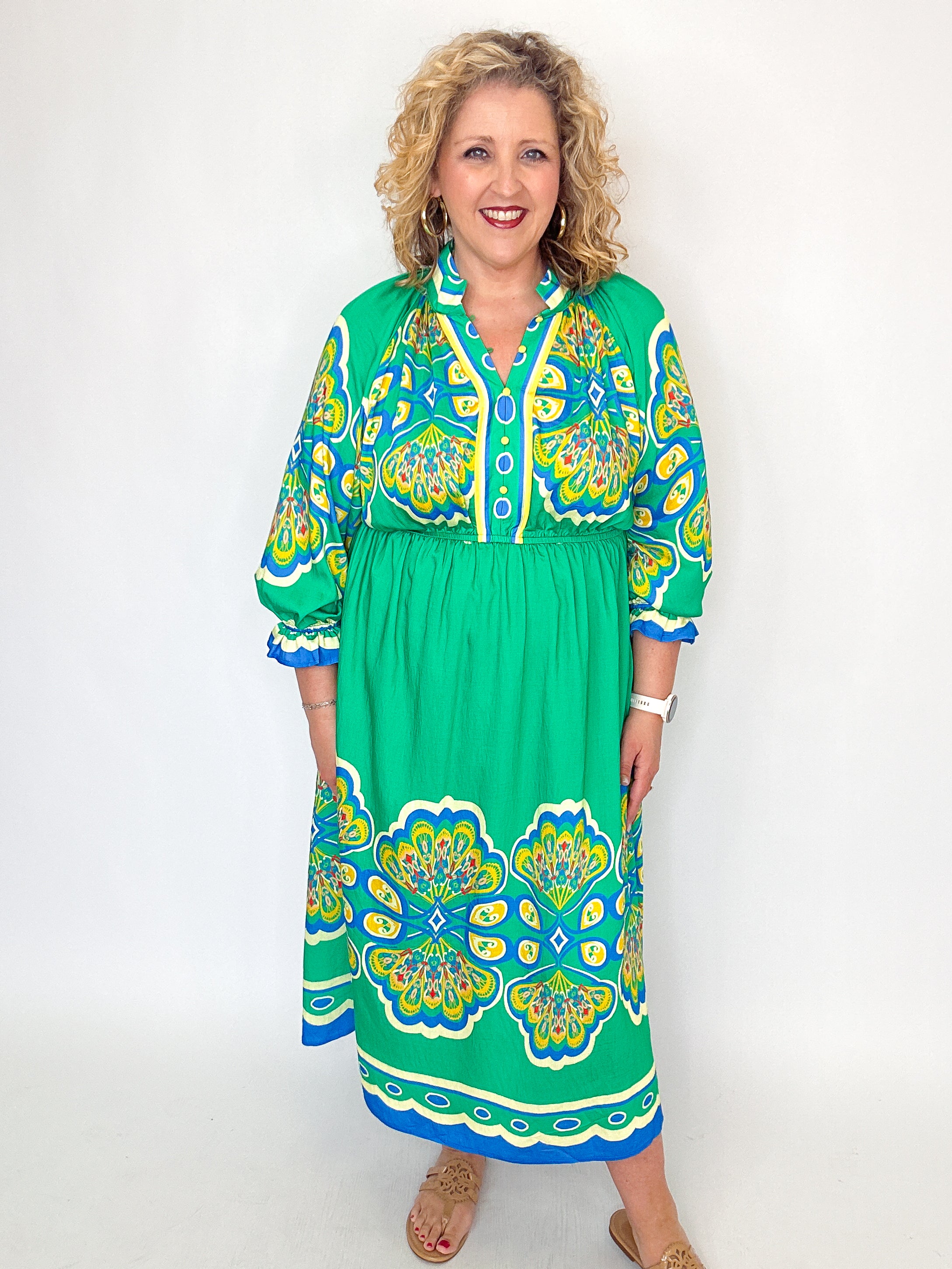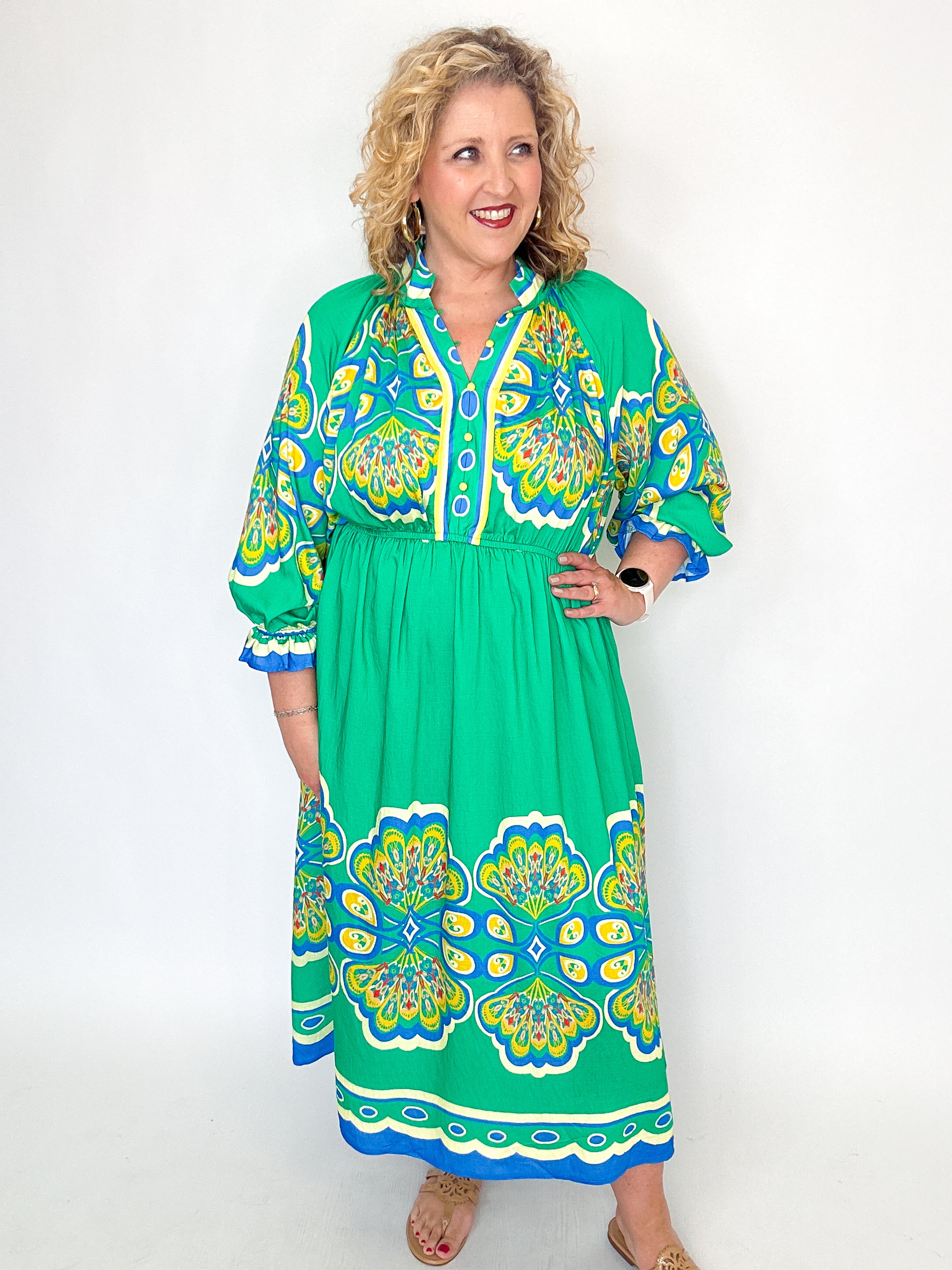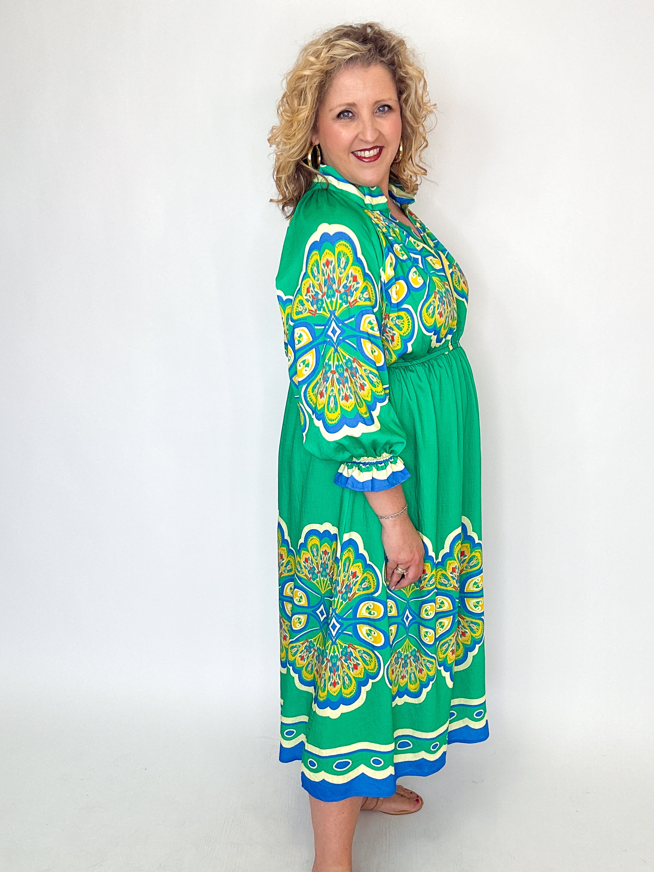 Twirl into elegance with this stunning plume border midi dress. The high stand V-neck with open collar creates a chic, effortless look, while long sleeves adorned with delicate ruffles add a touch of whimsy. An elastic waistband hugs you in all the right places for comfort and confidence, and the lined skirt ensures smooth, graceful movement. Perfect for brunch dates, garden parties, or whenever you want to feel fabulous.