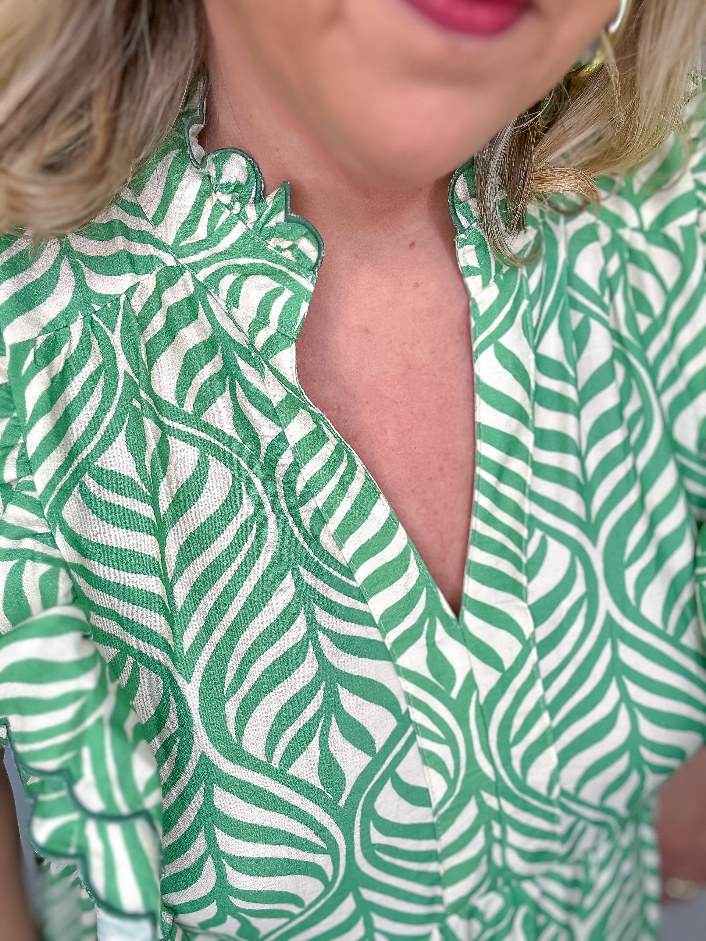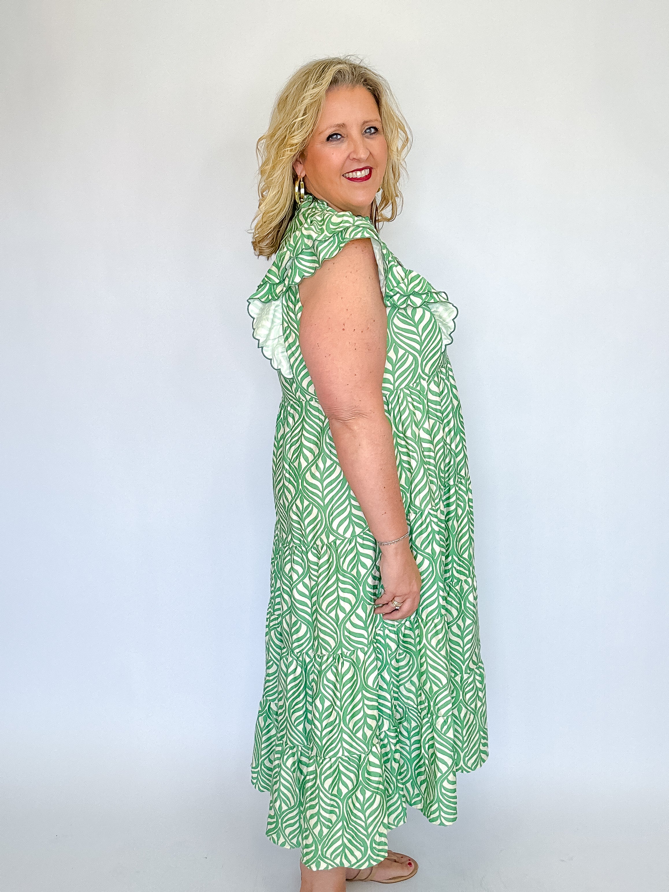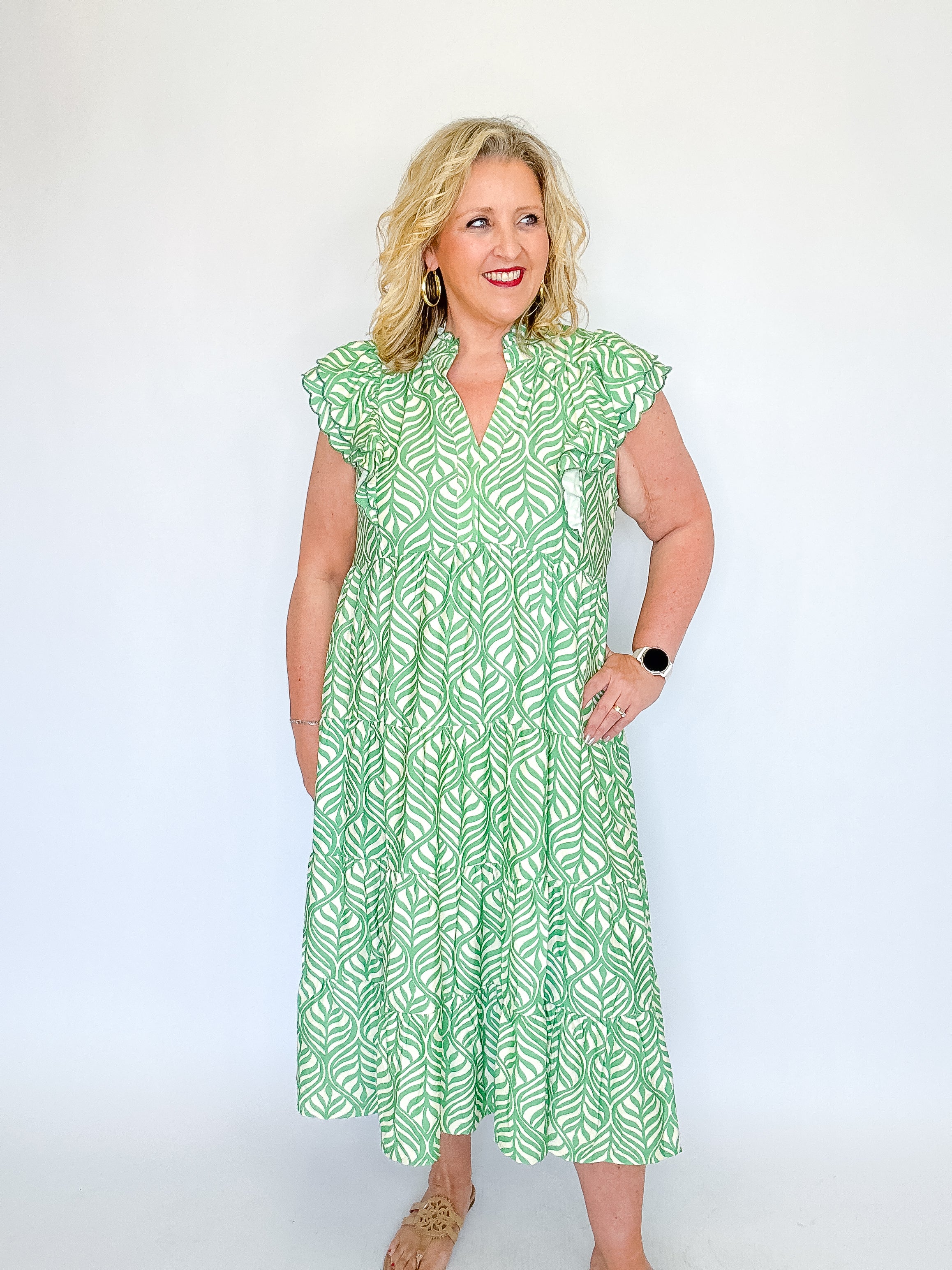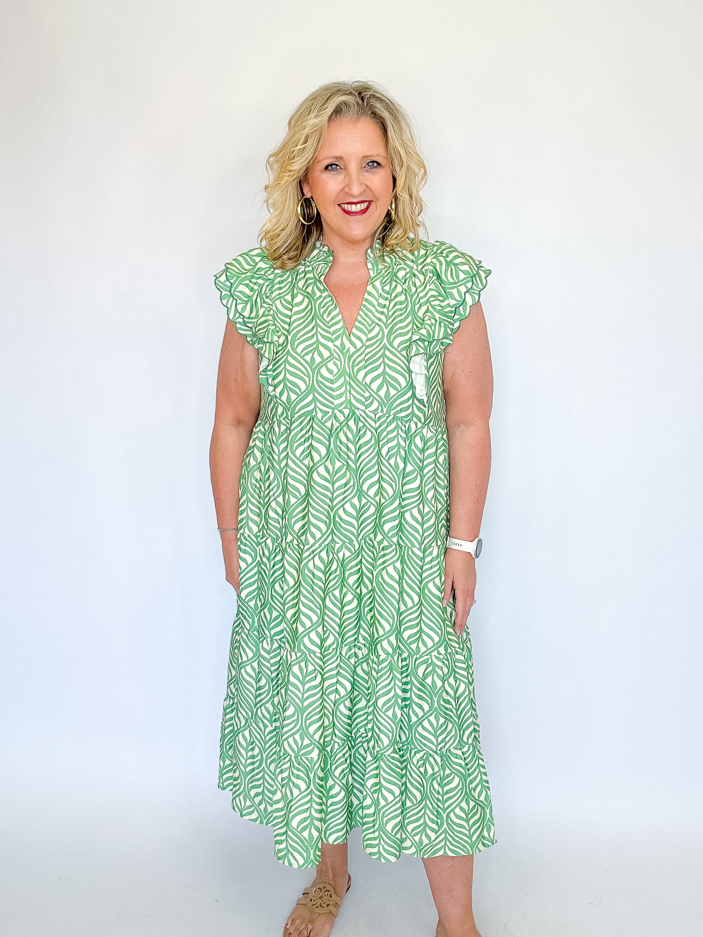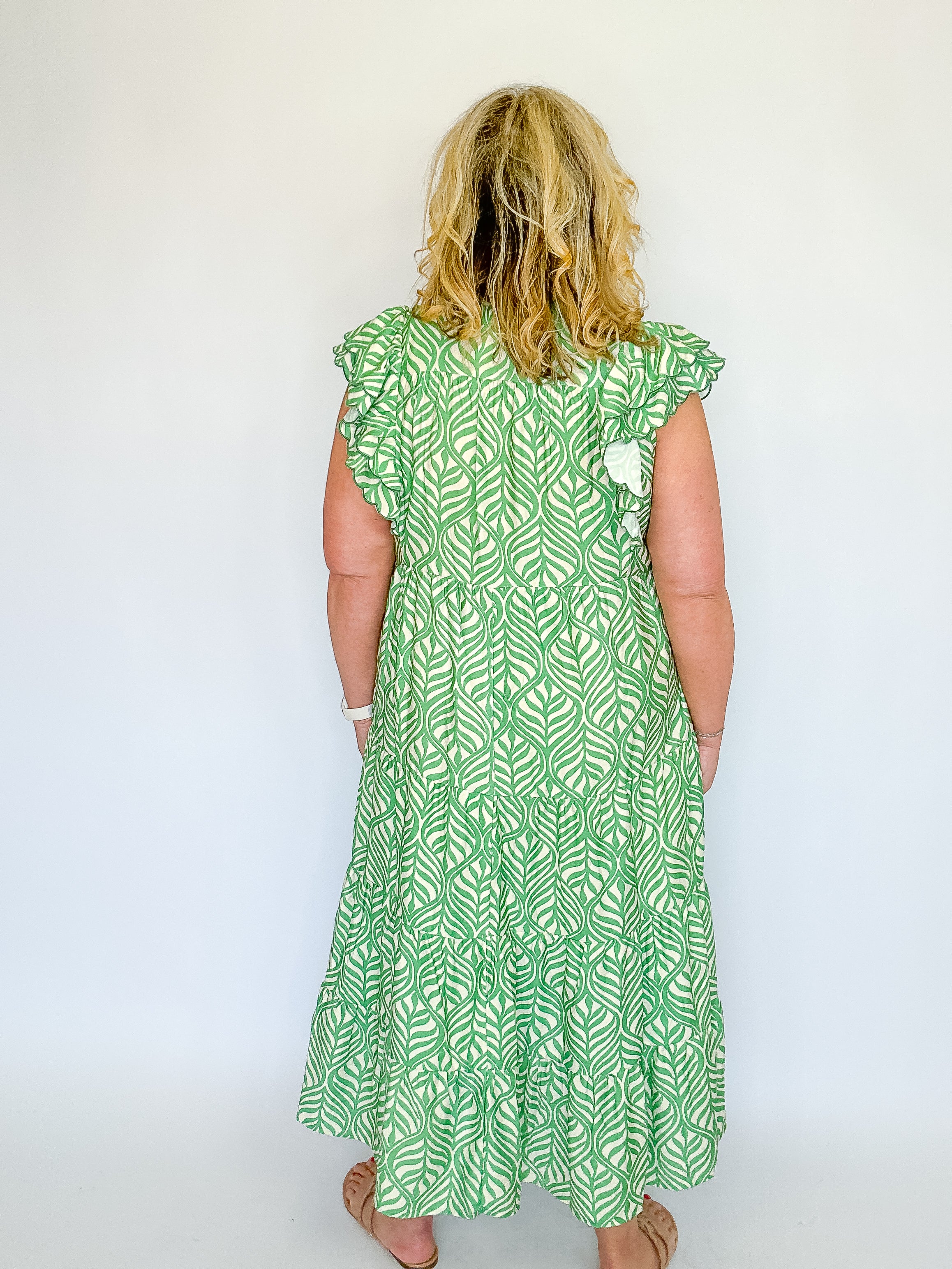 Fresh and effortlessly elegant, this leaf print tiered midi dress is perfect for warm days and easy styling. Designed with a flattering V-neckline accented by subtle ruffle trim, it adds just the right touch of romance. Short flutter sleeves with ruffle and scalloped detailing create beautiful movement, while the flowing tiered silhouette offers comfort and grace. Crafted from lightweight fabric and left unlined for an airy feel, this dress is ideal for brunch, vacations, or casual gatherings