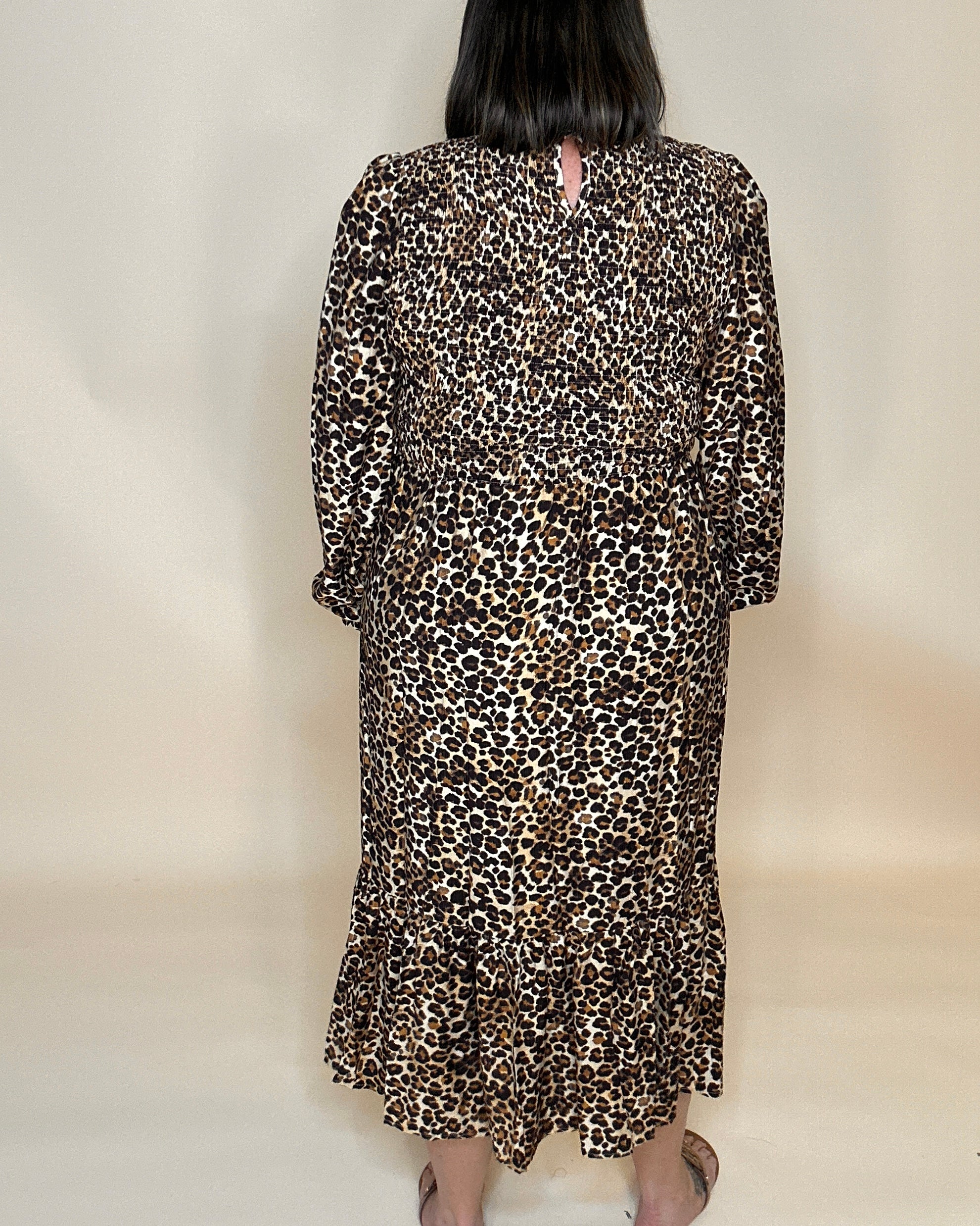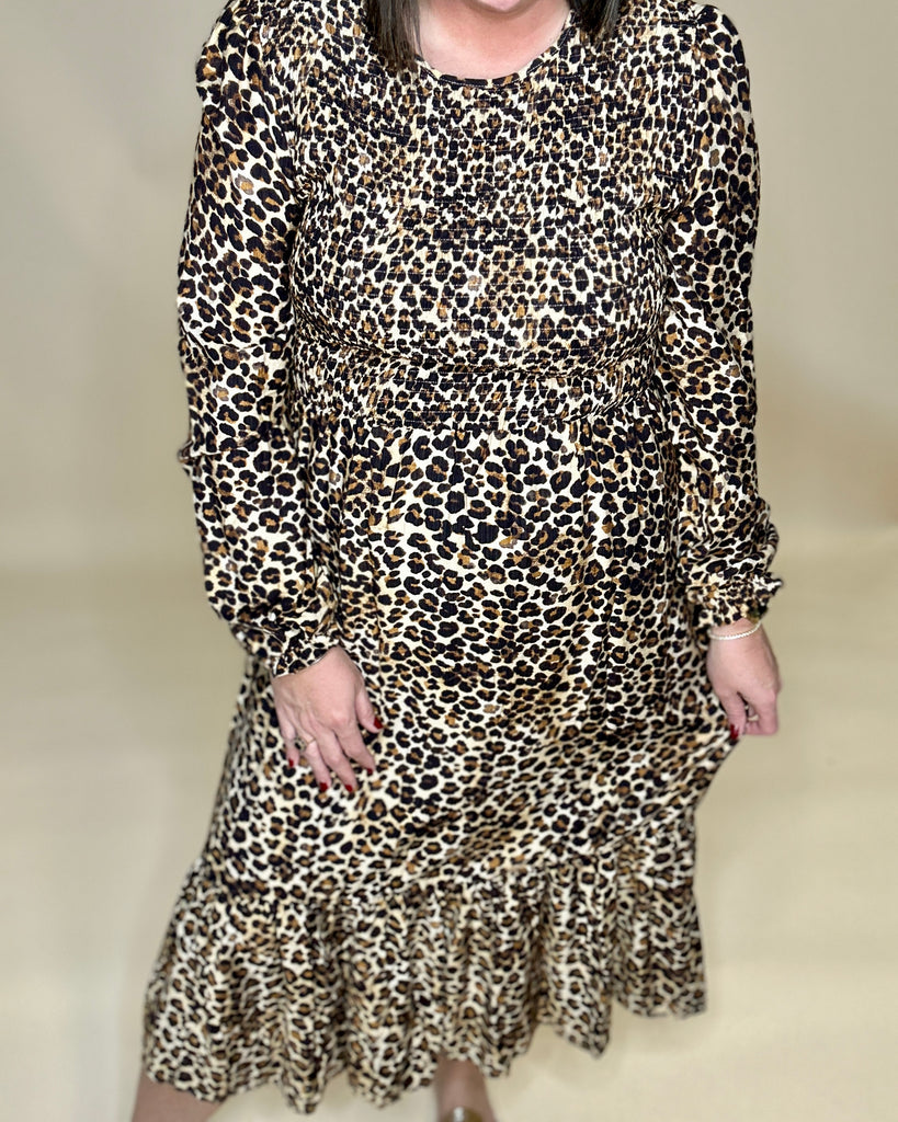 Embrace bold style with this playful leopard print maxi dress. Featuring smocked detail for a comfy fit, long sleeves that add a touch of elegance, and charming ruffle cuffs, it’s perfect for turning heads while staying cozy. Ideal for days when you want to mix wild flair with effortless comfort.