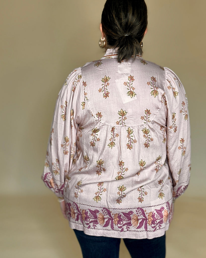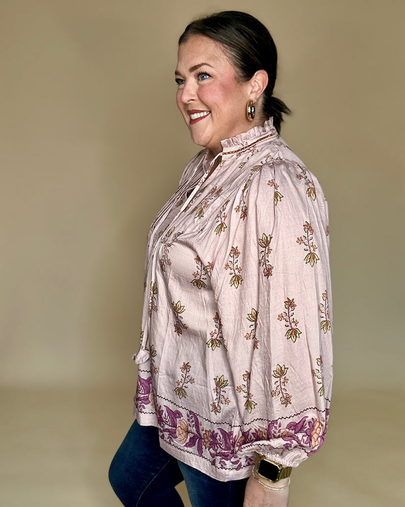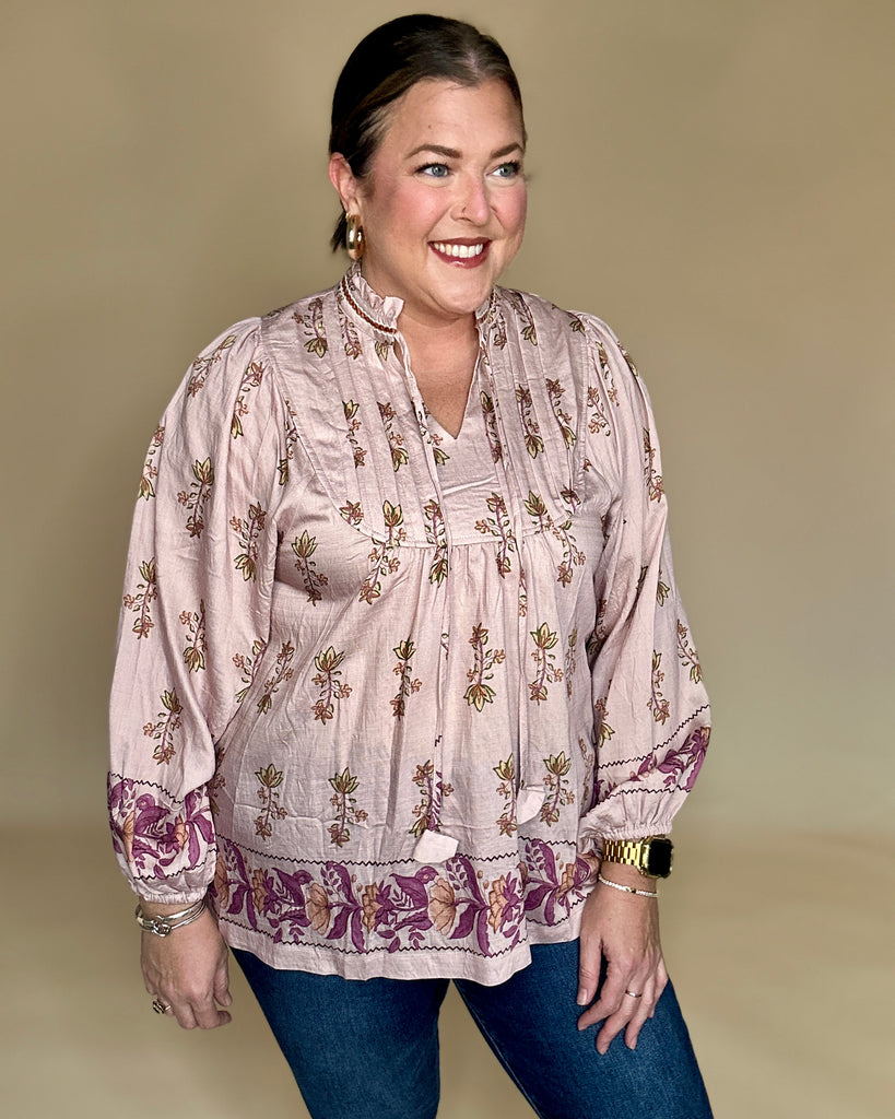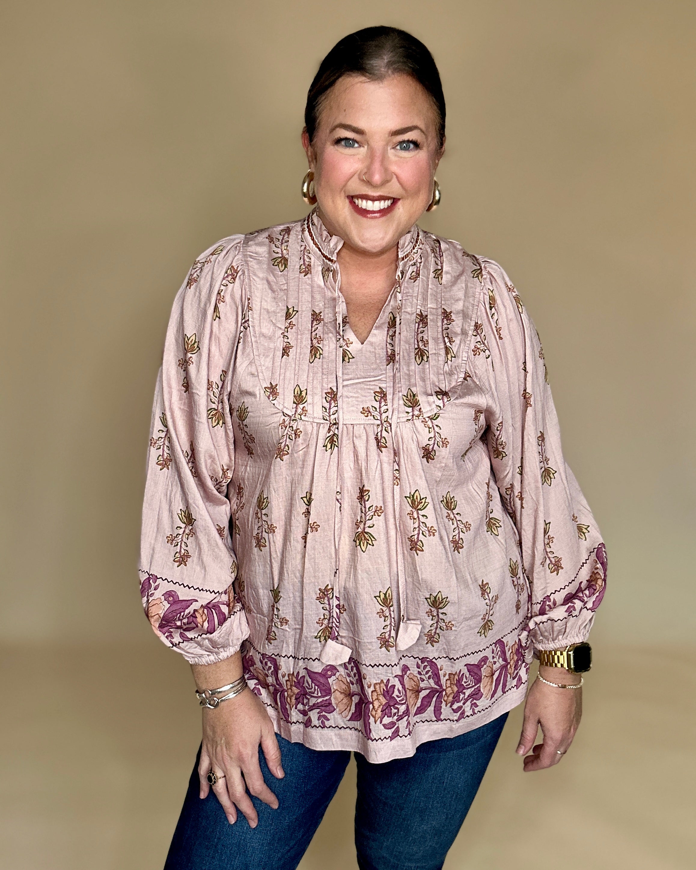 Elevate your wardrobe with this Floral Boho Peasant Blouse from Umgee, featuring a delicate split neckline and elegant tie detail. The long balloon sleeves add a graceful touch, while the pintuck accents highlight its refined craftsmanship. Finished with a straight hem and a charming floral border design, this unlined blouse offers effortless sophistication and comfortable wear for any occasion.