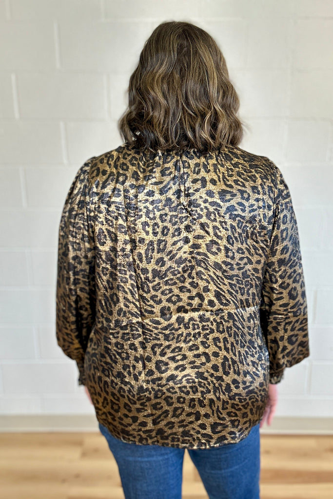 Add a wild twist to your wardrobe with this metallic leopard print blouse from Oddi. Featuring a flirty ruffled neck, voluminous long puff sleeves, and charming smocked ruffle cuffs, it blends fierce style with playful details. Perfect for turning heads at any occasion, this blouse brings out your bold and fun side with every wear.