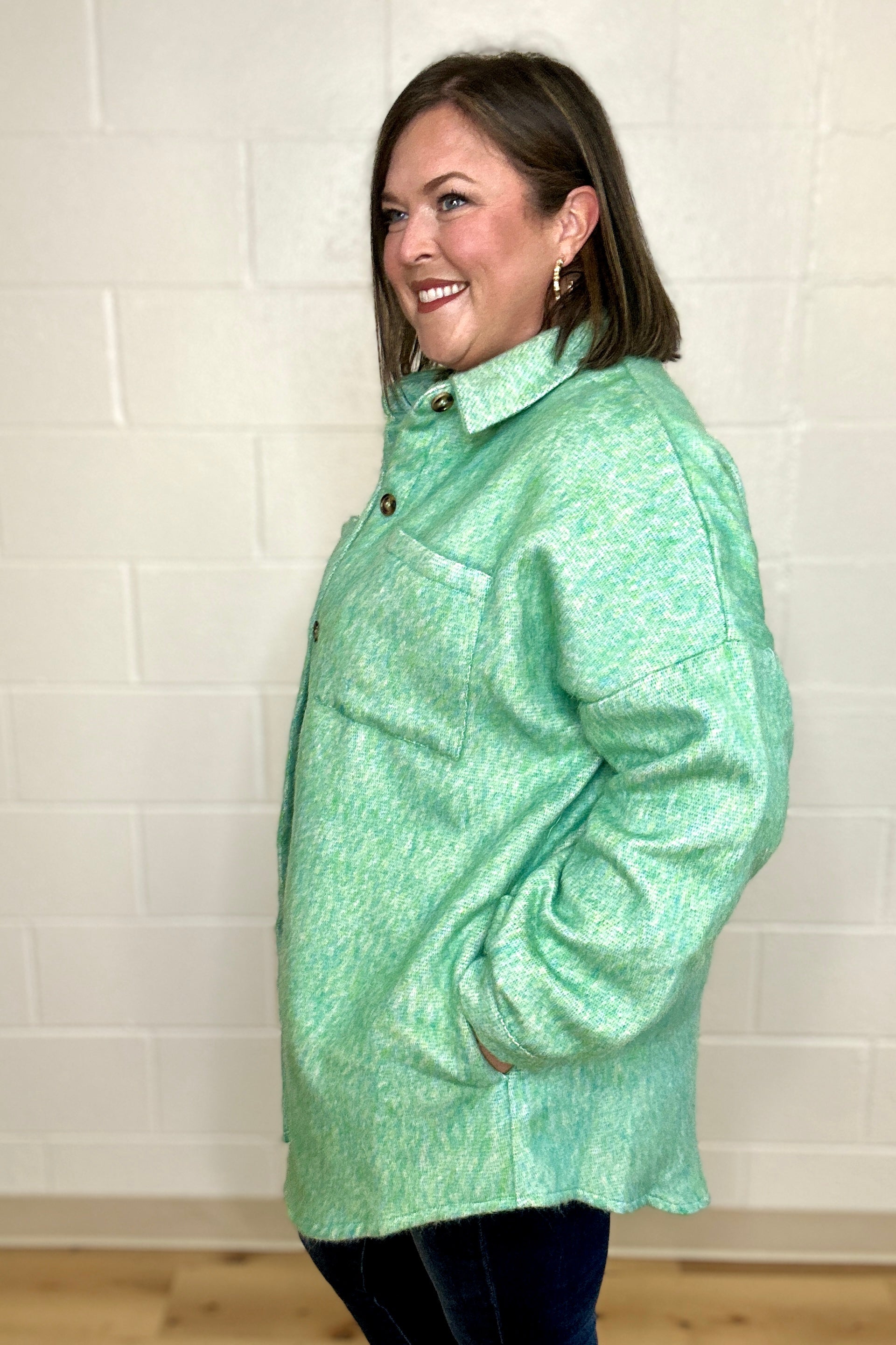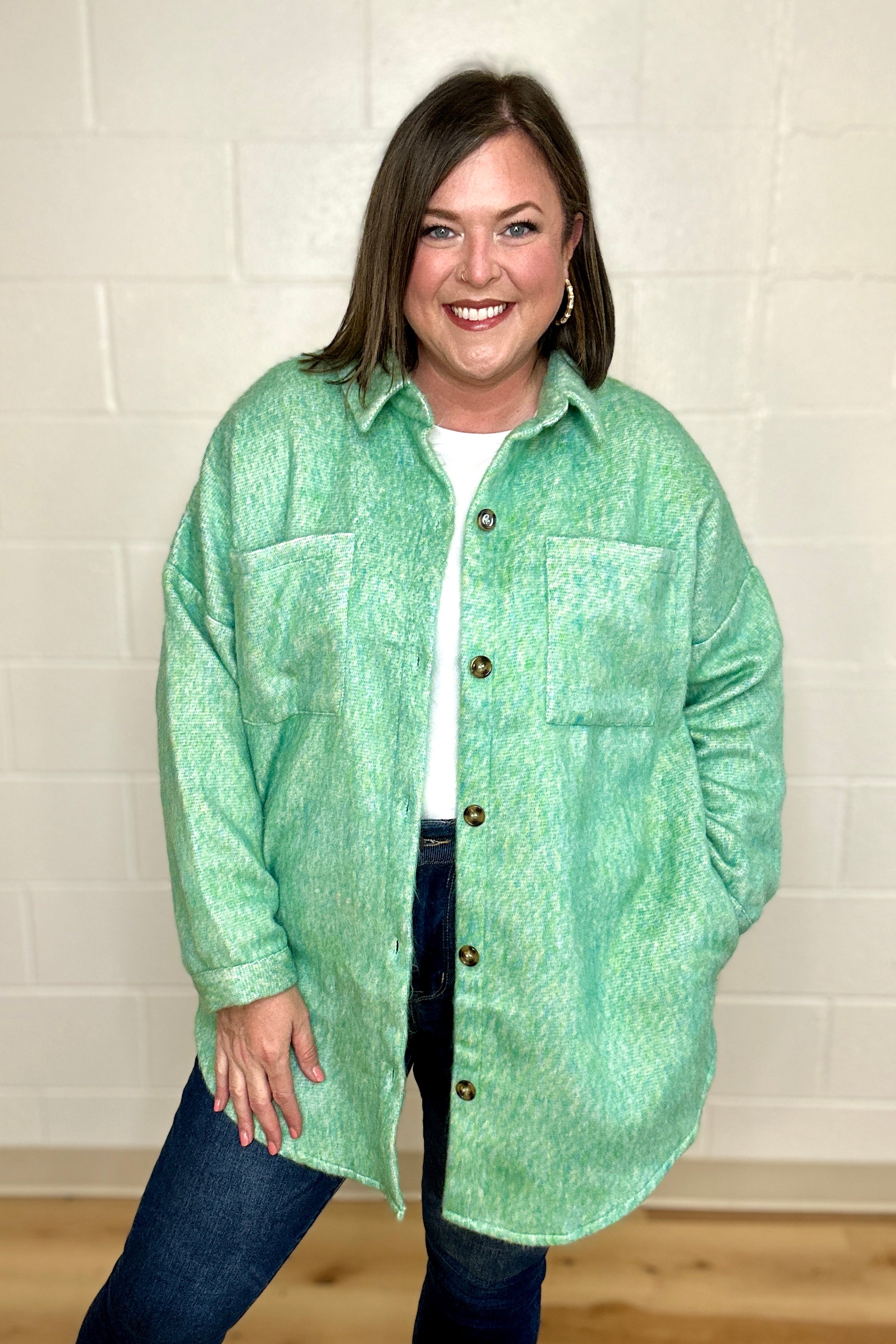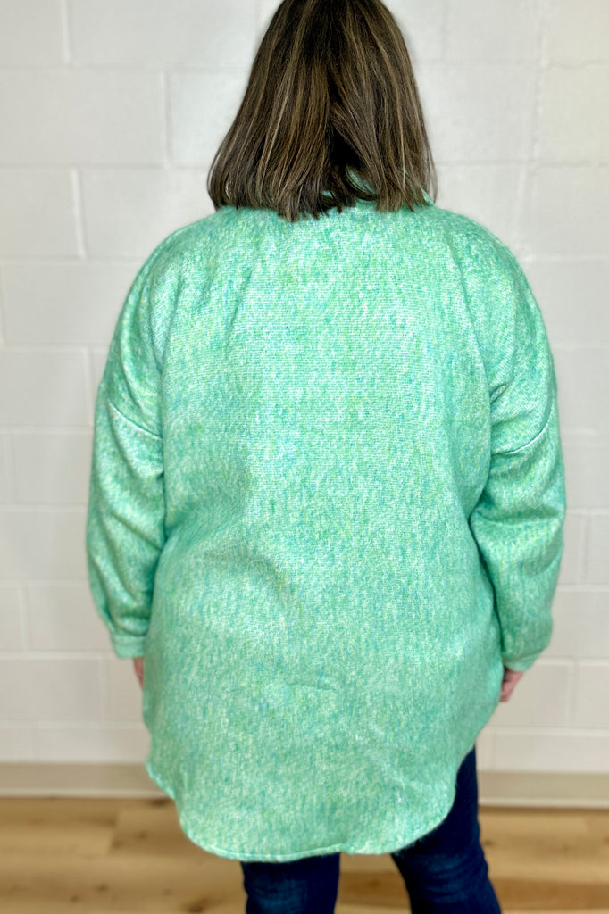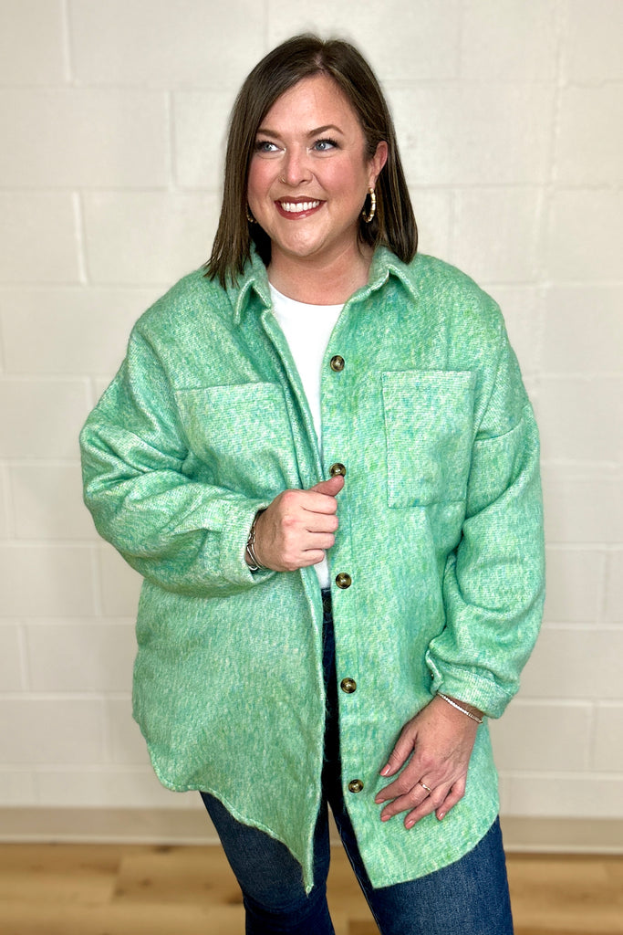 Cozy meets cool in this Mint Green Textured Shacket from Davi&Dani. Featuring a soft, fuzzy texture and cool color, adding a fresh pop to your outfit while keeping you comfortably warm. With a handy chest pocket and easy button-front design, this jacket is perfect for layering on crisp days with a fun, stylish twist.