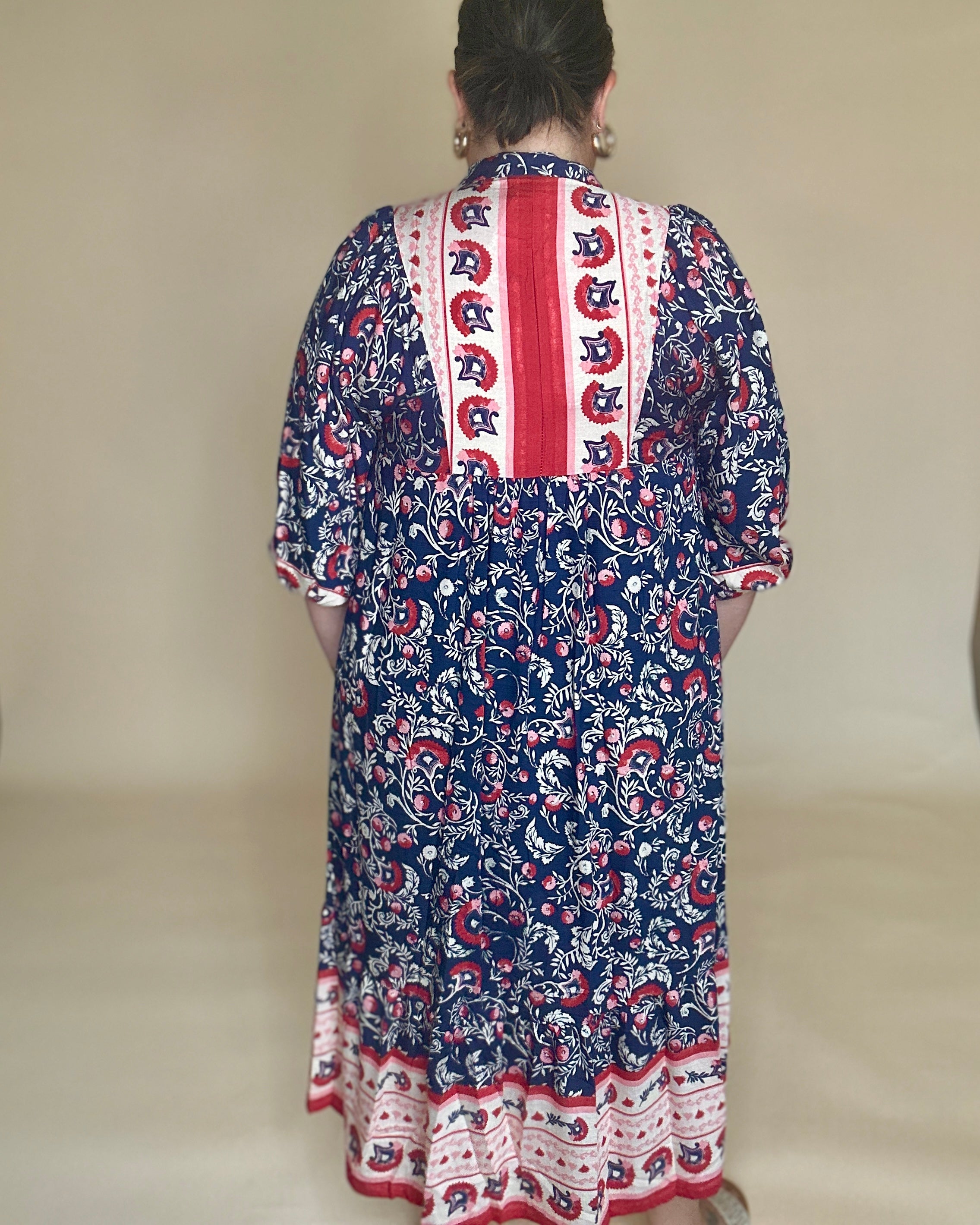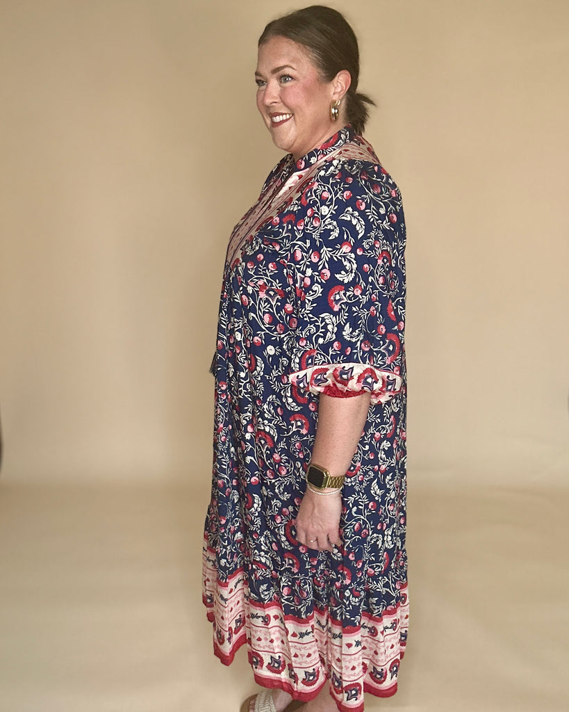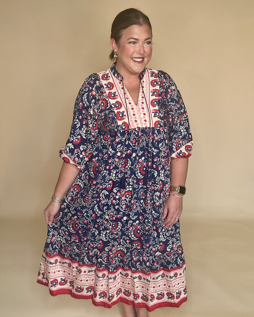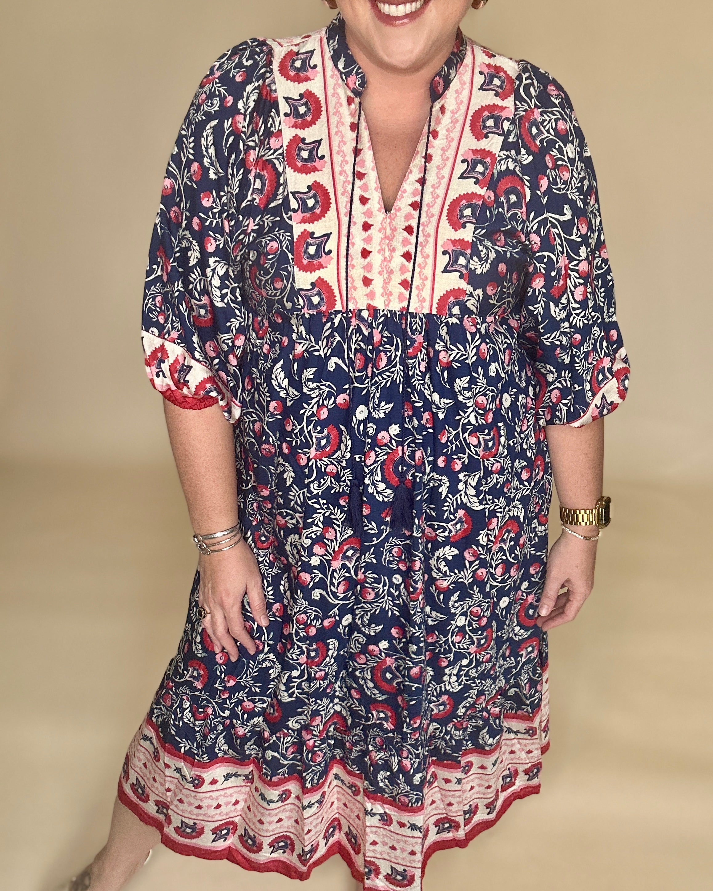 This Abstract Border Print Midi Dress from Umgee combines effortless style with distinctive details. Featuring a flattering V-neckline and adjustable tassel ties, it offers a customizable fit. The 3/4 length balloon sleeves add volume and elegance, while the tiered midi length with printed border detail provides visual interest and movement. Its loose and flowy silhouette ensures comfort and versatility, perfect for various occasions. Note that the dress is unlined, keeping it lightweight and breathable.