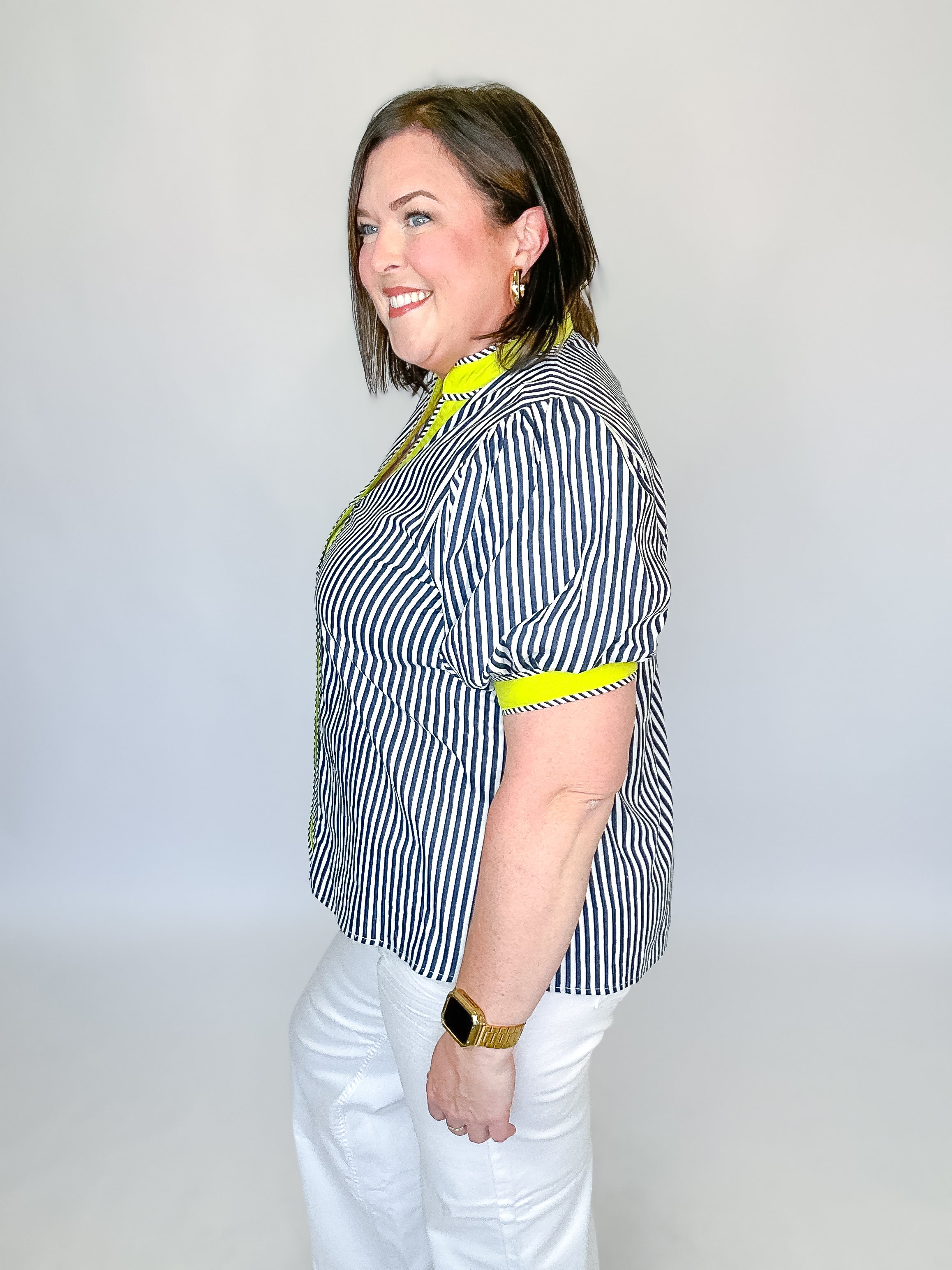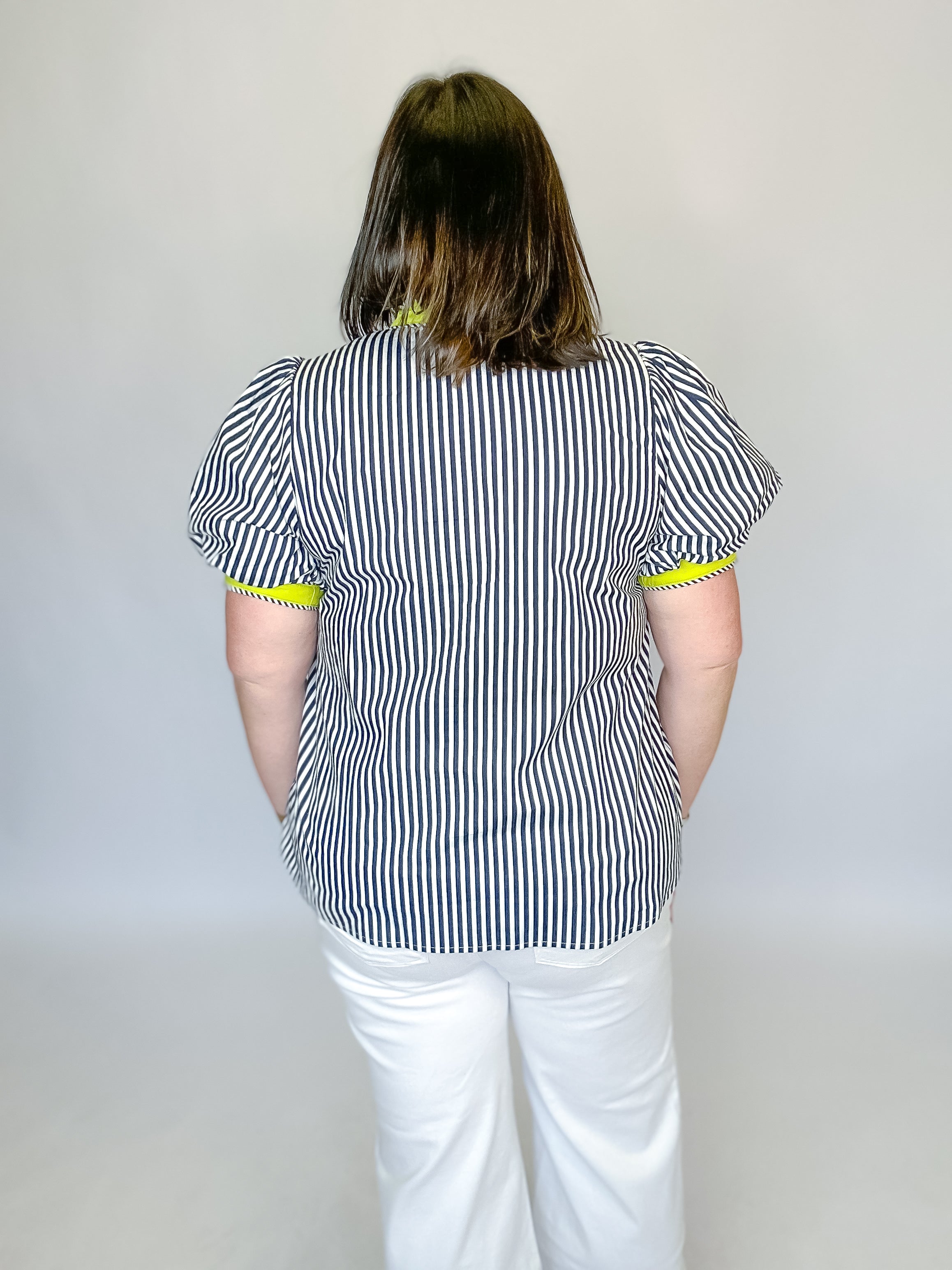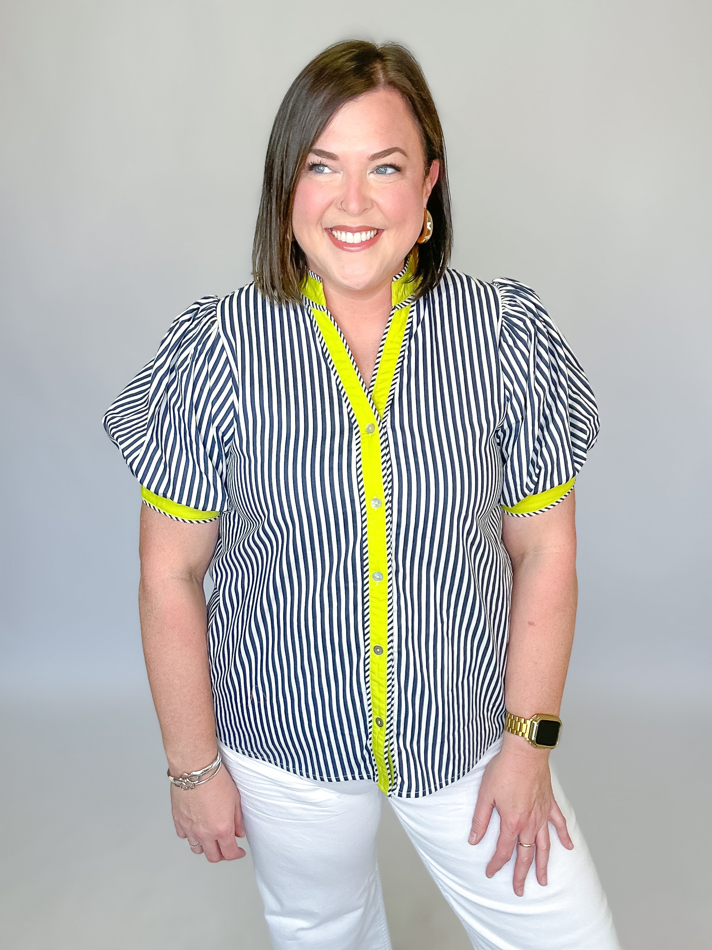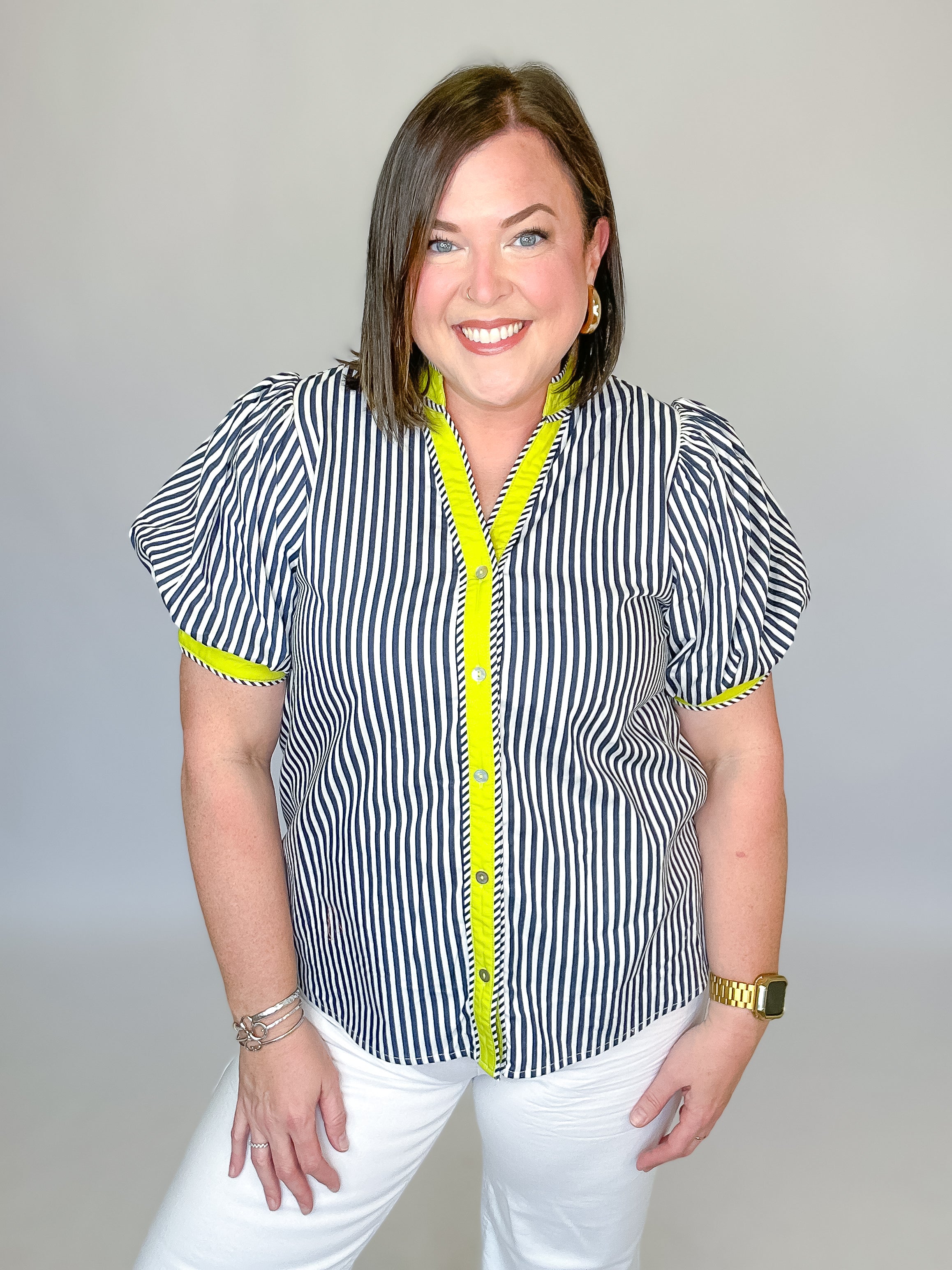 Elevate your everyday wardrobe with this refined striped puff sleeve top. Crafted from lightweight woven fabric, it showcases a flattering V-neckline accented with contrast binding and short, voluminous sleeves for a contemporary silhouette. The front button closure offers effortless styling, while the unlined construction ensures breathability and comfort. Non-sheer and versatile, this piece transitions seamlessly from casual daytime wear to polished evening occasions.