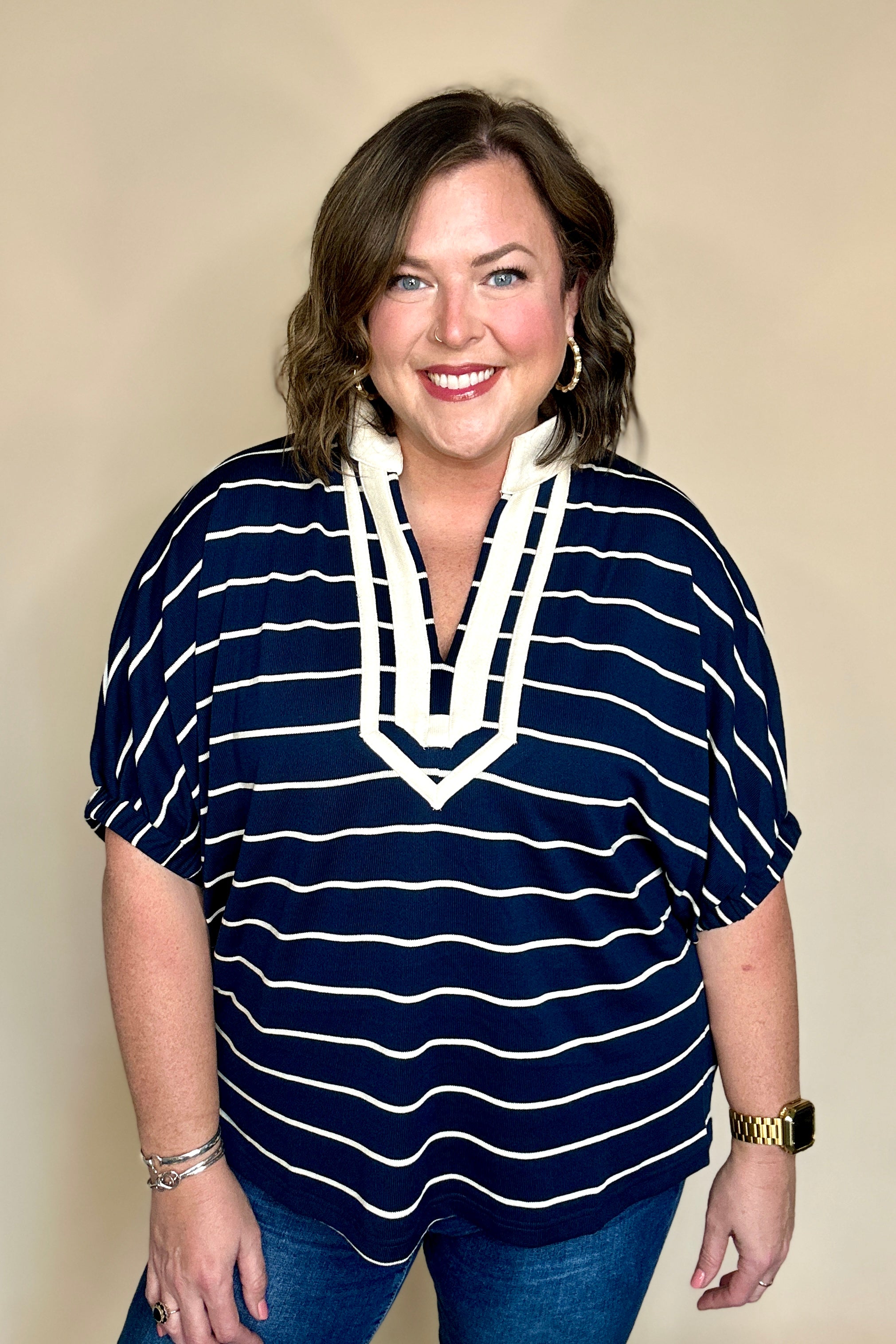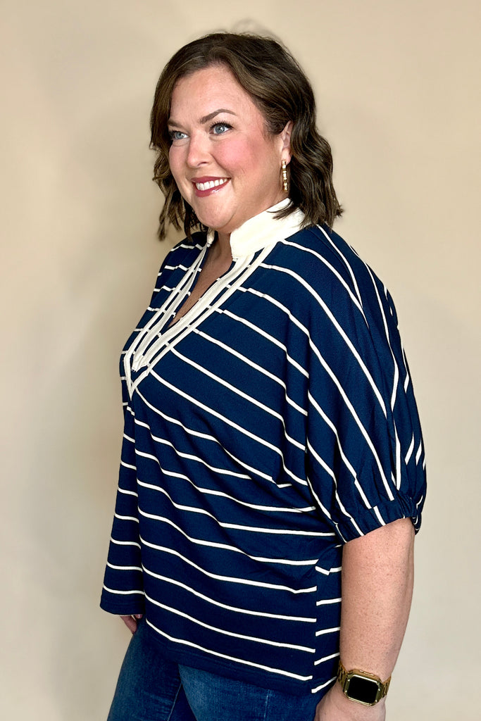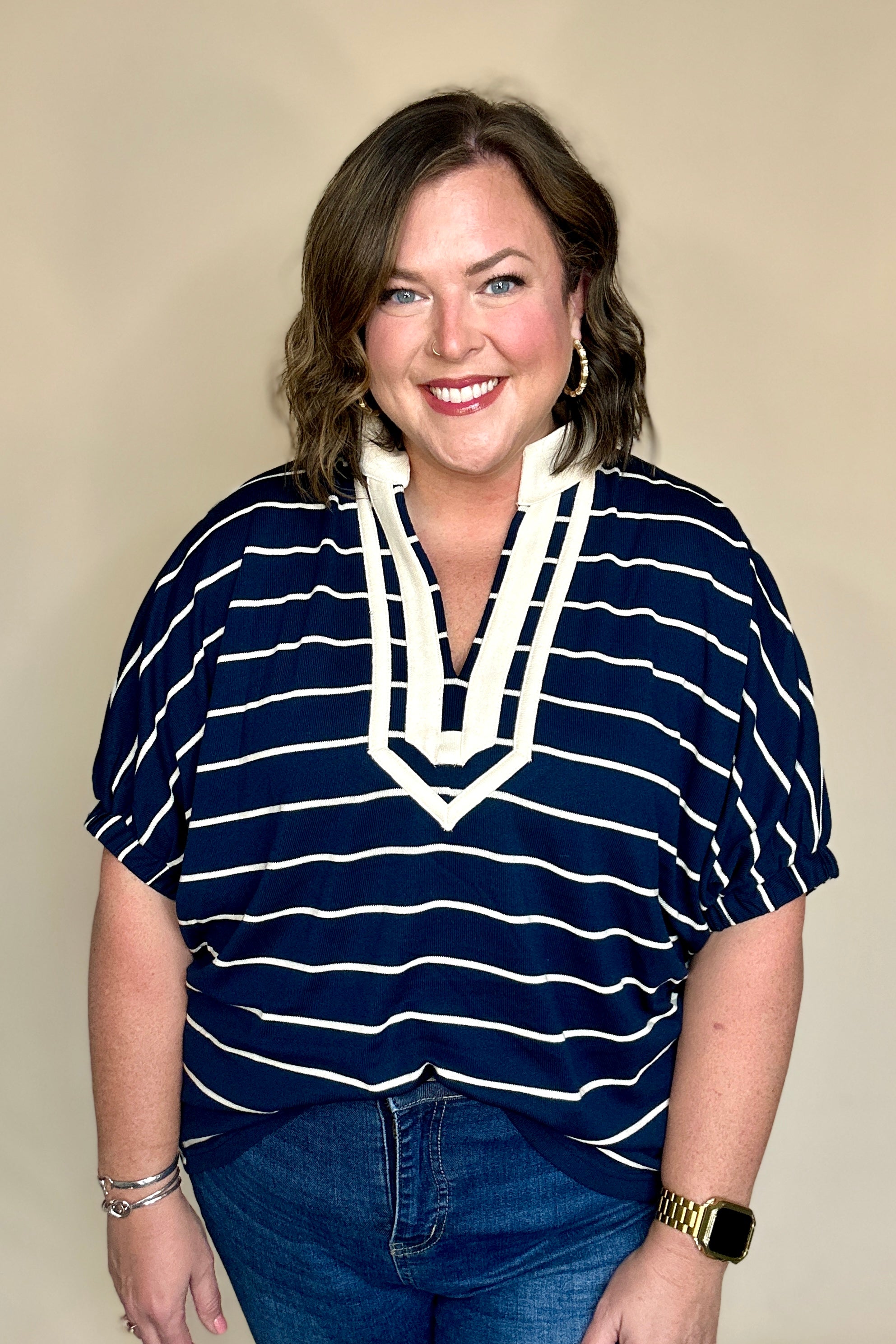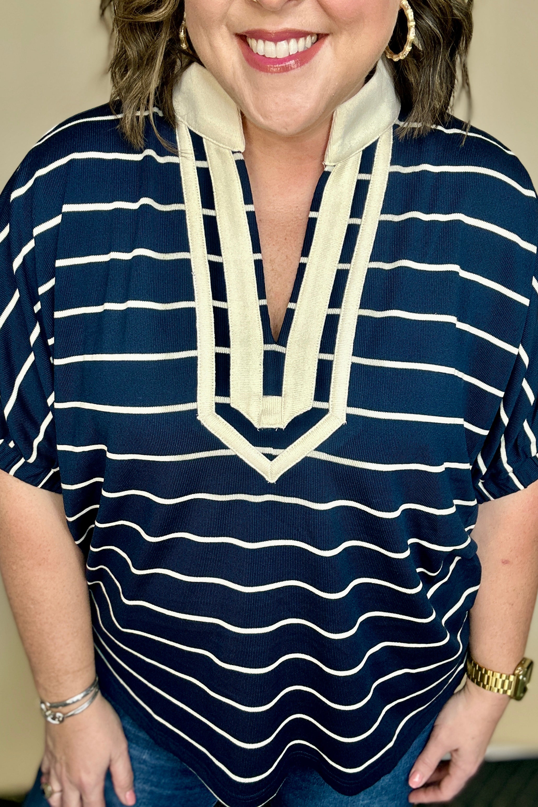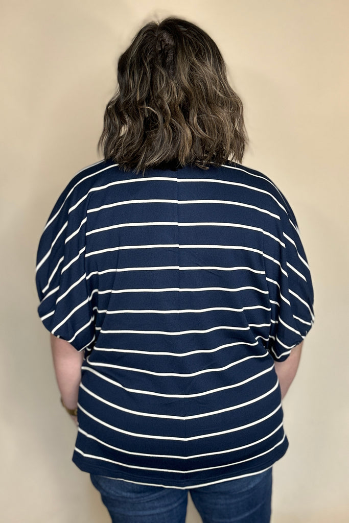 This lightweight, striped short dolman sleeve top by Entro combines comfort and style effortlessly. Featuring a contrast trim split V-neck and elasticated sleeve openings, it offers a flattering fit without compromising ease of movement. Made from non-sheer knit fabric and unlined for breathable wear, it’s perfect for layering or wearing on its own during warmer days. Elevate your casual wardrobe with this versatile piece that balances relaxed fit and chic detailing.