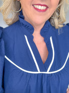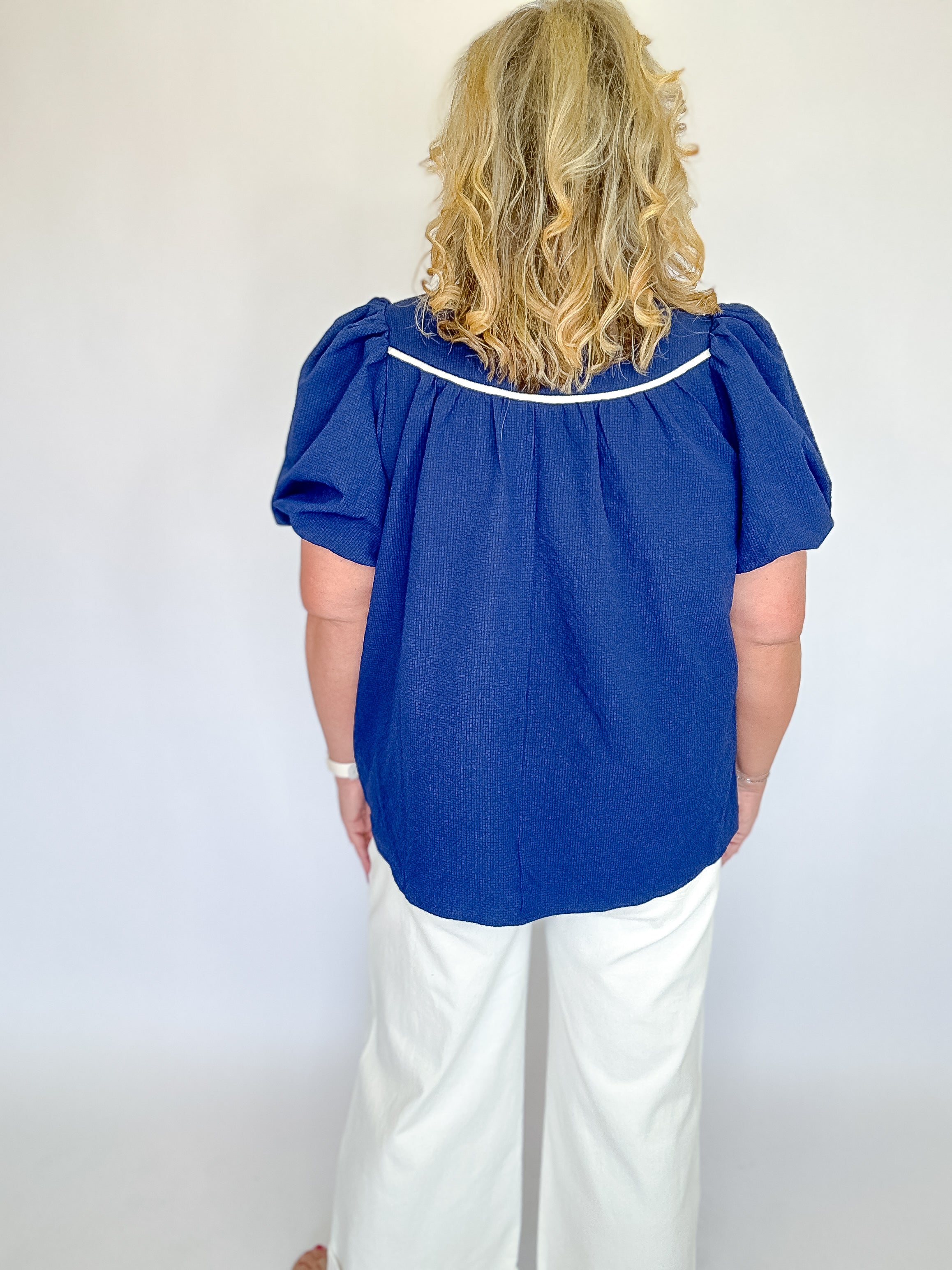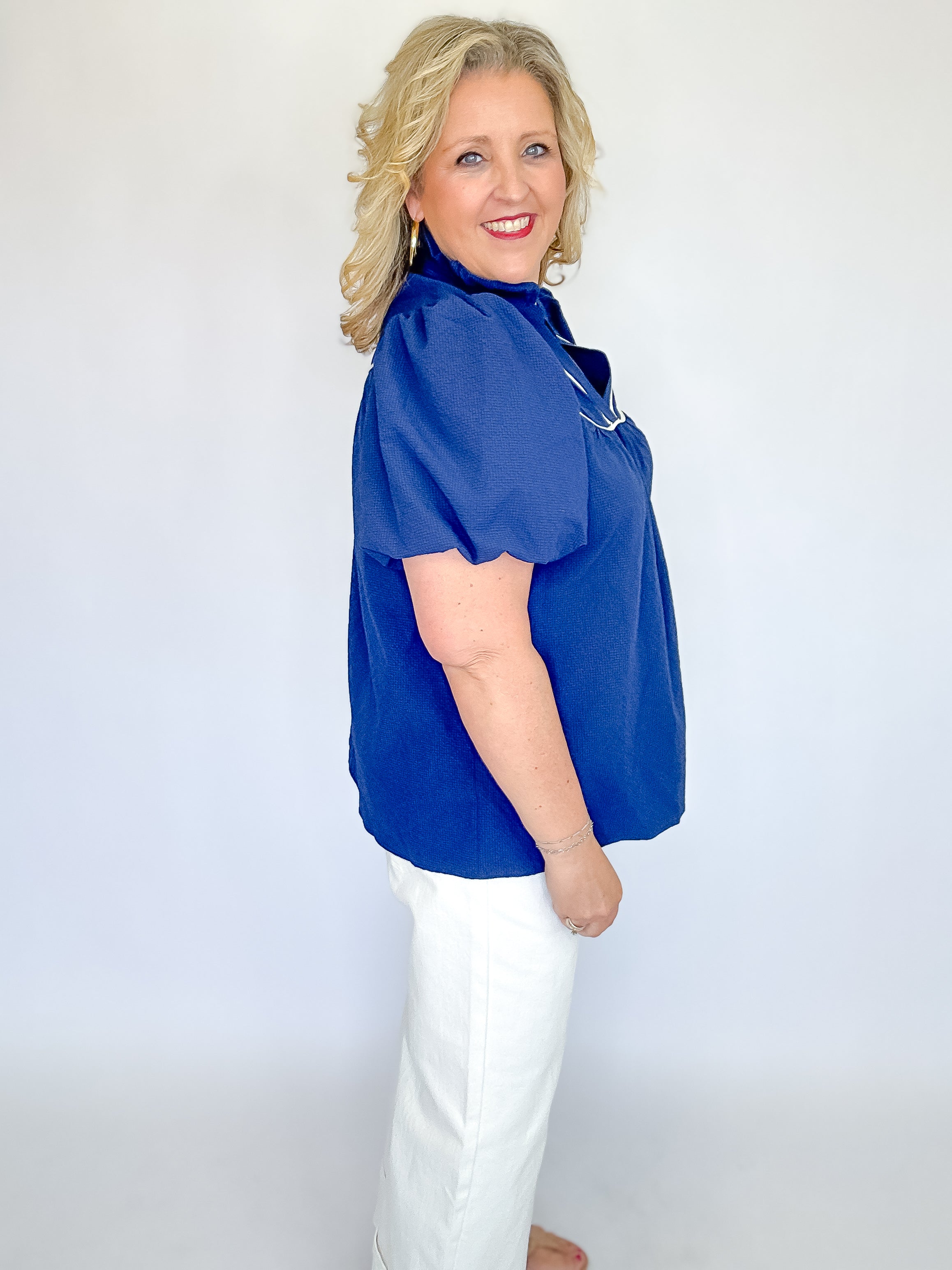 Boost your wardrobe with this sophisticated navy top, crafted from textured fabric for subtle visual interest. The statement ruffle mock neckline adds refined detail, while a V-cut neckline trimmed in contrasting fabric creates a flattering silhouette. Puff short sleeves bring a touch of elegance without overwhelming the design. Unlined for breathable comfort, this piece transitions effortlessly from office to evening occasions.