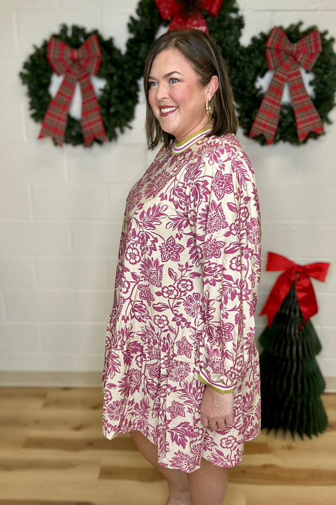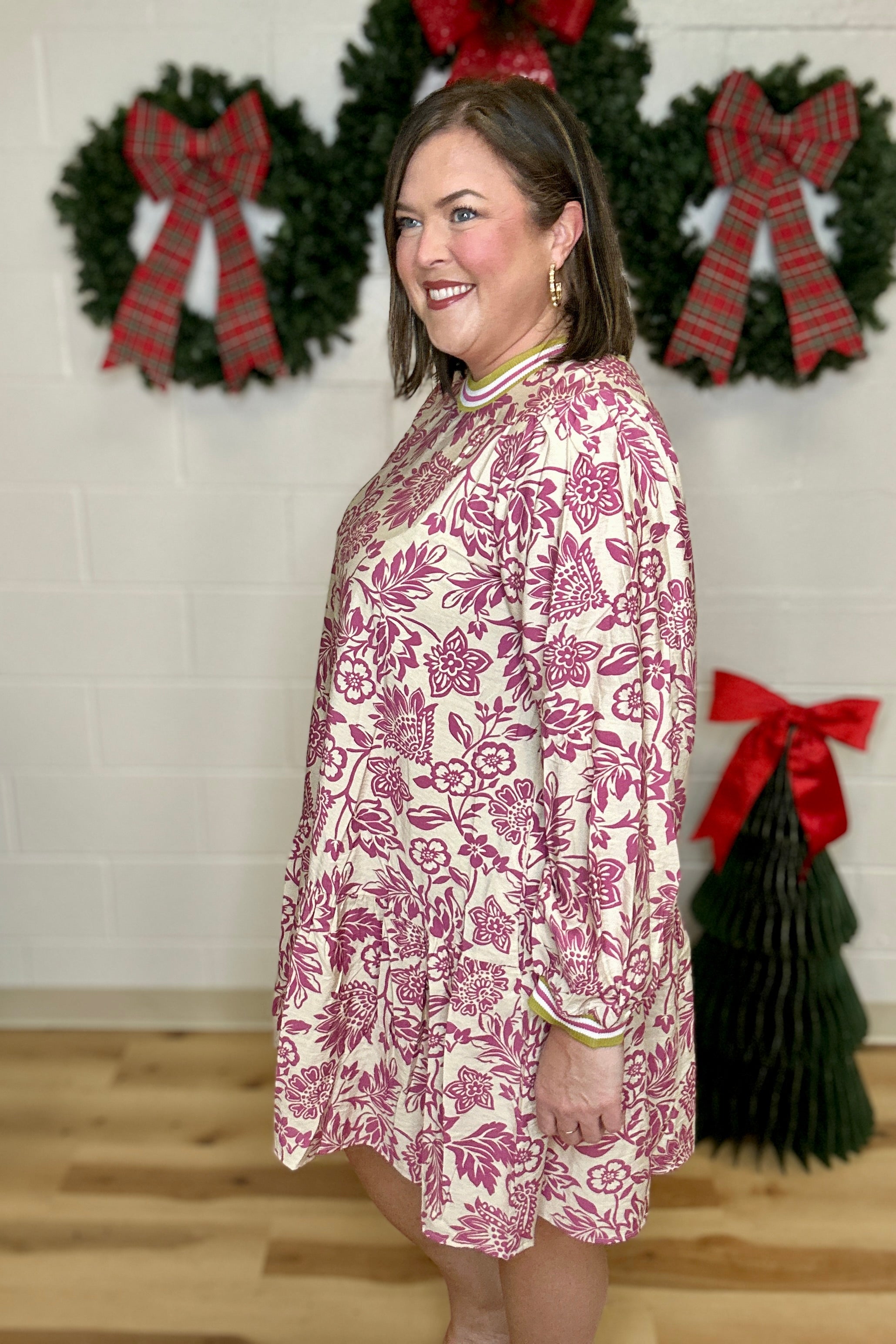 Orchid Floral Stripe Trim Ruffle Hem Dress
