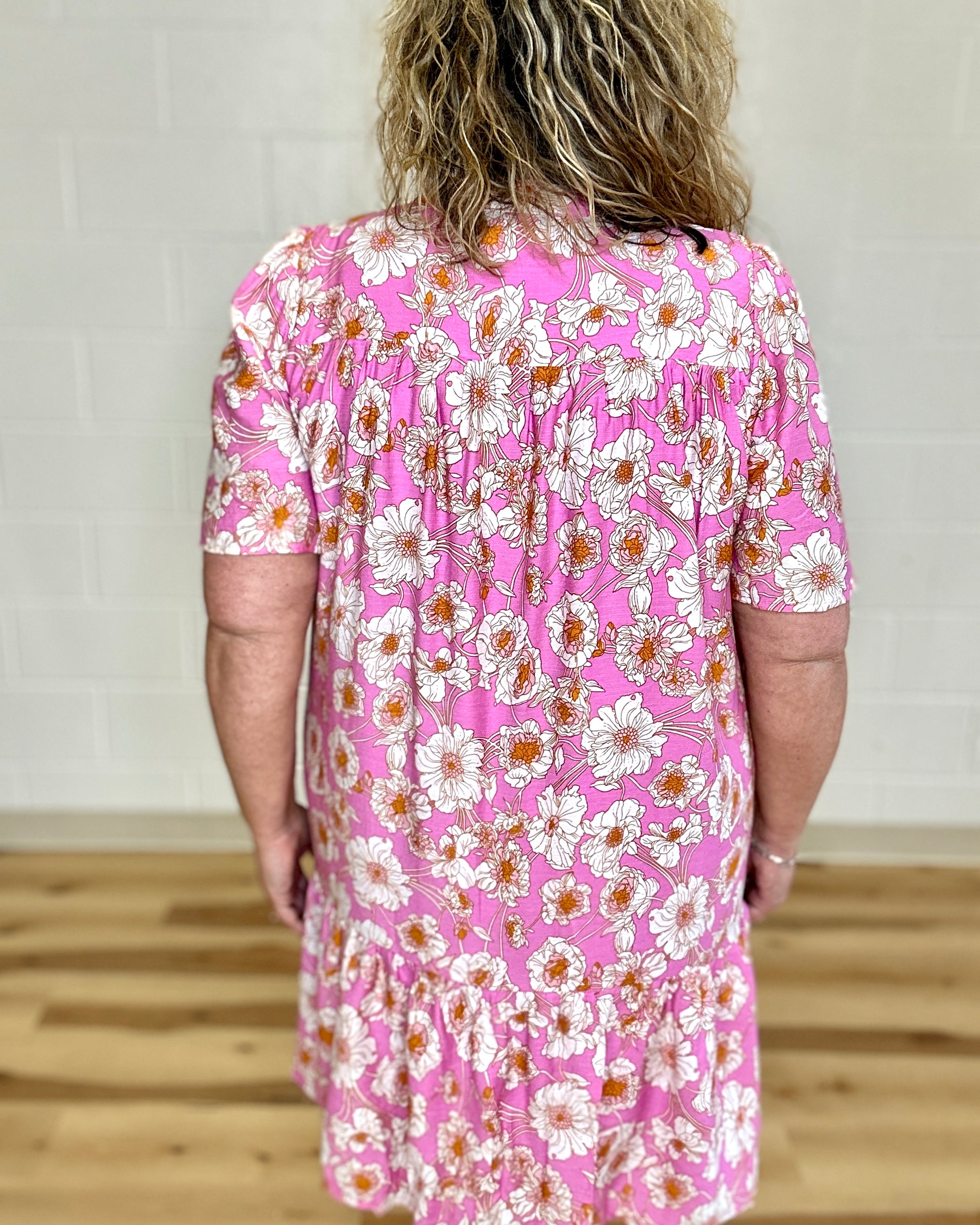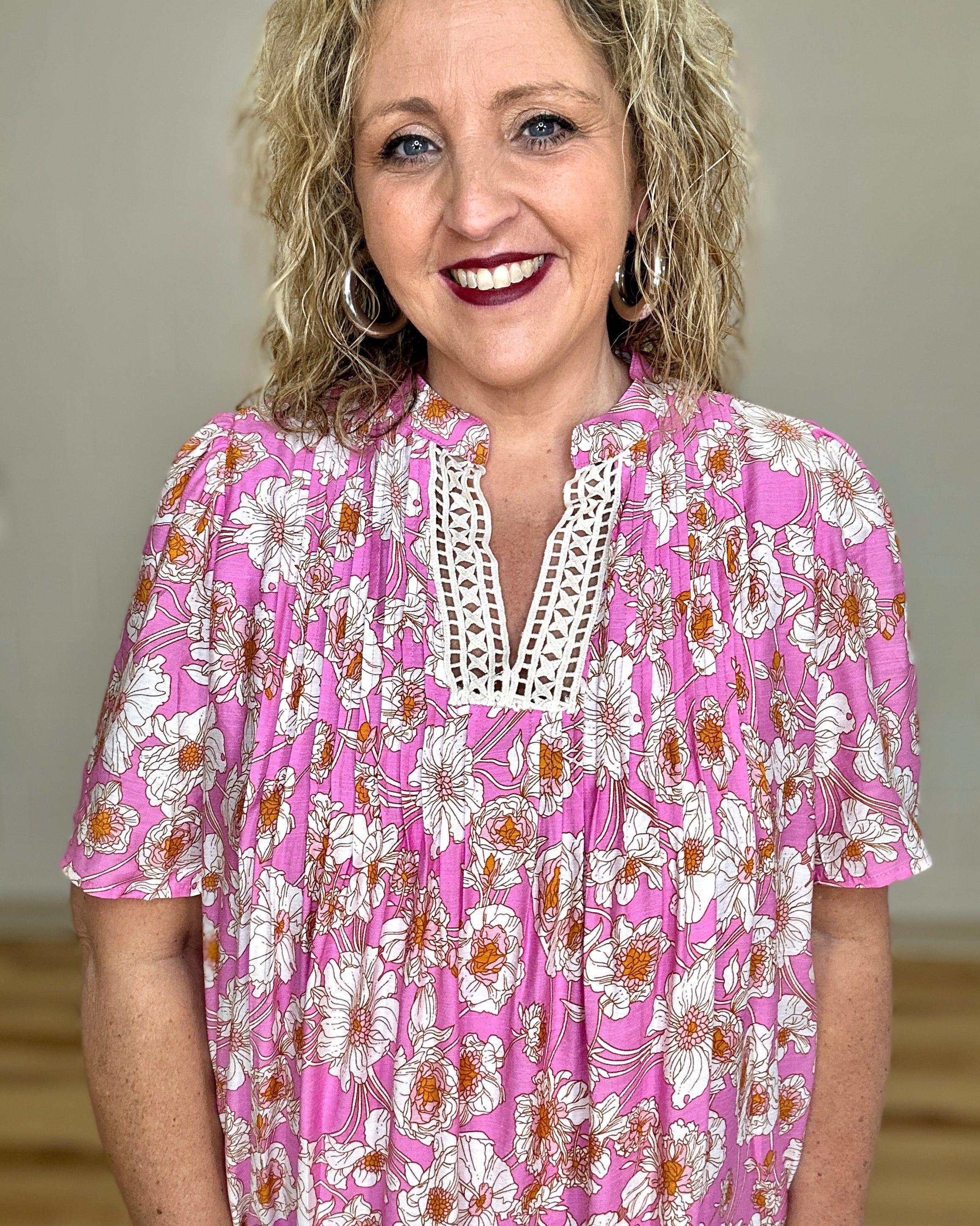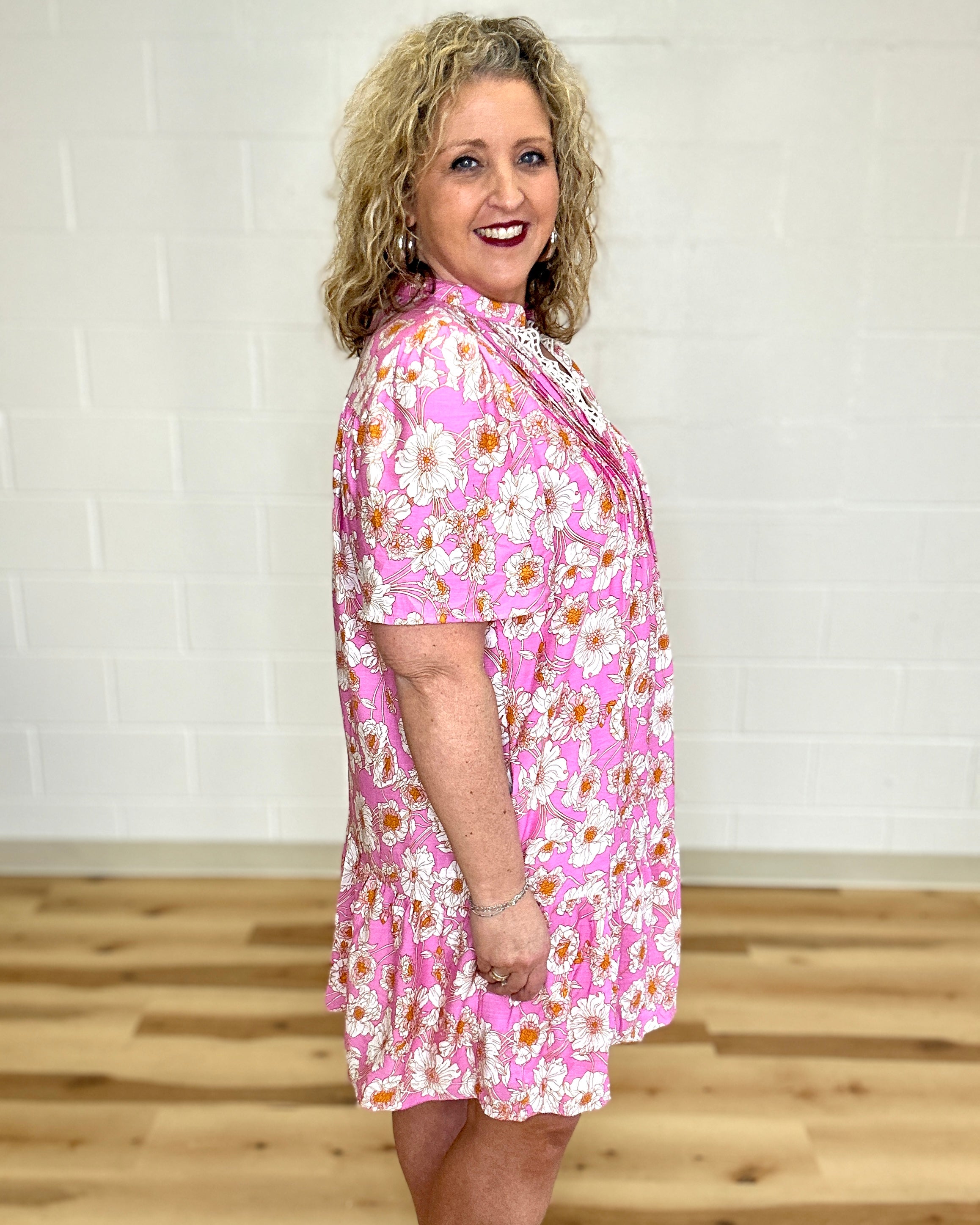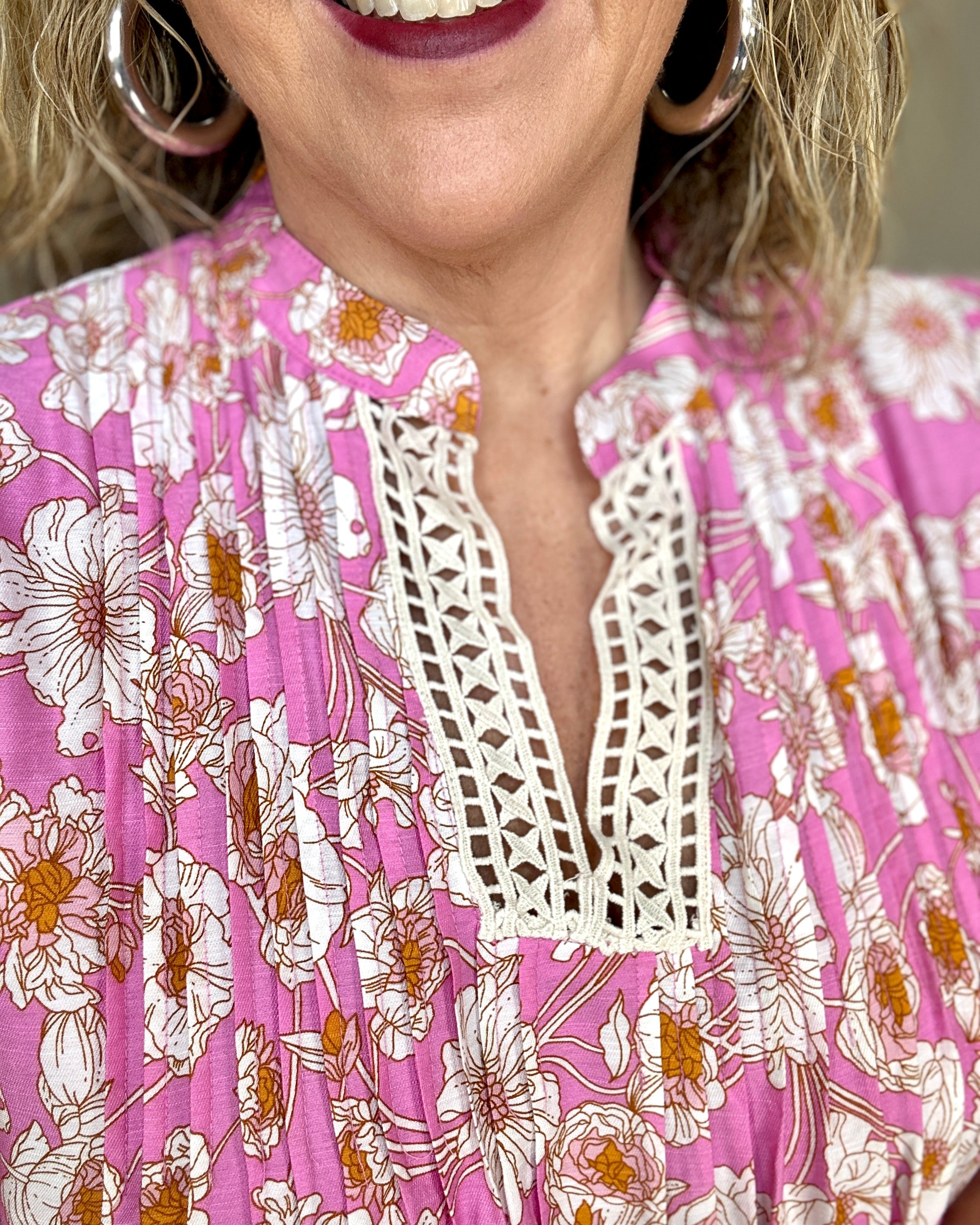 Pink Floral Pleated Dress by She+Sky combines timeless elegance with everyday practicality. This short-sleeve design features a delicate crocheted V-neck trim that adds refined texture, while an all-over floral print brings natural charm. Functional side pockets offer convenient storage without compromising style. The pleated silhouette creates flattering movement and dimension. Perfect for casual outings, garden parties, or layered styling through seasons.
