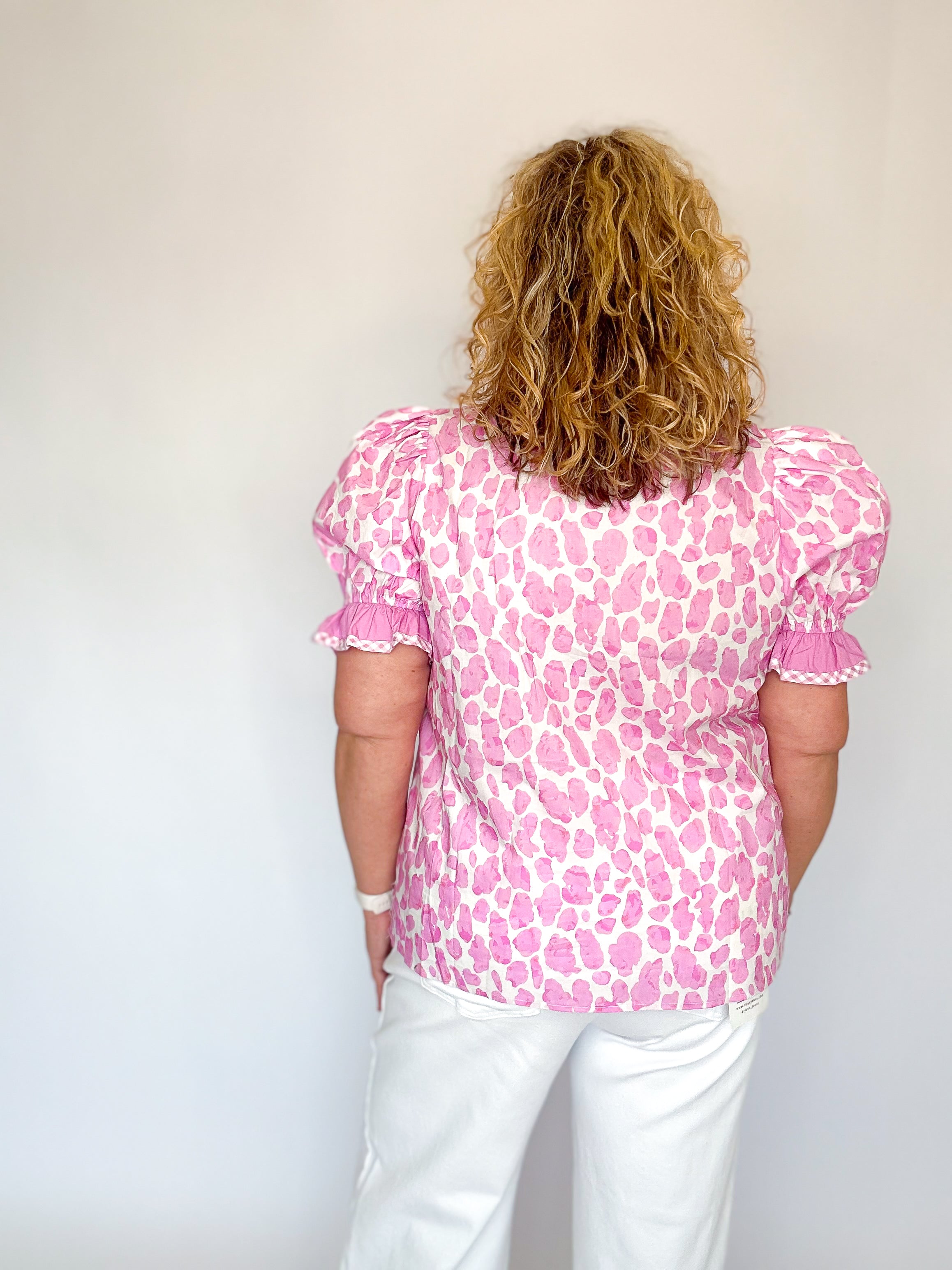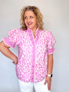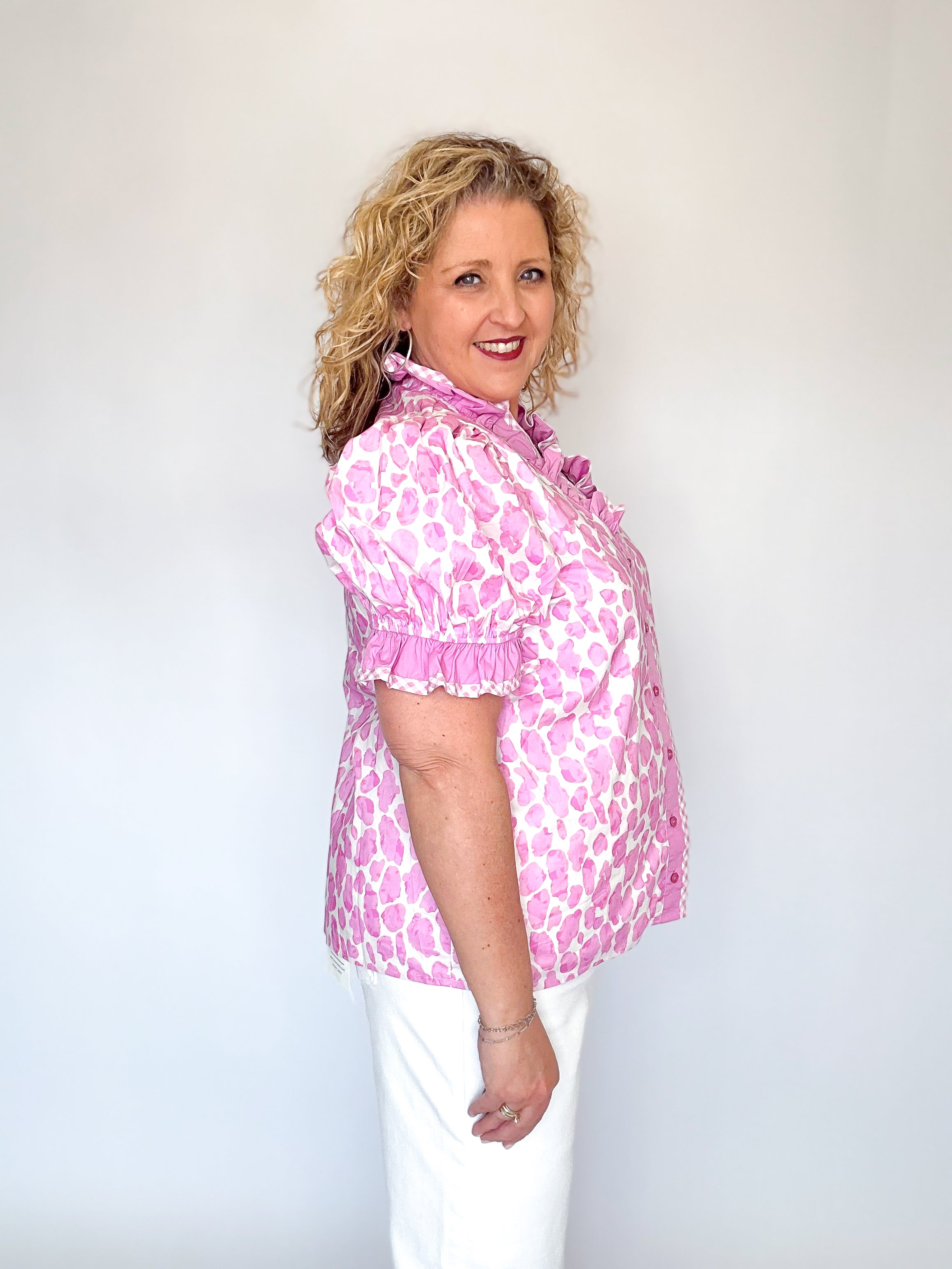 Feminine and flirty, This pink and white print top features a soft abstract leopard pattern on a white base with ruffle details throughout. Designed with a split V-neckline, puff sleeves, and a button-front silhouette, its lightweight, breezy, and effortlessly charming. Perfect for dressing up denim or pairing with tailored shorts for a polished daytime look.