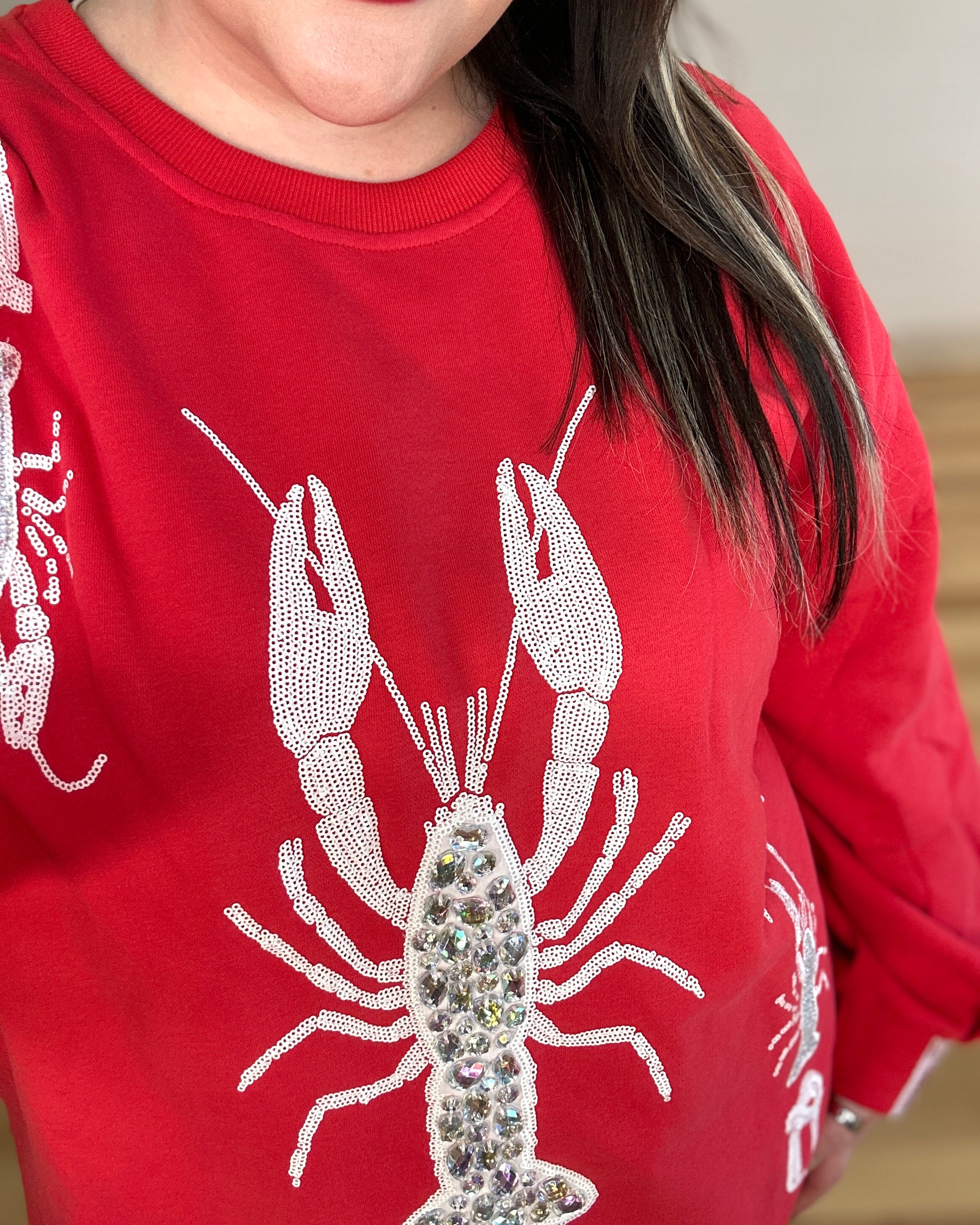 Crawl into style with this vibrant red sweatshirt featuring a dazzling white sequin crawfish design inspired by a royal playing card. Perfect for celebrating your love of southern crawfish boils, this playful piece combines comfort with sparkle. The slightly oversized fit gives you that effortless, cozy vibe while the eye-catching crawfish graphic makes a bold statement. Whether you're heading to a boil or just want to show off your southern spirit, this sweatshirt is your crown jewel.