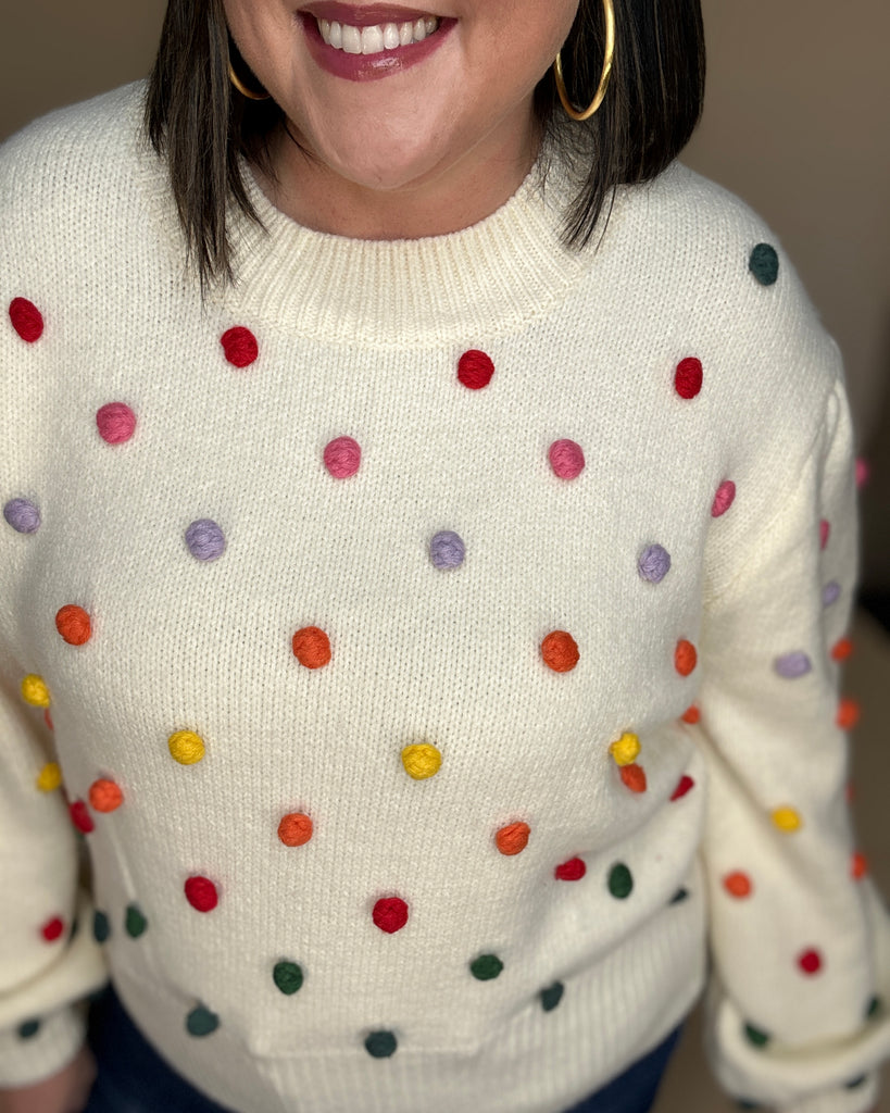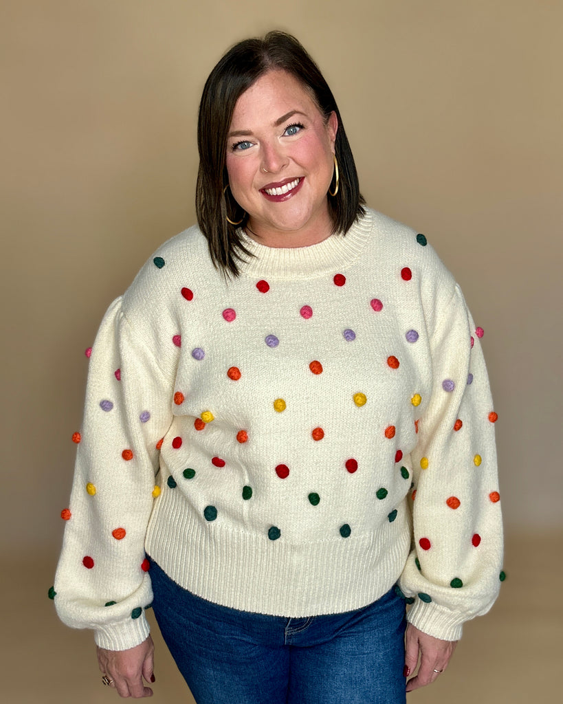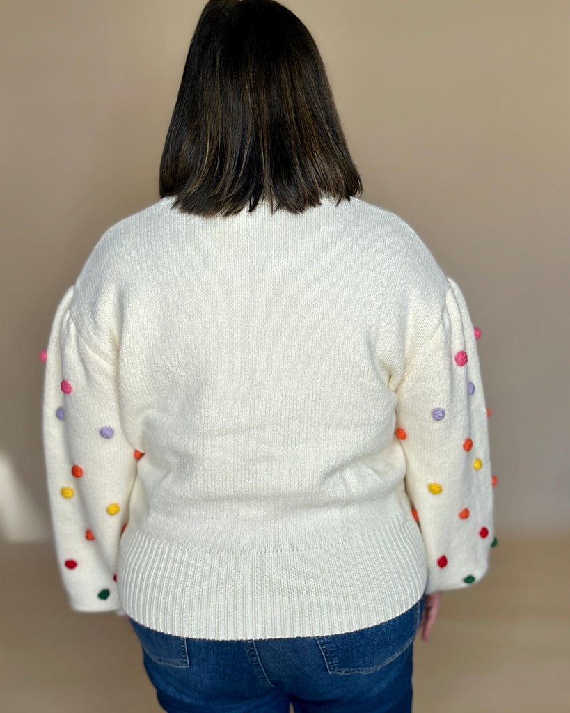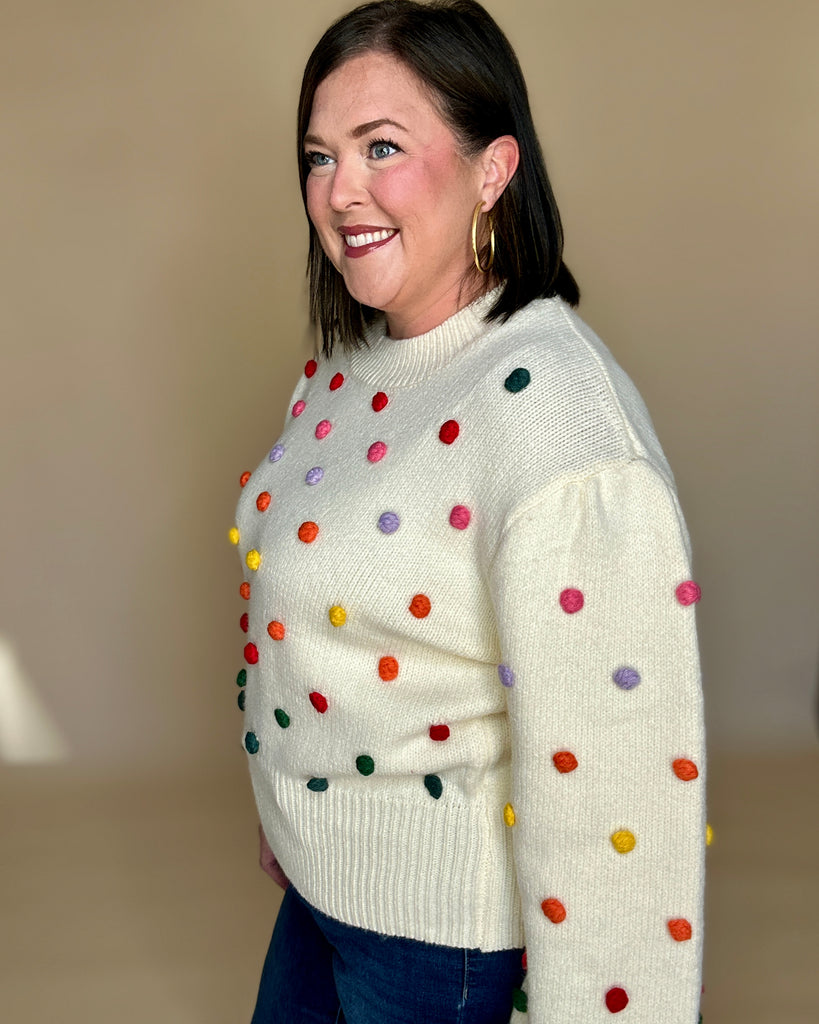 Elevate your style with the Rainbow PomPom Mock Neck Sweater from Davi&Dani. This playful piece features vibrant 3D pom-poms, puff sleeves, and a fitted ribbed waist that adds a touch of sophistication while keeping you cozy. Perfect for layering or as a standout top, it brings a fun yet refined flair to your everyday wardrobe. Add instant charm and comfort to your outfits with this unique and eye-catching sweater.