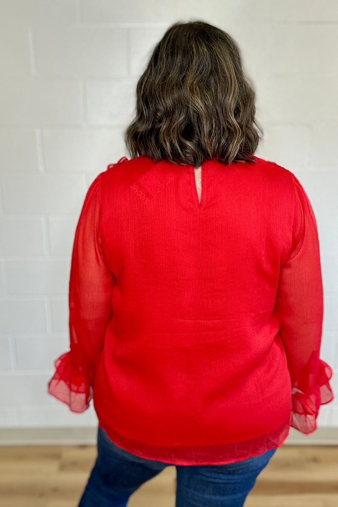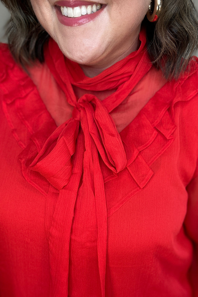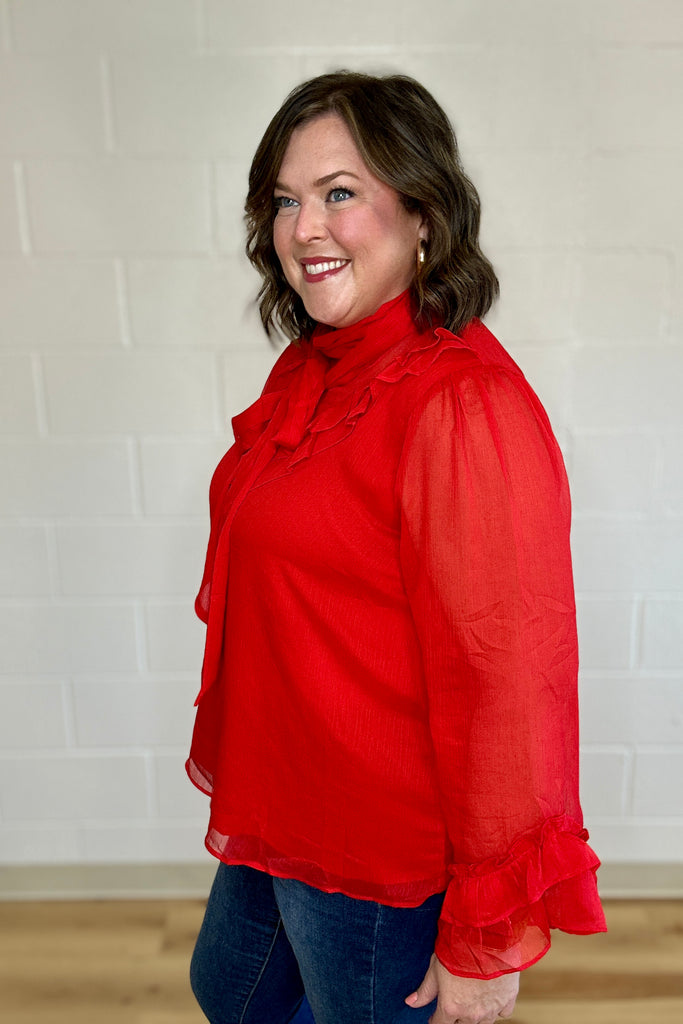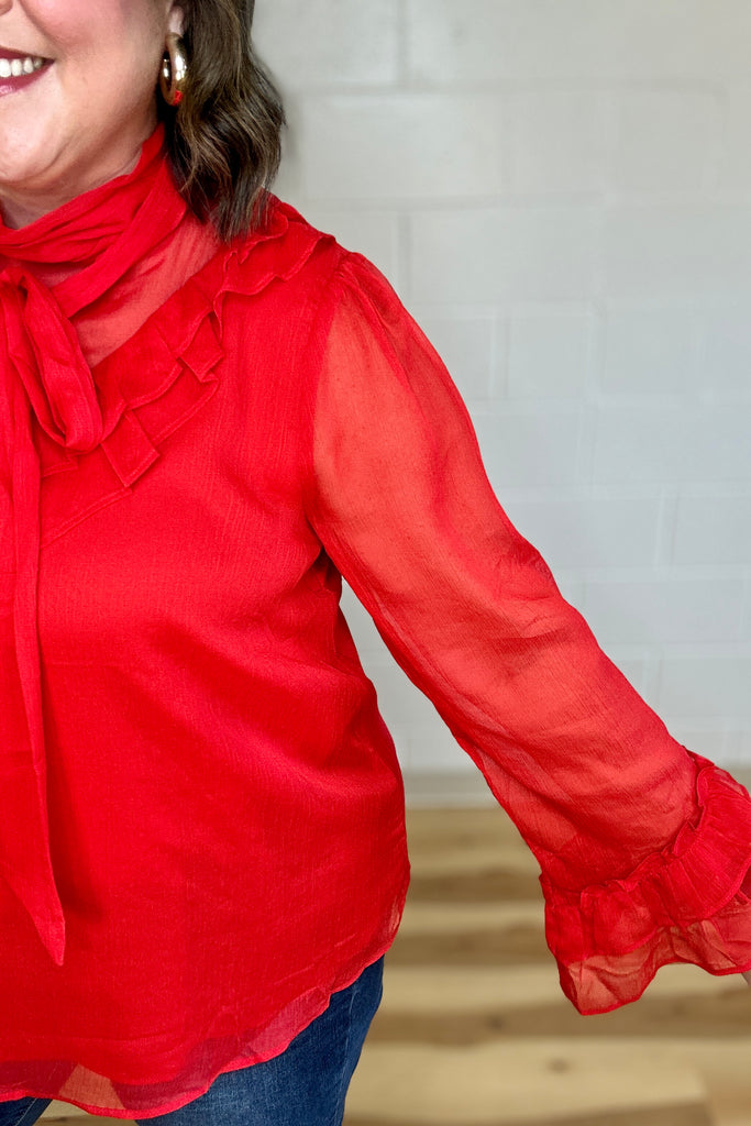 This sheer chiffon blouse from Oddi showcases a refined mock neck and a delicate ruffled yoke, adding subtle elegance to your look. The long sleeves are finished with graceful ruffles, enhancing its sophisticated silhouette. Perfect for elevating both professional and evening ensembles with a touch of timeless charm.