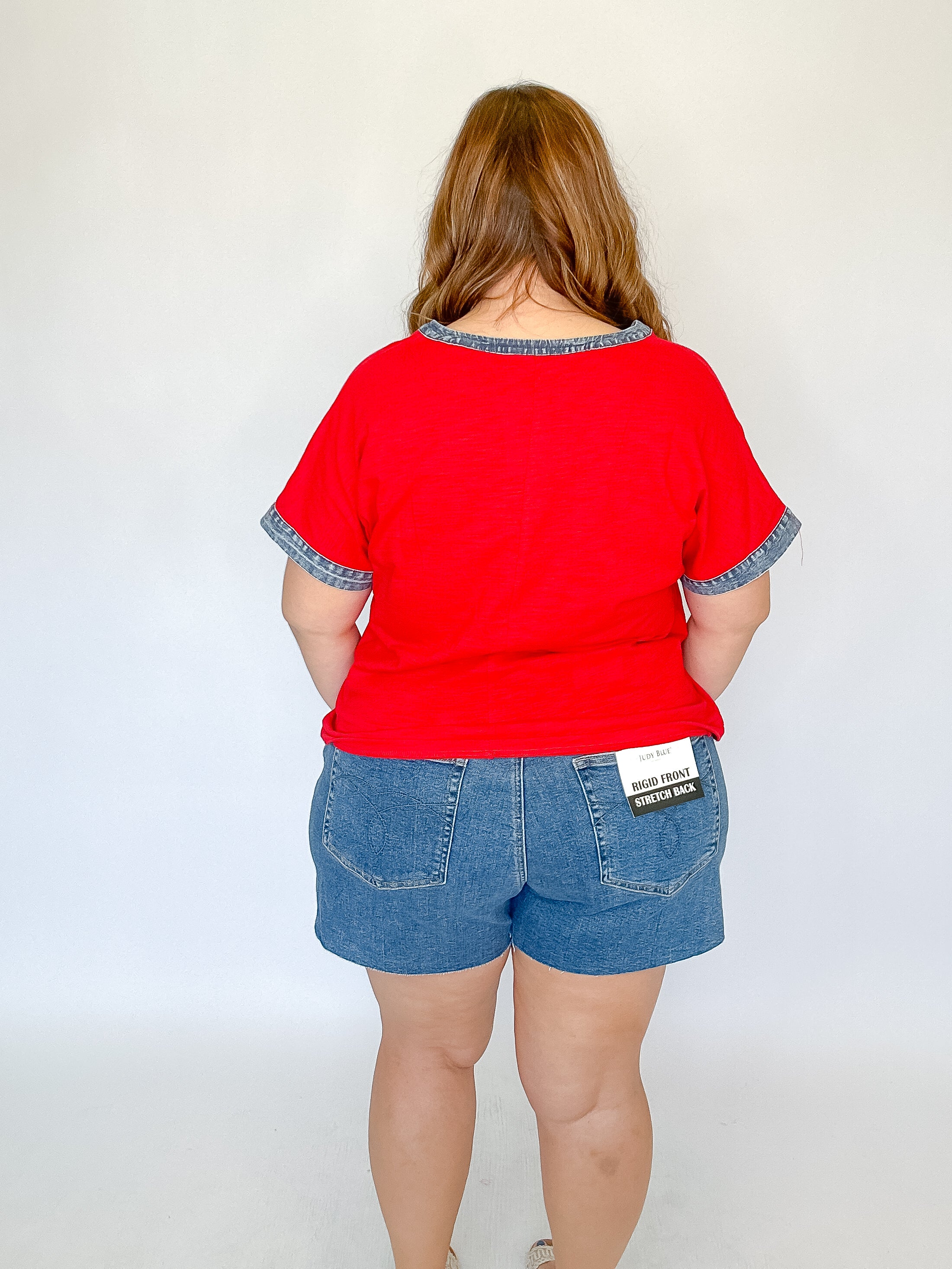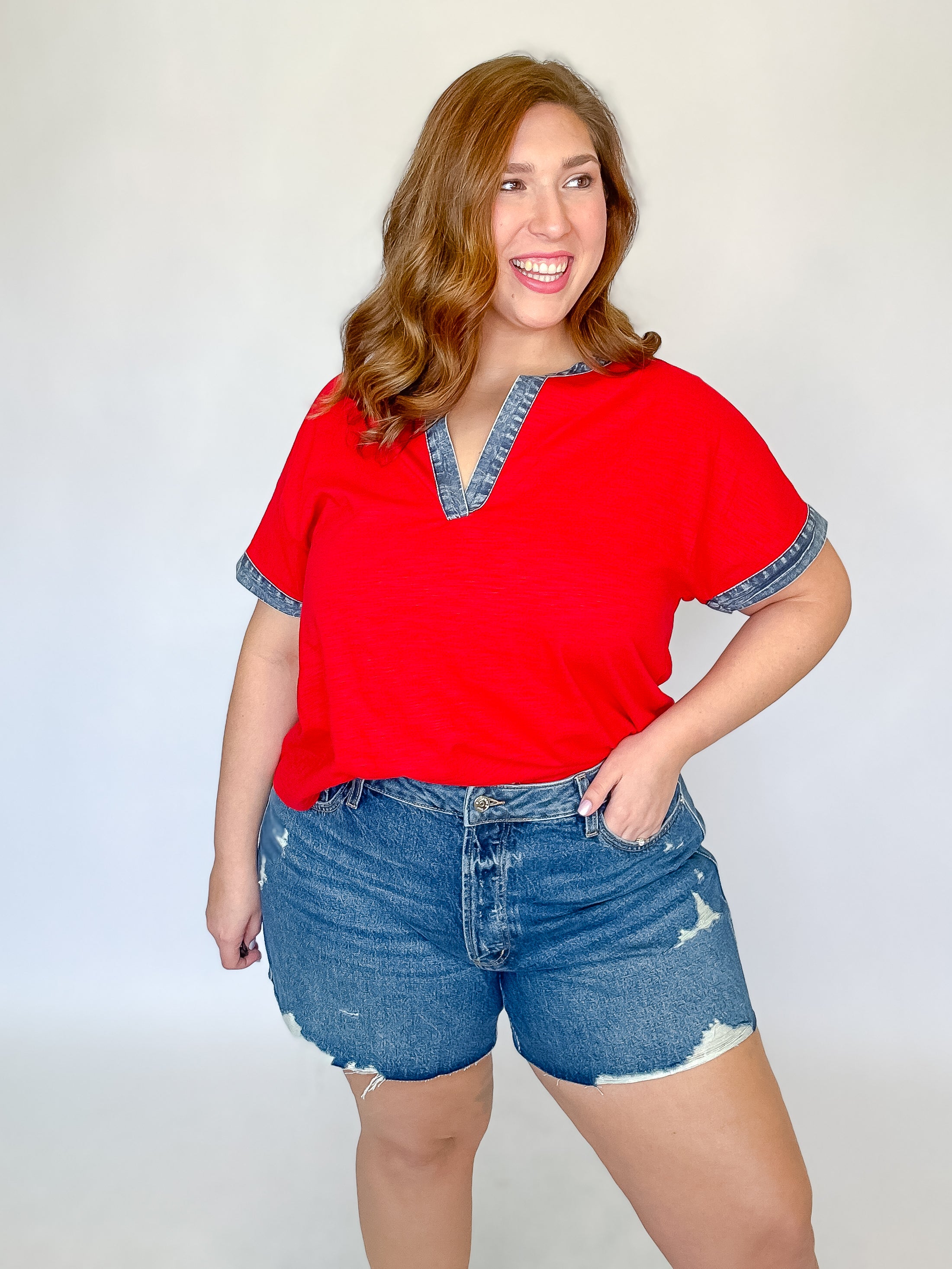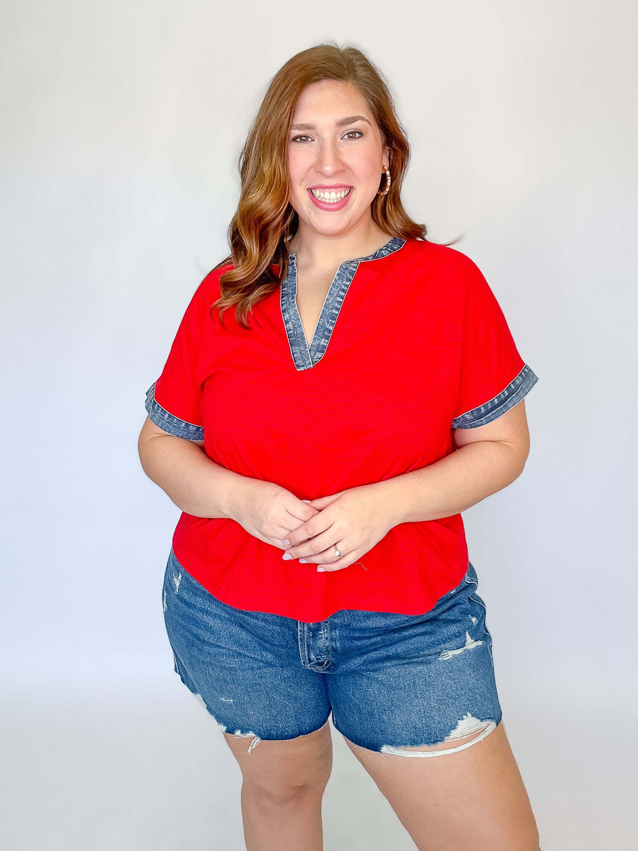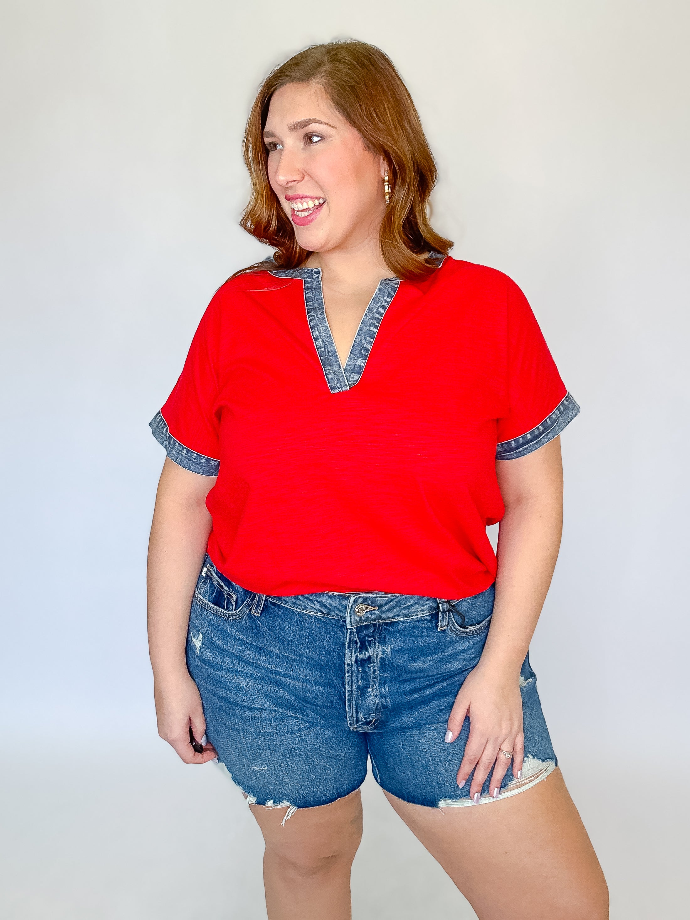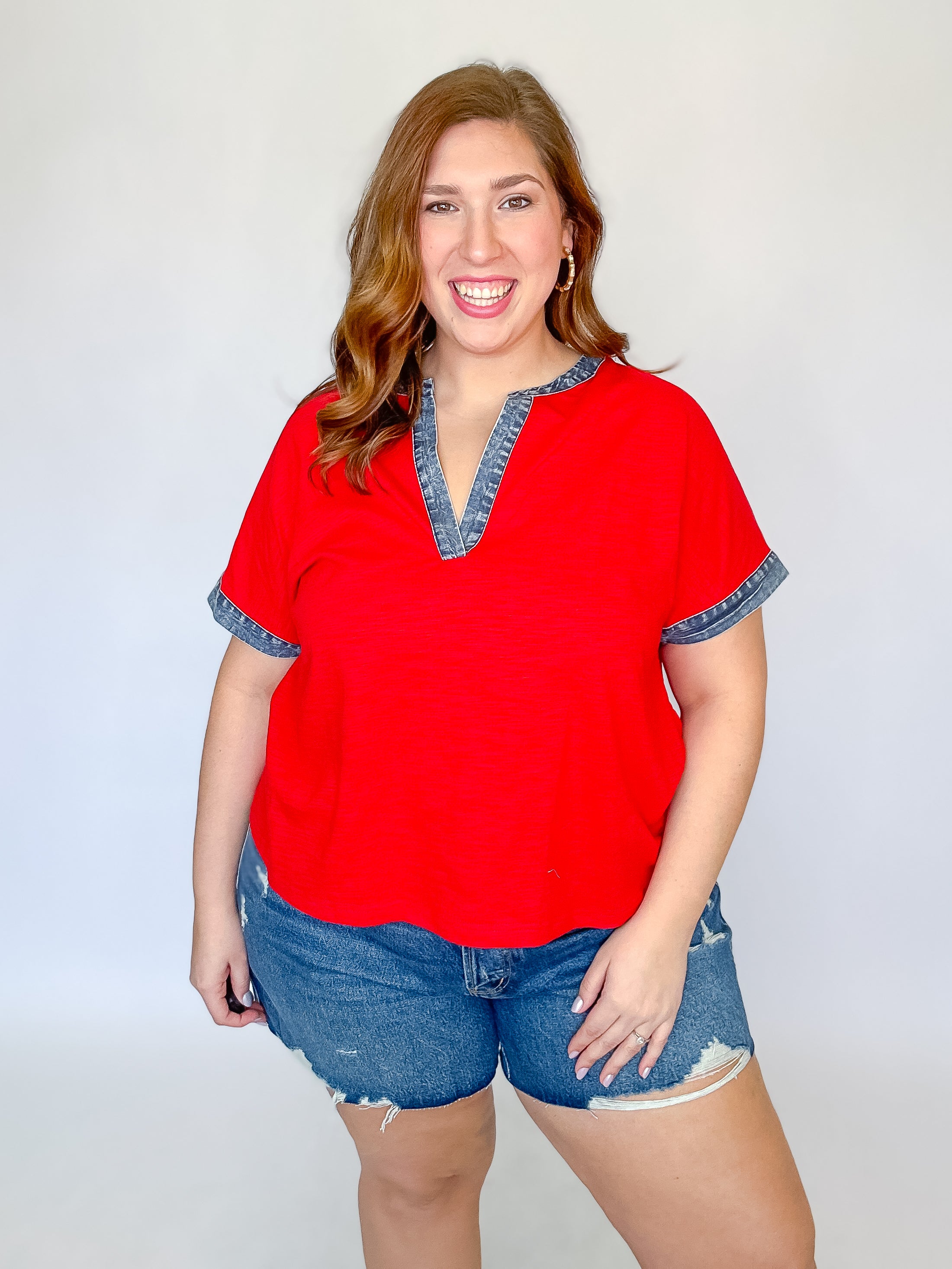 Red Denim Trim V-Neck Top