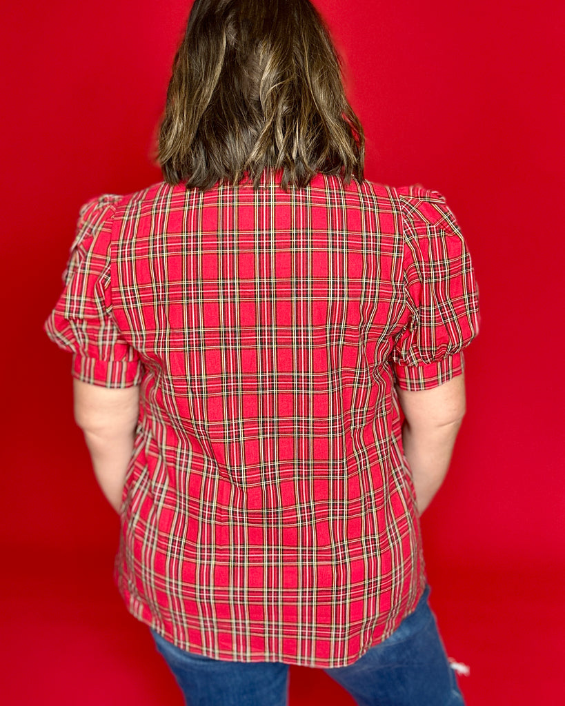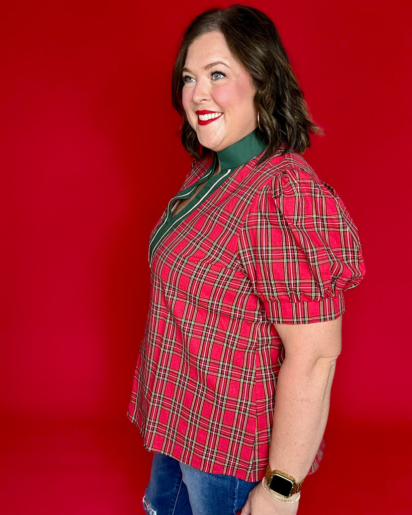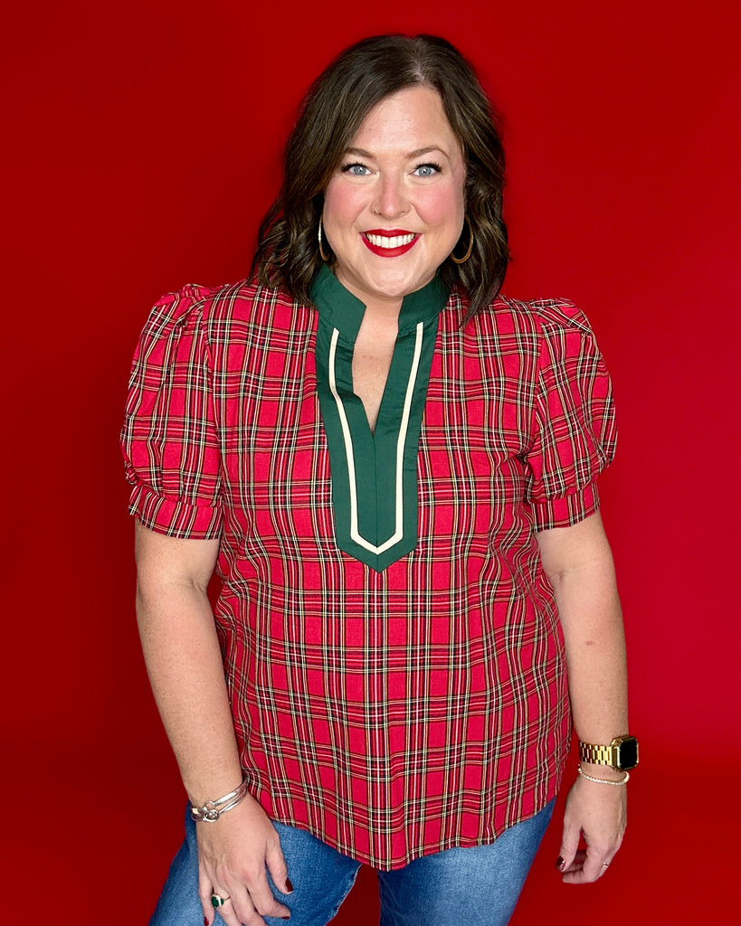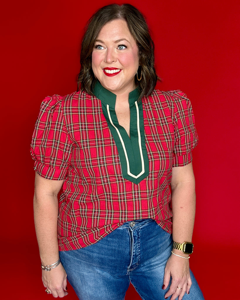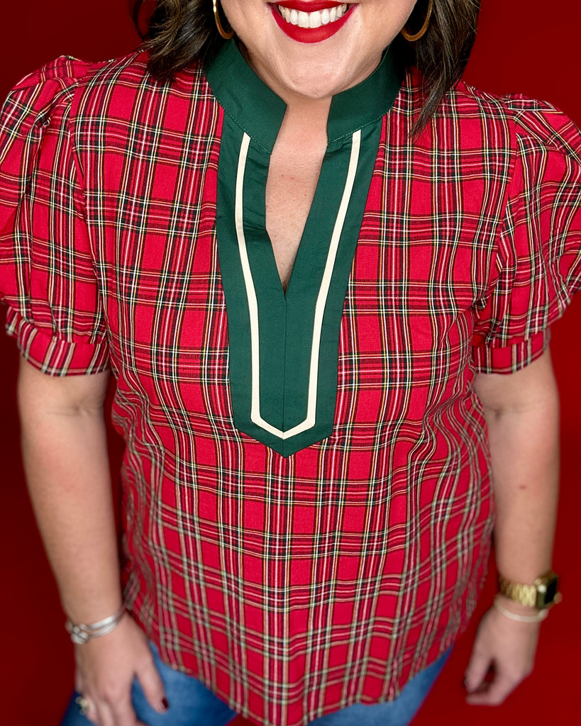 Add a splash of fun to your wardrobe with this Red Plaid Forest Green Accent Top by Entro. Featuring a playful plaid cuff band and a contrasting forest green caftan-inspired V-neck, this lightweight woven top keeps things breezy and bright. Unlined and non-sheer, it’s perfect for layering or wearing solo on sunny days.