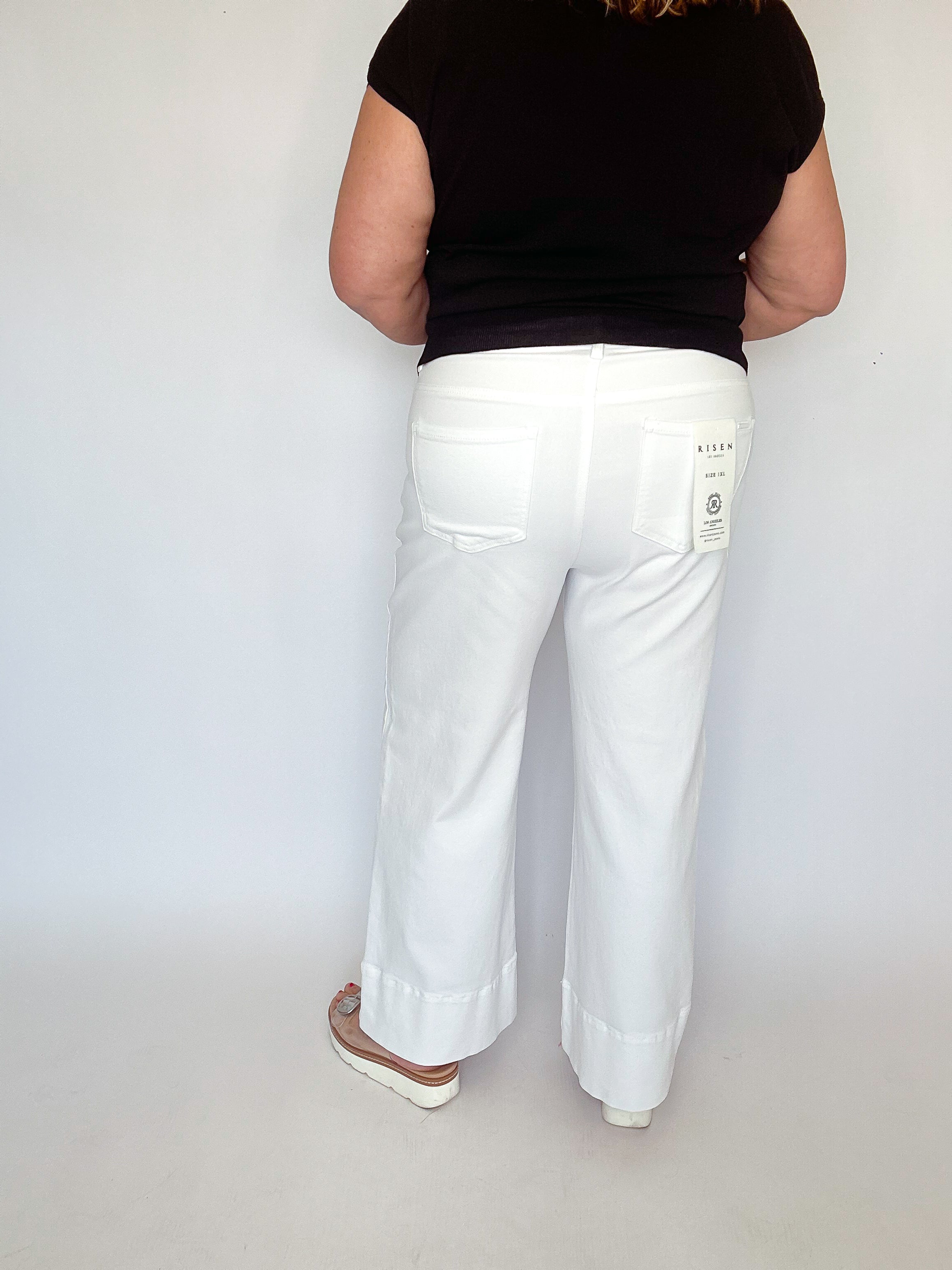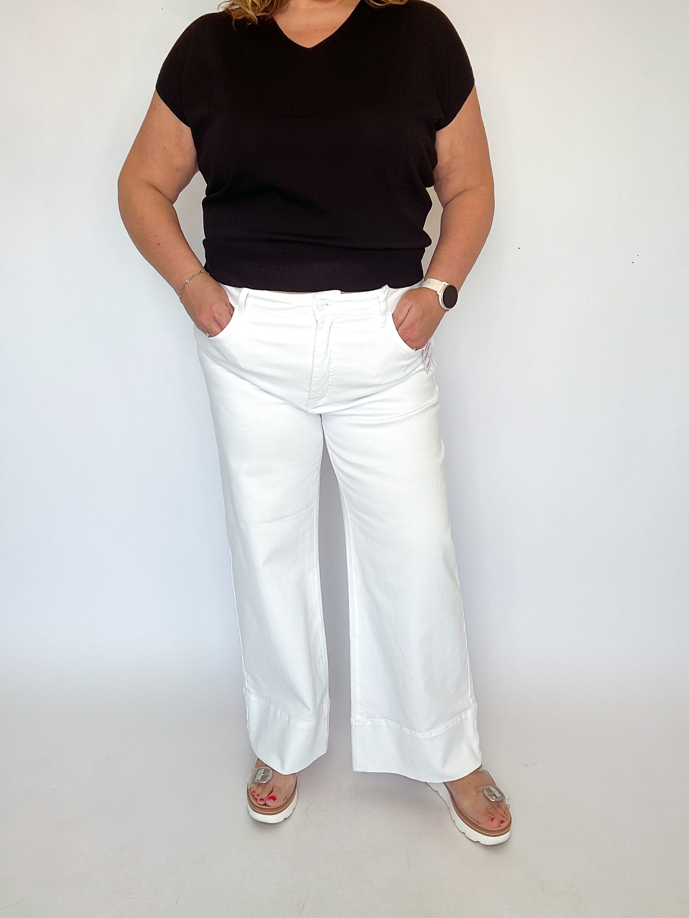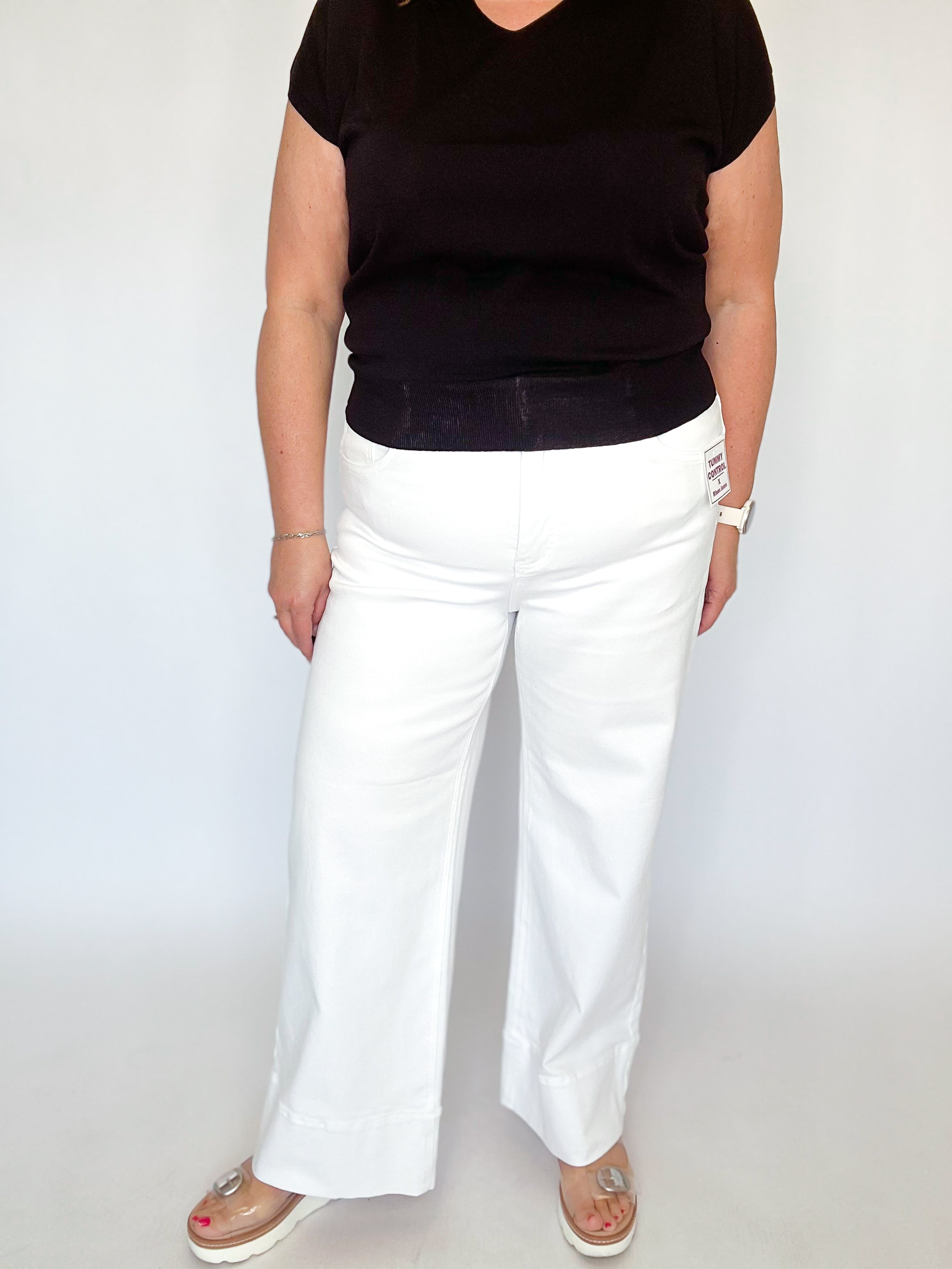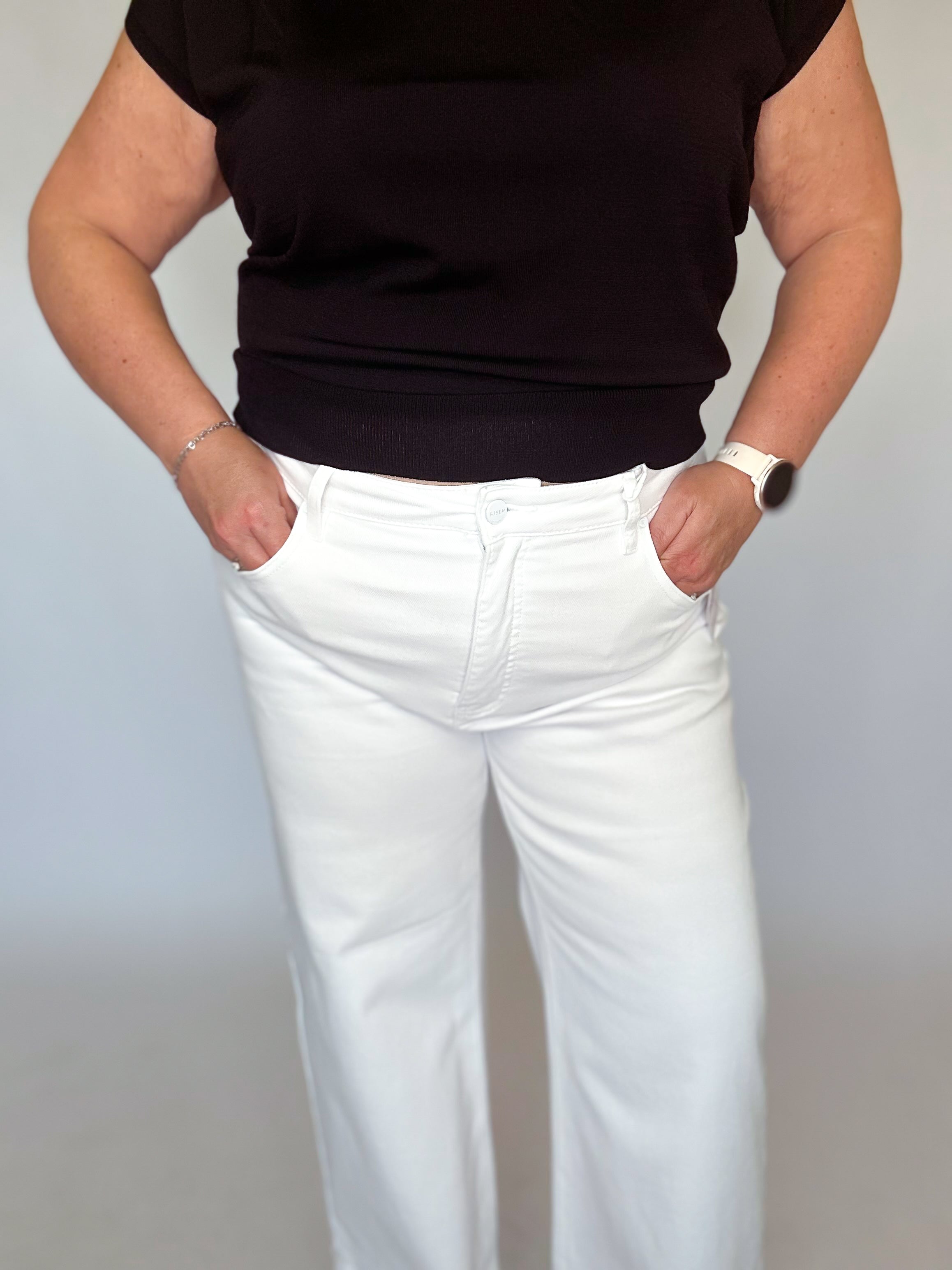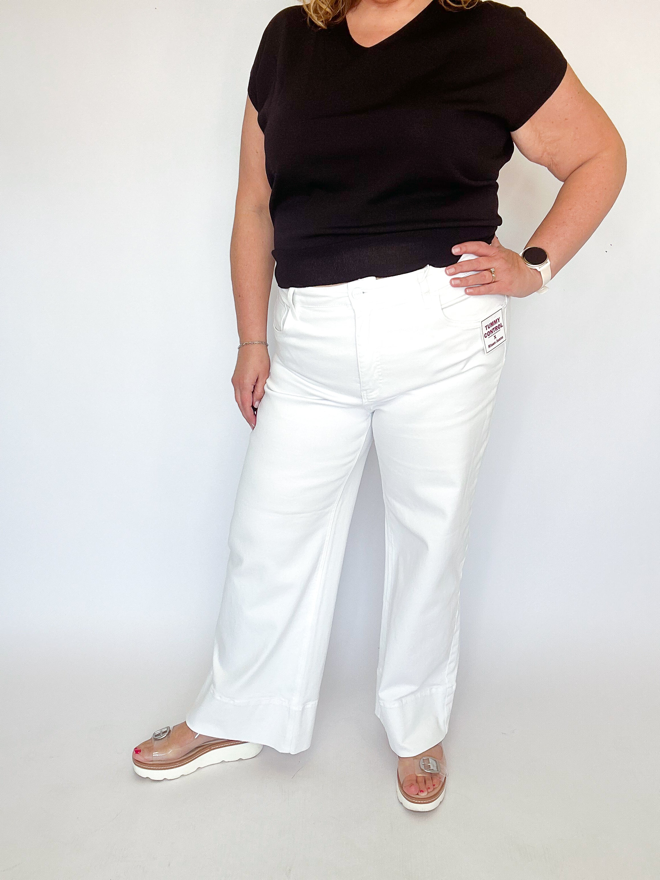 Clean, sleek, and endlessly wearable—these white high-rise wide leg jeans are a modern wardrobe must. Designed with built-in tummy control for a smooth, flattering fit, they hug in all the right places while keeping things comfortable. The crisp white wash and wide-leg silhouette create an effortlessly polished look that works day or night. Style them with fitted tanks, breezy blouses, or structured layers for an elevated take on everyday denim. Fresh, flattering, and fashion-approved