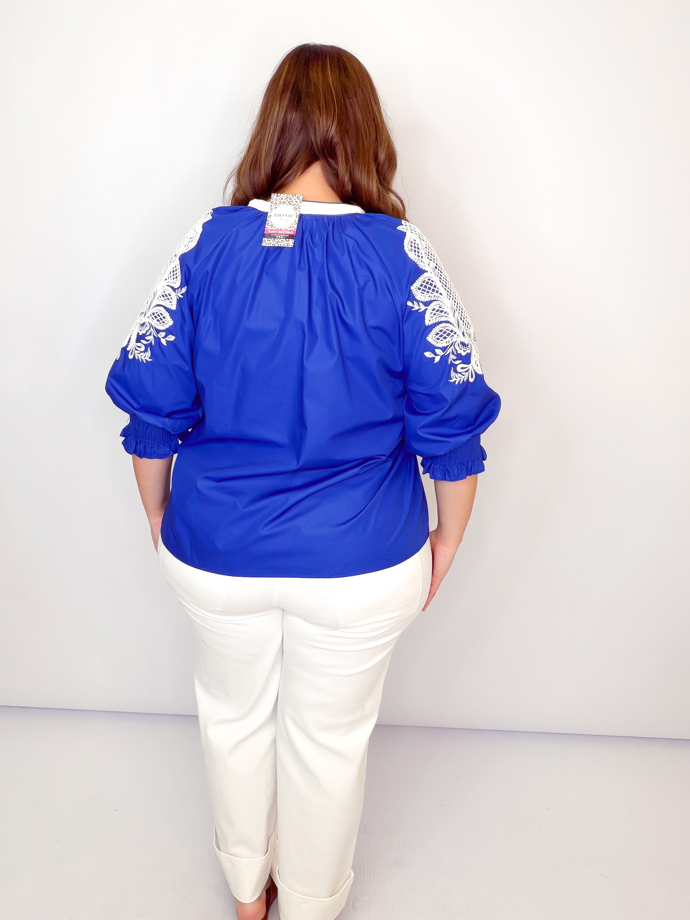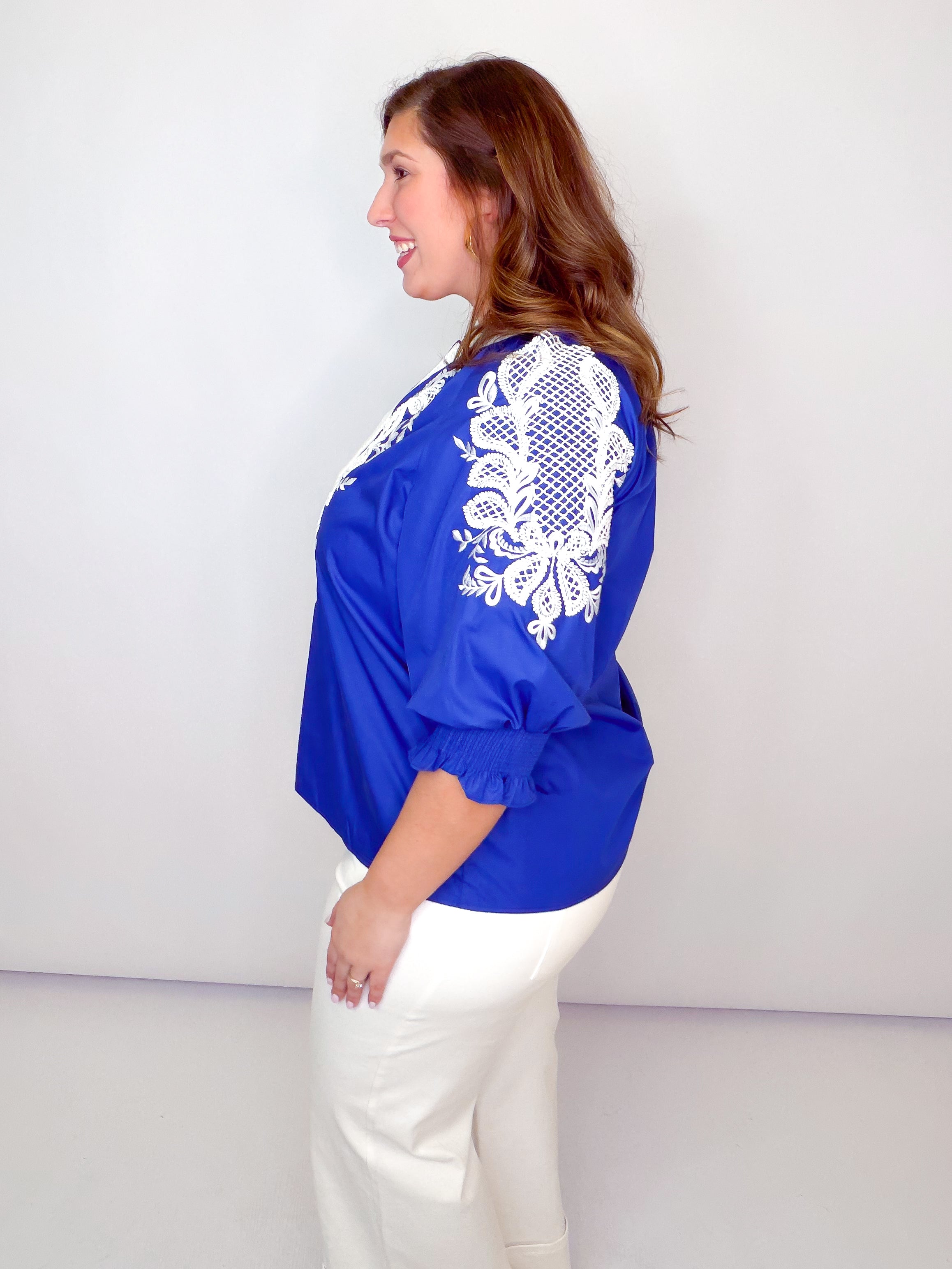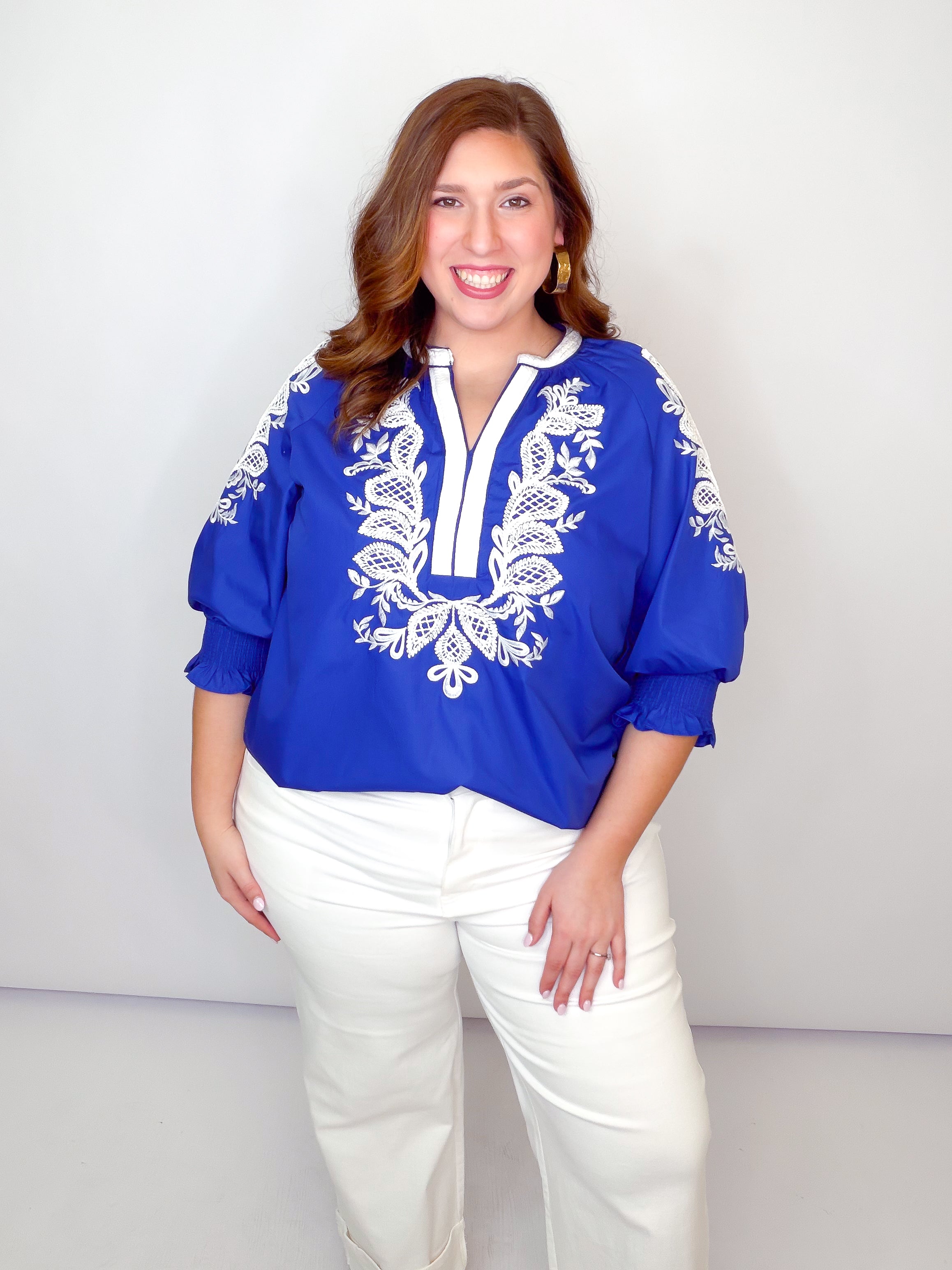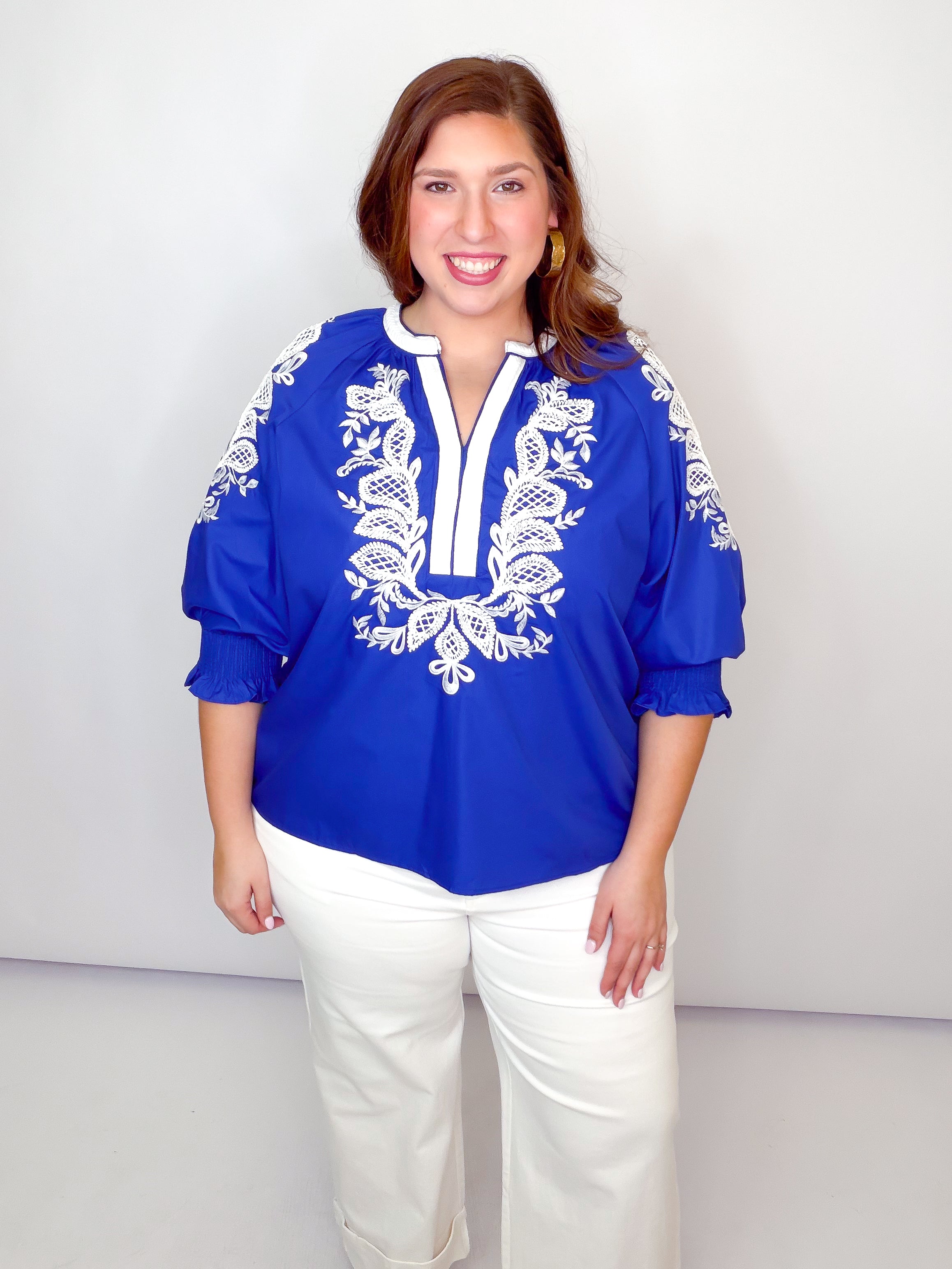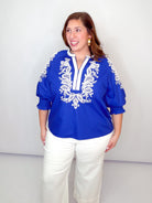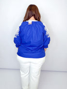 Royal & White Embroidered Smocked Sleeve Top