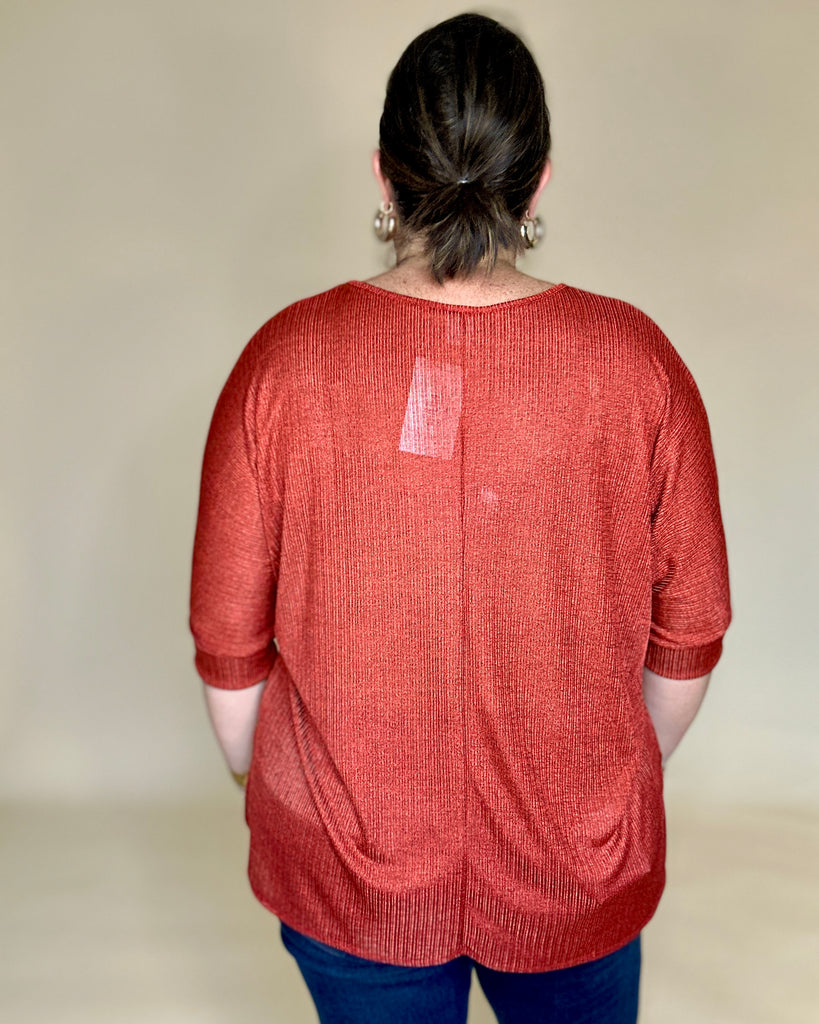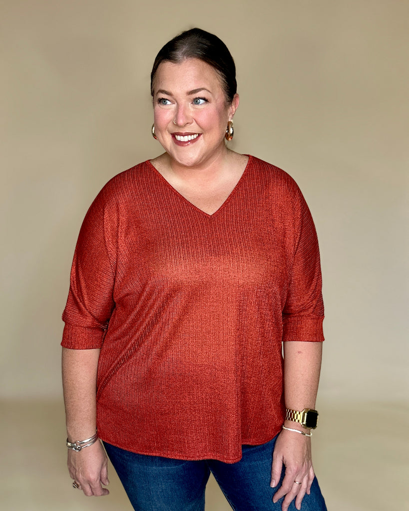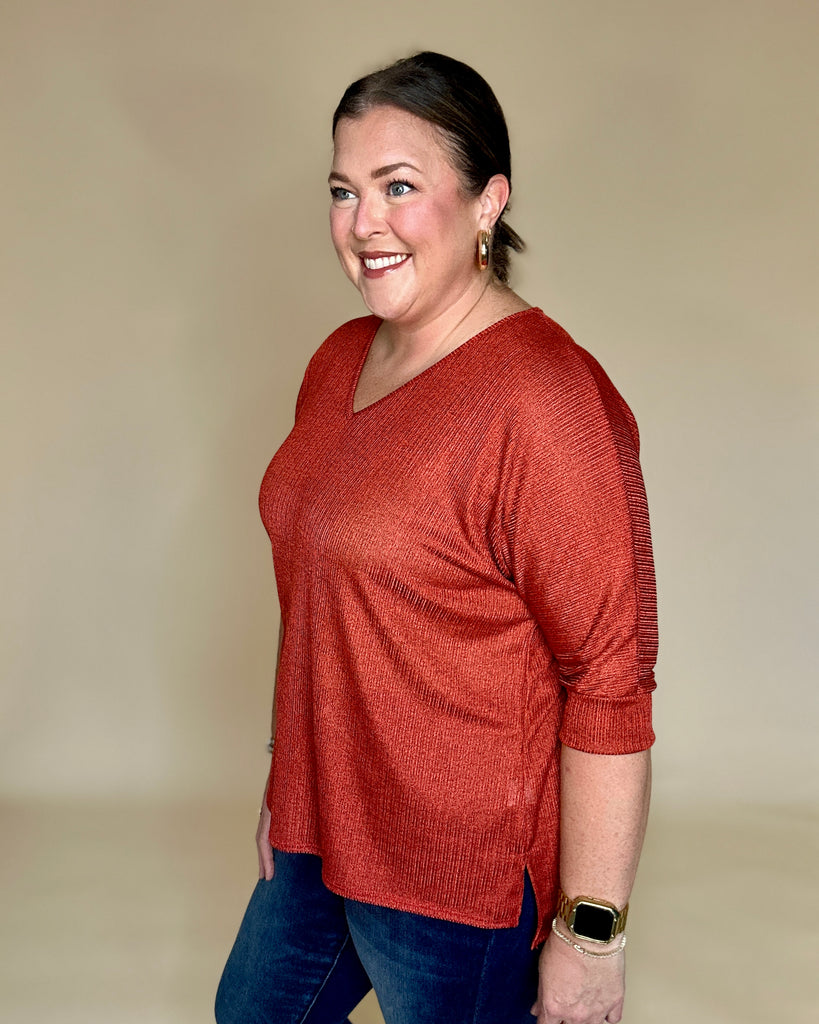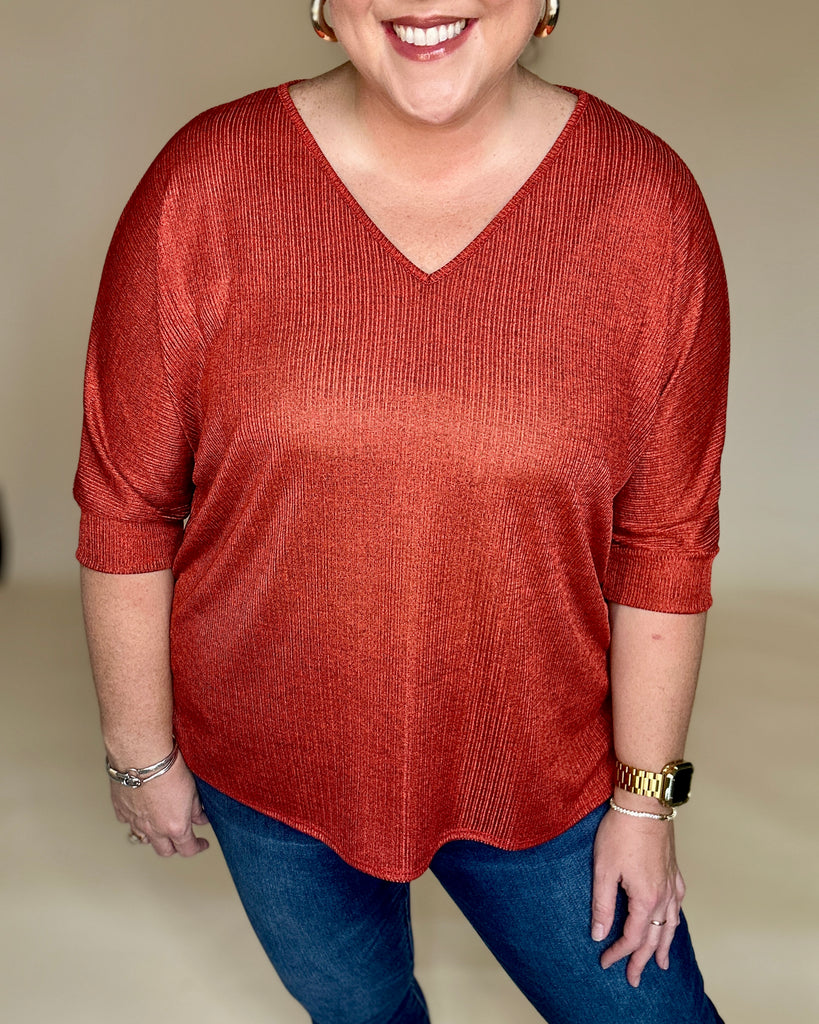 This Rust V-neck top combines a subtle textured fabric with short sleeves, offering a polished yet relaxed silhouette. Its delicate texture elevates your daily outfits, while the side slit and hi-low hem add a modern touch. Designed for comfort and versatility, it features a flattering neckline and breathable sleeves, ideal for both casual wear and professional environments.