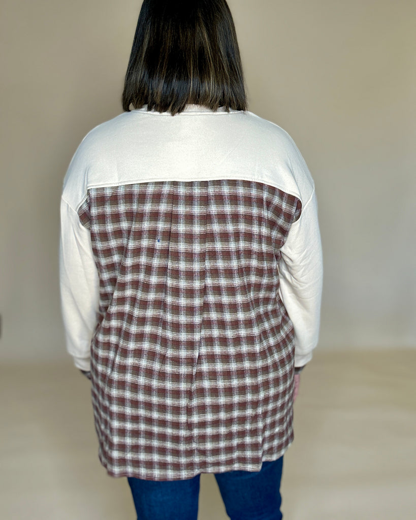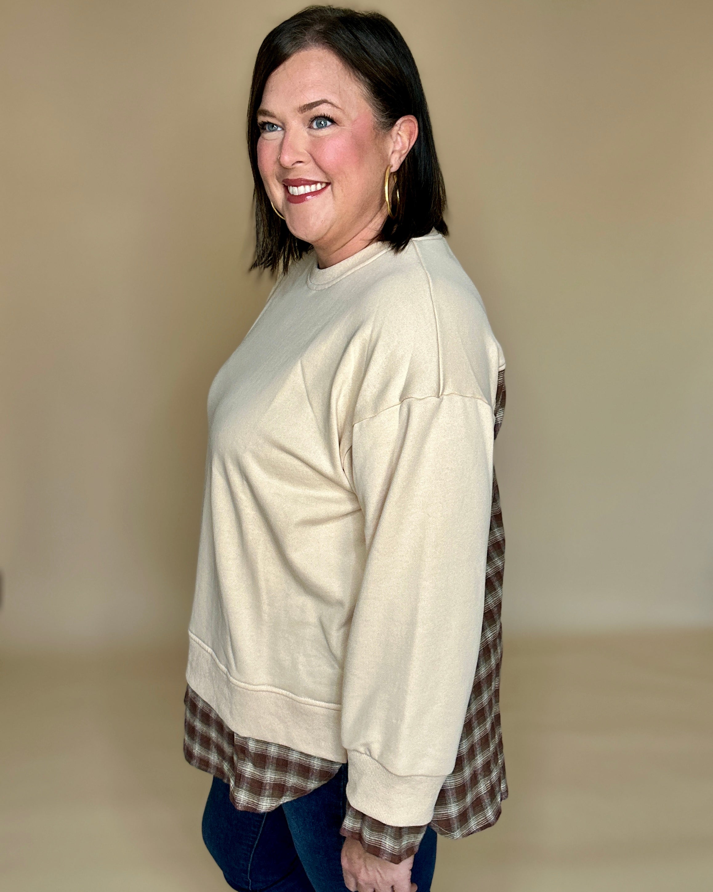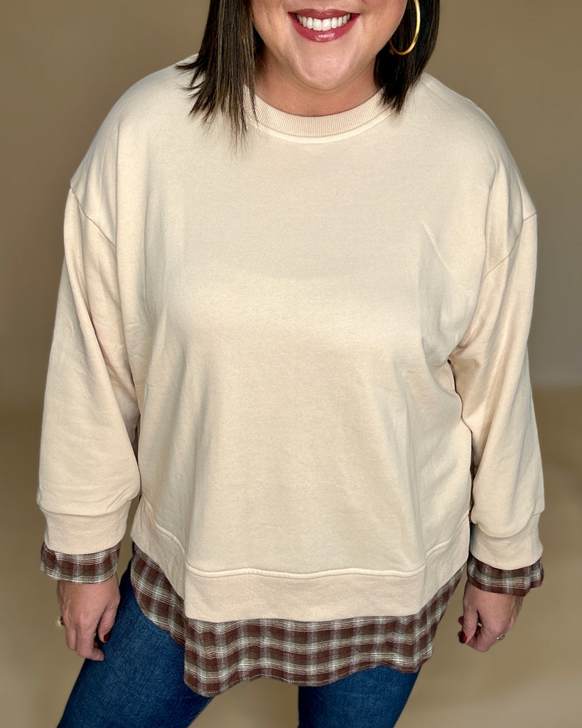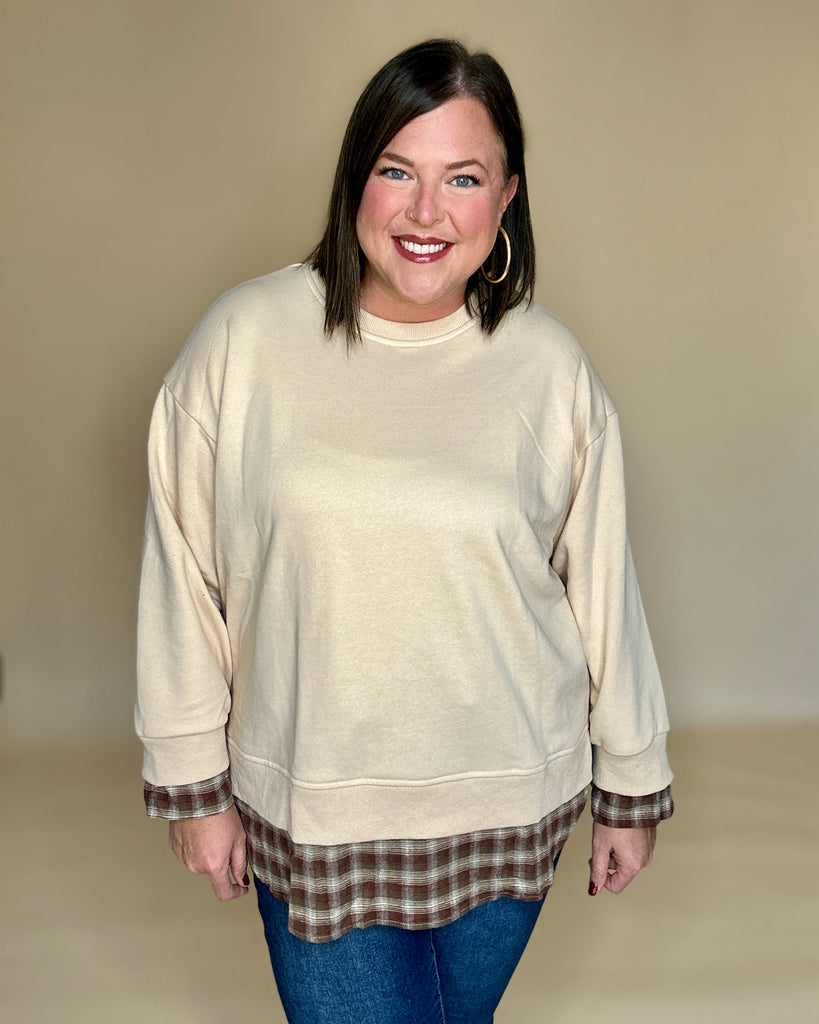 Cozy meets cool in this Taupe & Plaid Contrast Sweatshirt from She+Sky. The soft French terry knit keeps you comfy all day, while the playful plaid accents add a fun twist to your casual look. Perfect for layering or lounging, this long sleeve top brings a fresh vibe to your wardrobe with effortless style.