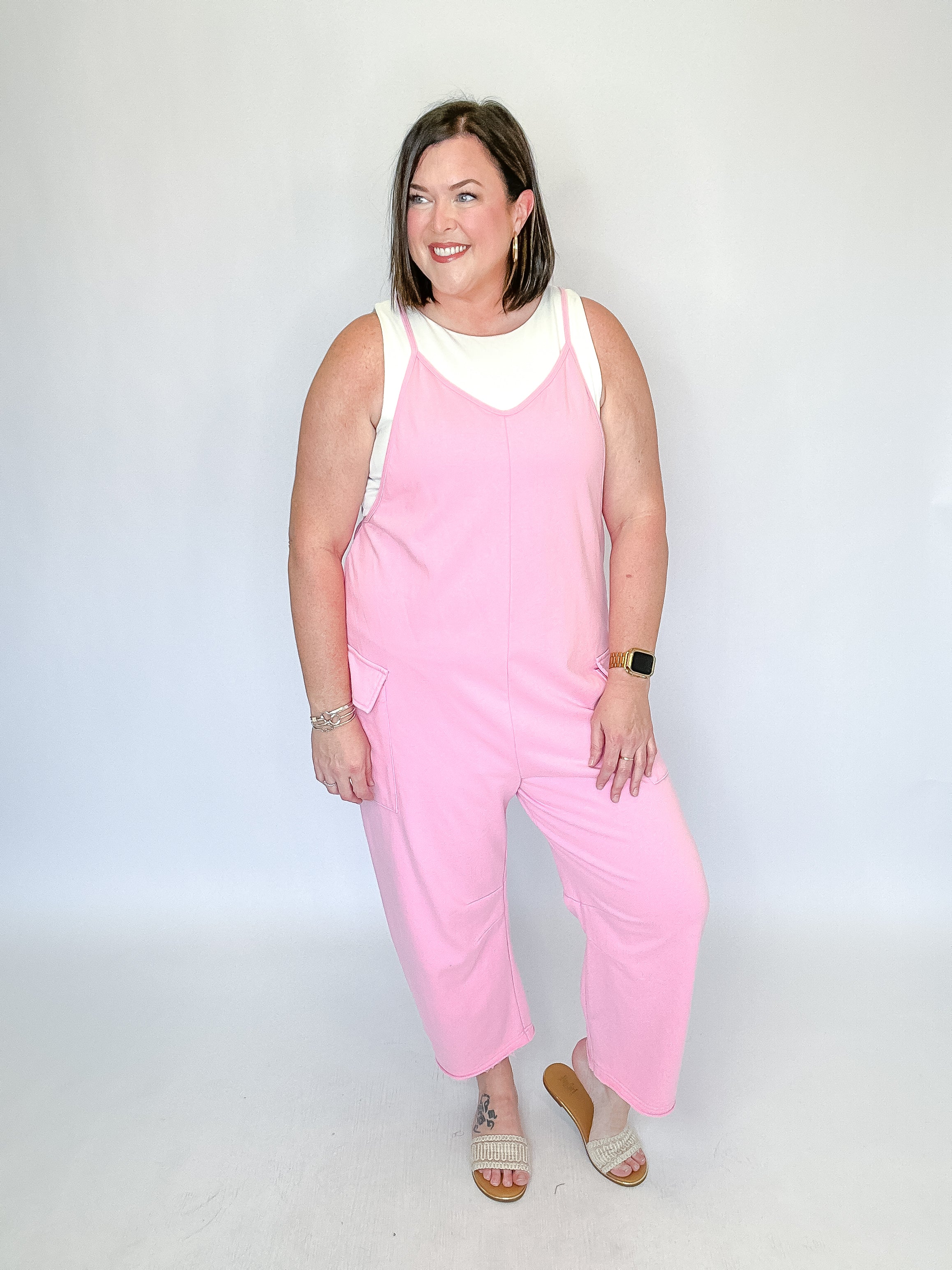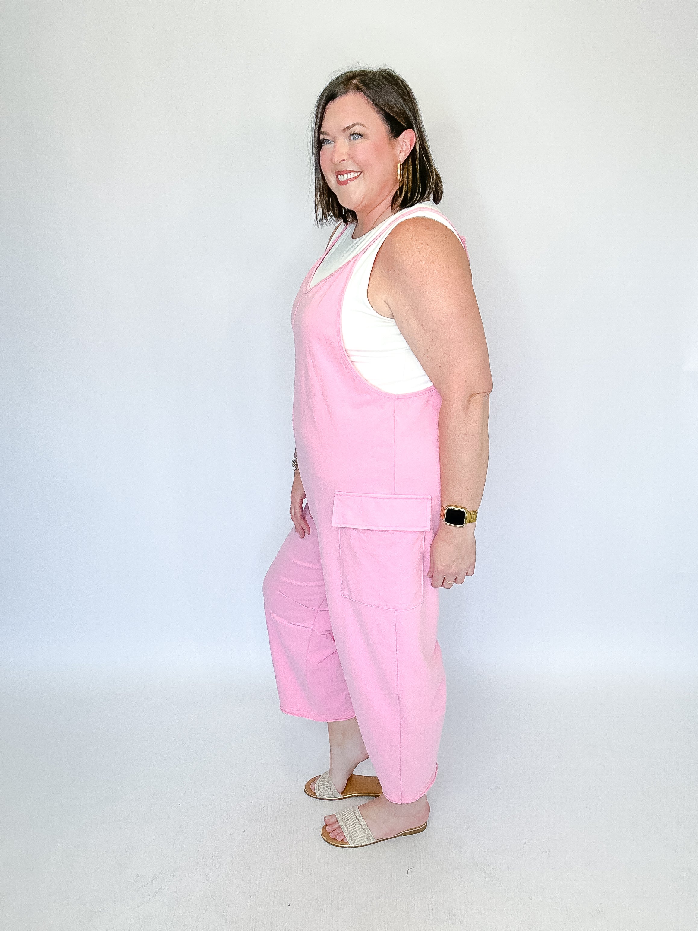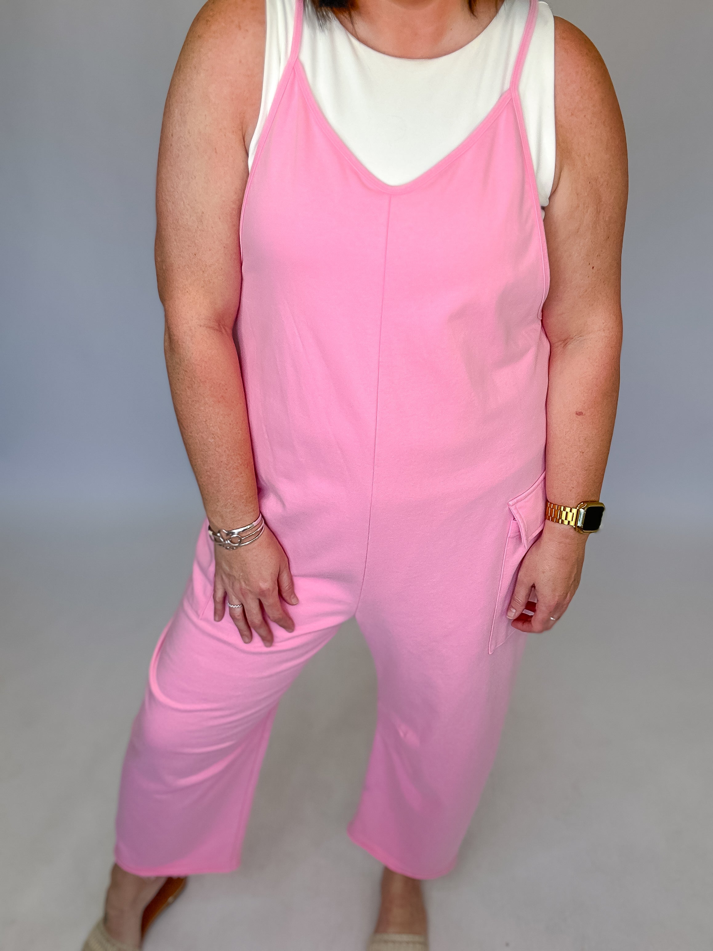 Casual comfort meets effortless style in this washed French terry sleeveless jumpsuit. Designed with adjustable shoulder straps for a customizable fit, this easy one-and-done piece features roomy side patch pockets and a relaxed barrel-leg silhouette for laid-back appeal. The soft, lived-in fabric makes it perfect for lounging, errands, or casual weekends, while the flattering drape keeps the look polished and modern. Simply layer over your favorite tee or tank for an effortlessly cool outfit.