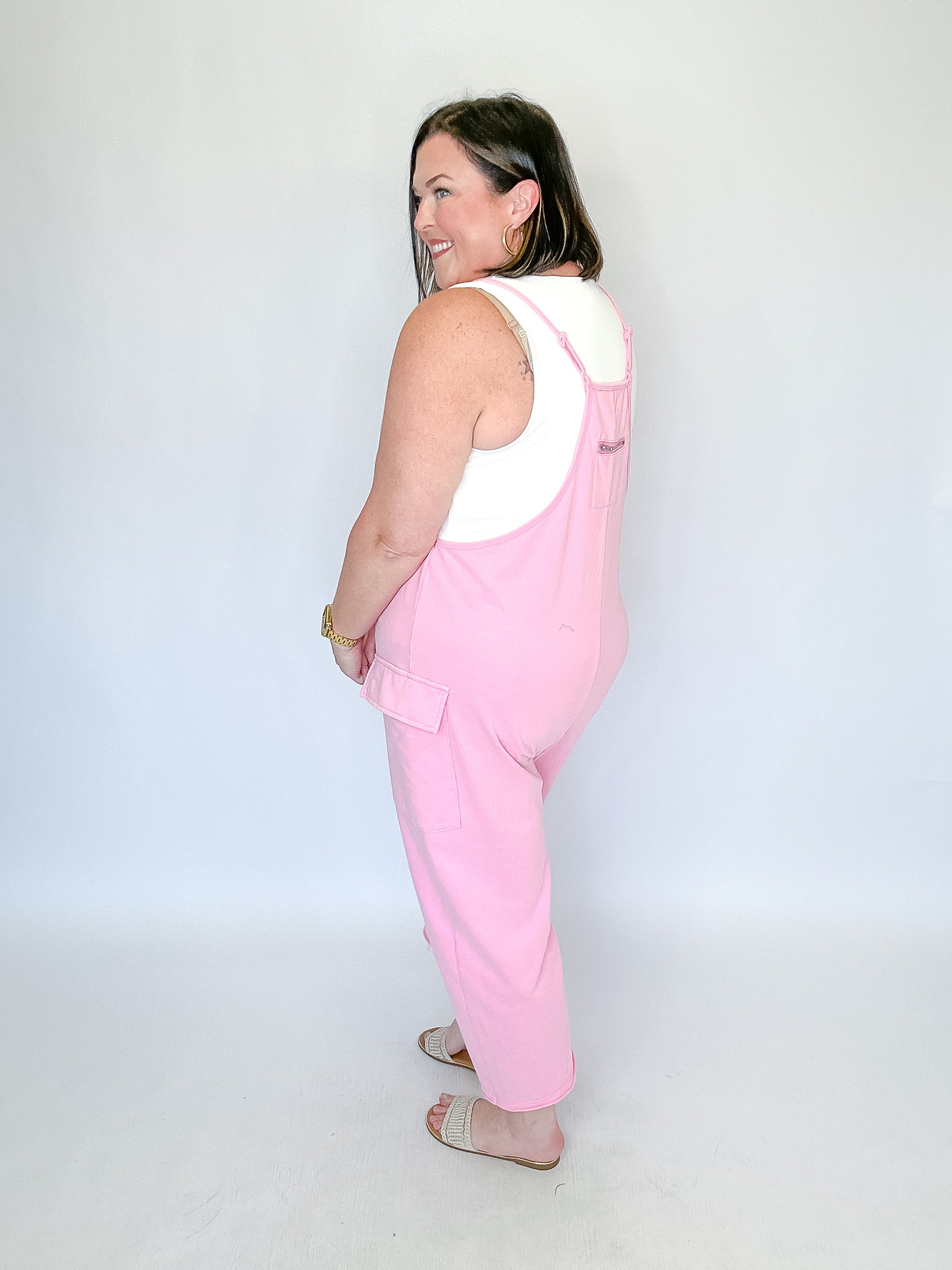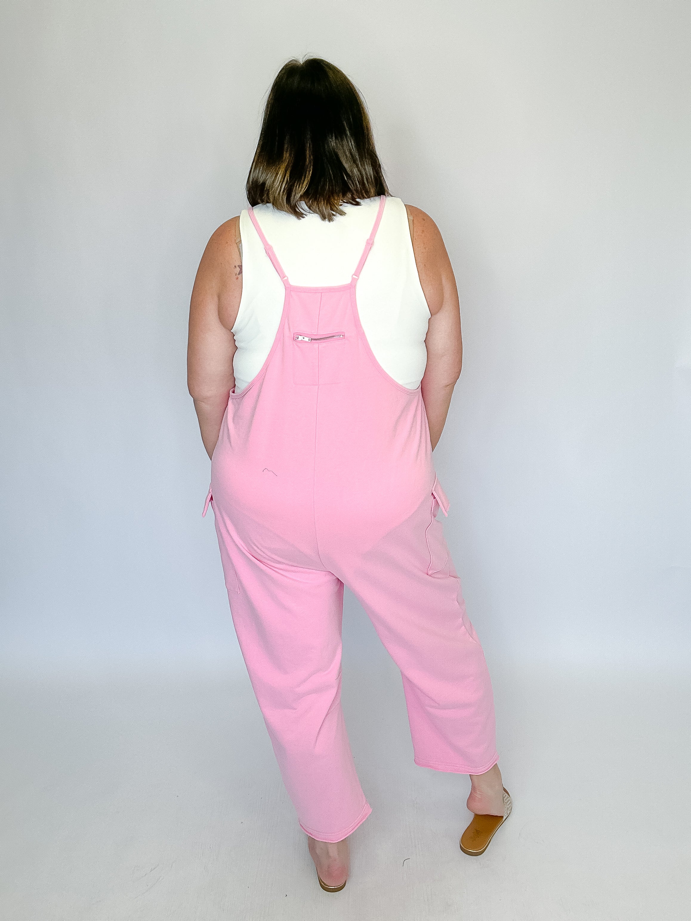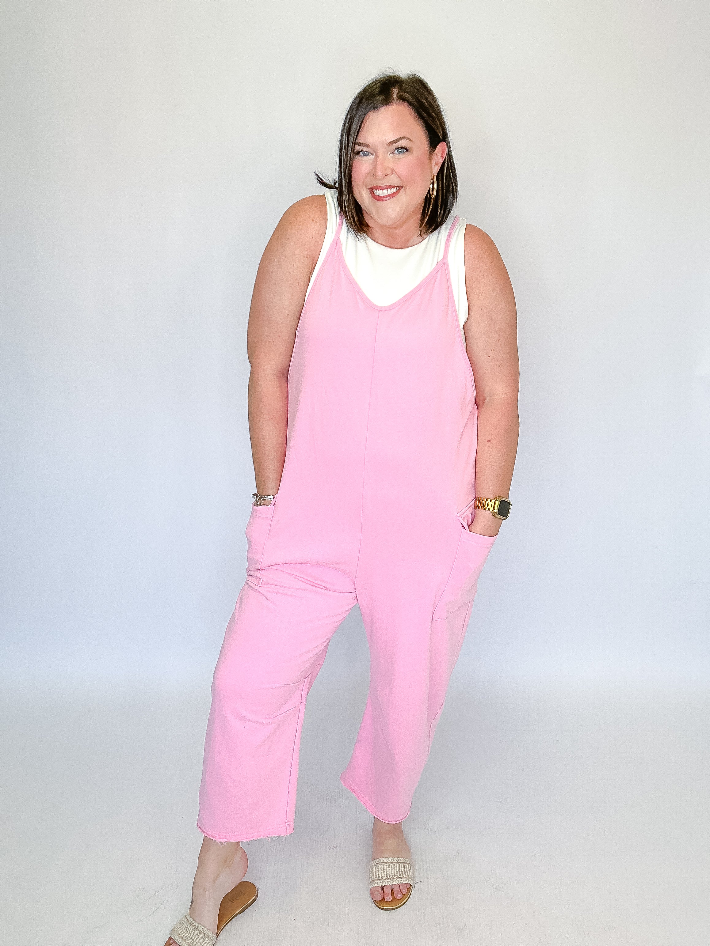 Casual comfort meets effortless style in this washed French terry sleeveless jumpsuit. Designed with adjustable shoulder straps for a customizable fit, this easy one-and-done piece features roomy side patch pockets and a relaxed barrel-leg silhouette for laid-back appeal. The soft, lived-in fabric makes it perfect for lounging, errands, or casual weekends, while the flattering drape keeps the look polished and modern. Simply layer over your favorite tee or tank for an effortlessly cool outfit.