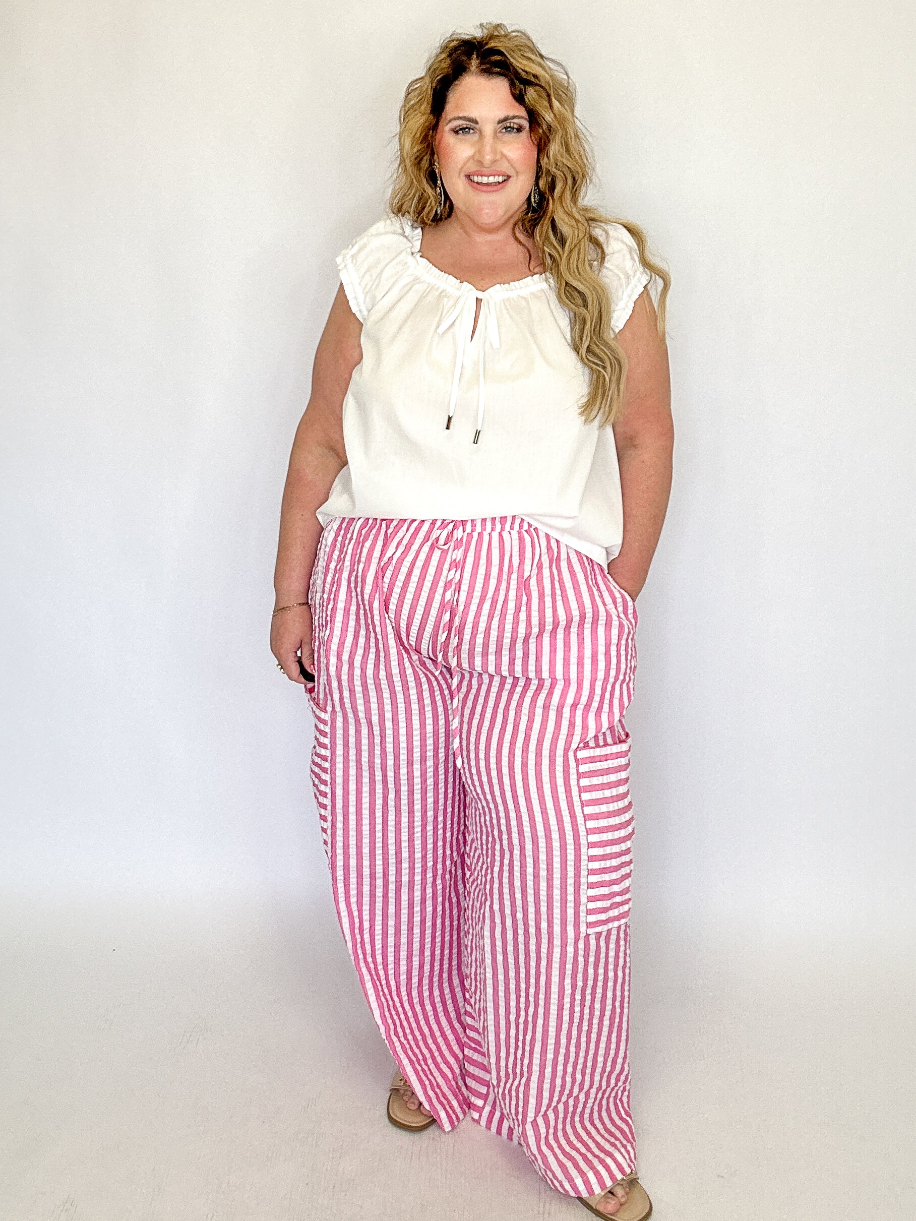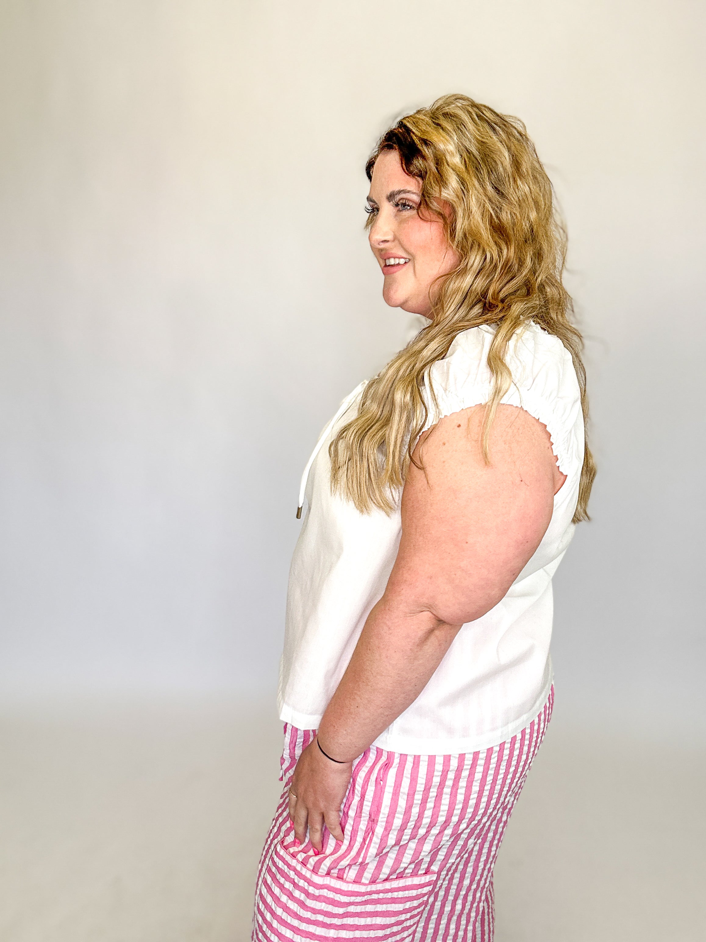 Clean, classic, and effortlessly feminine, this solid poplin blouse is a timeless addition to any wardrobe. Designed with a gathered yoke for subtle texture and dimension, it features a delicate tie-front detail that adds a soft, romantic touch. The cap sleeves offer just the right amount of coverage, while the relaxed silhouette drapes beautifully for all-day comfort.