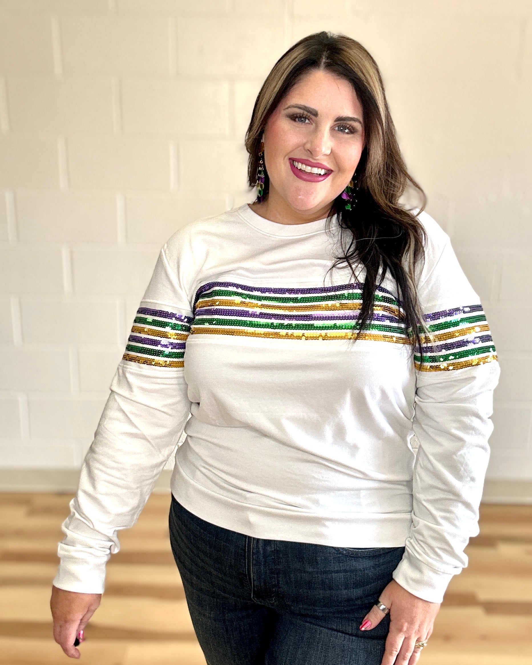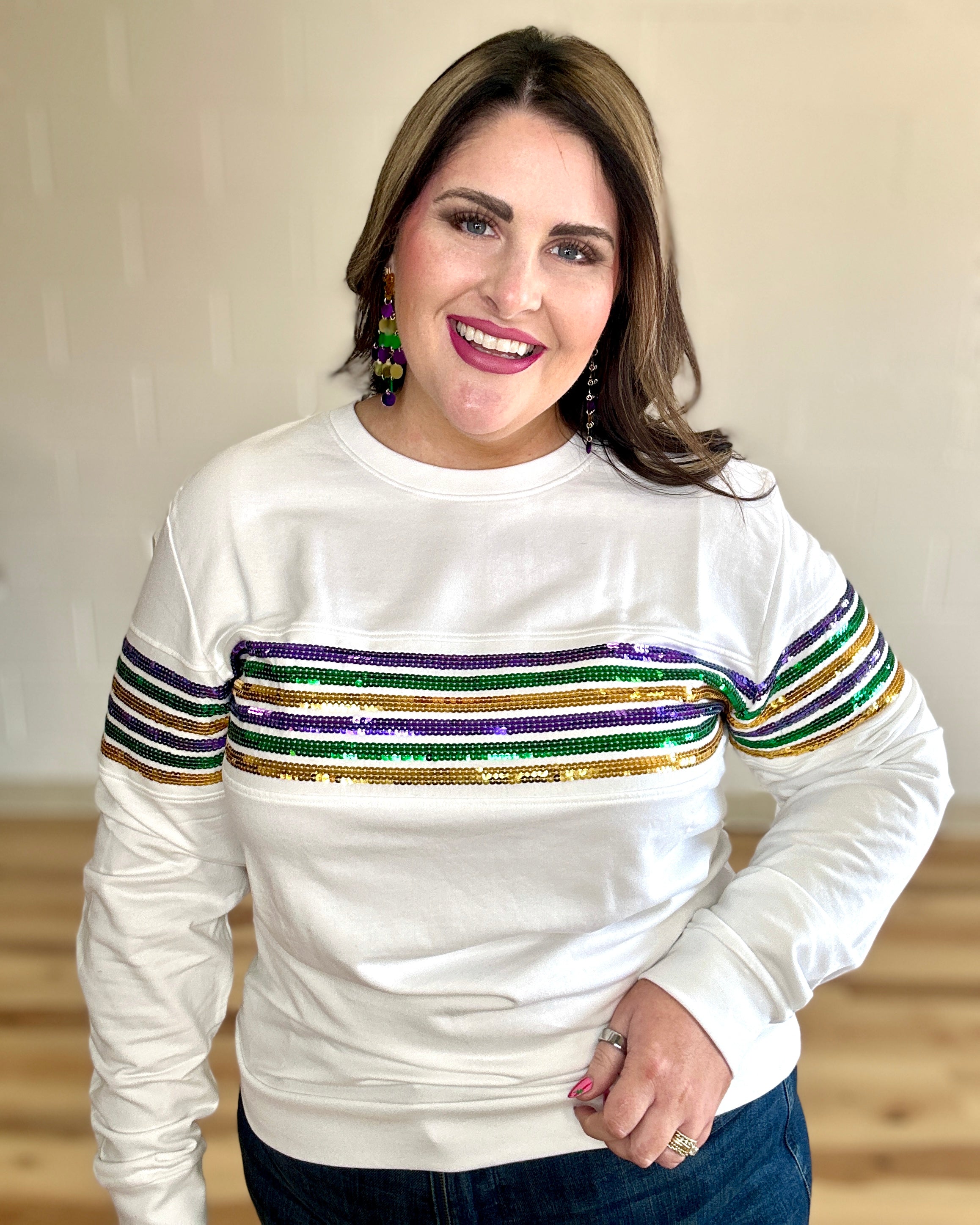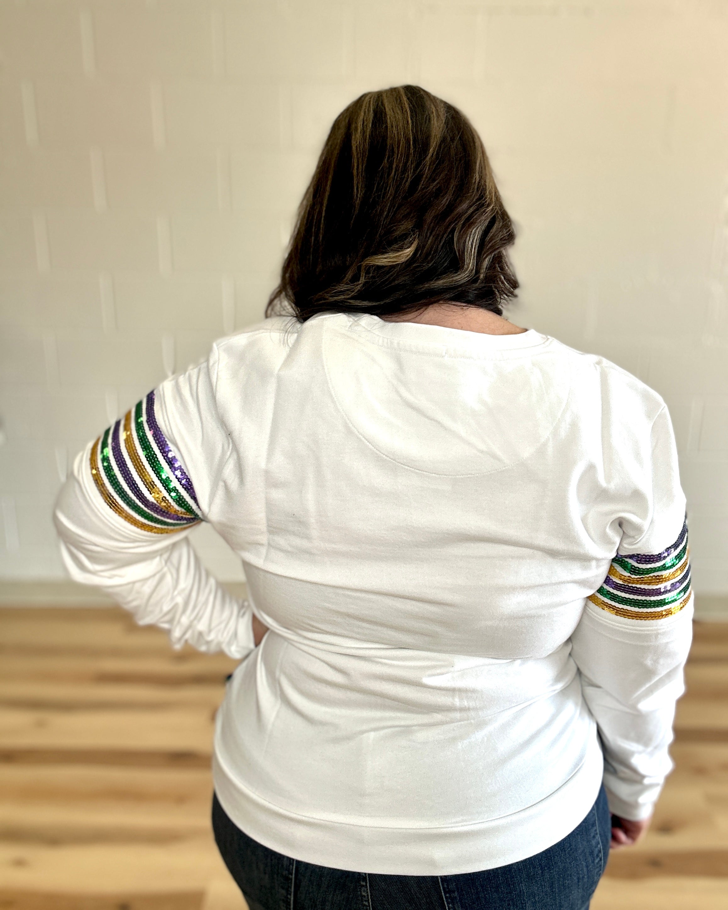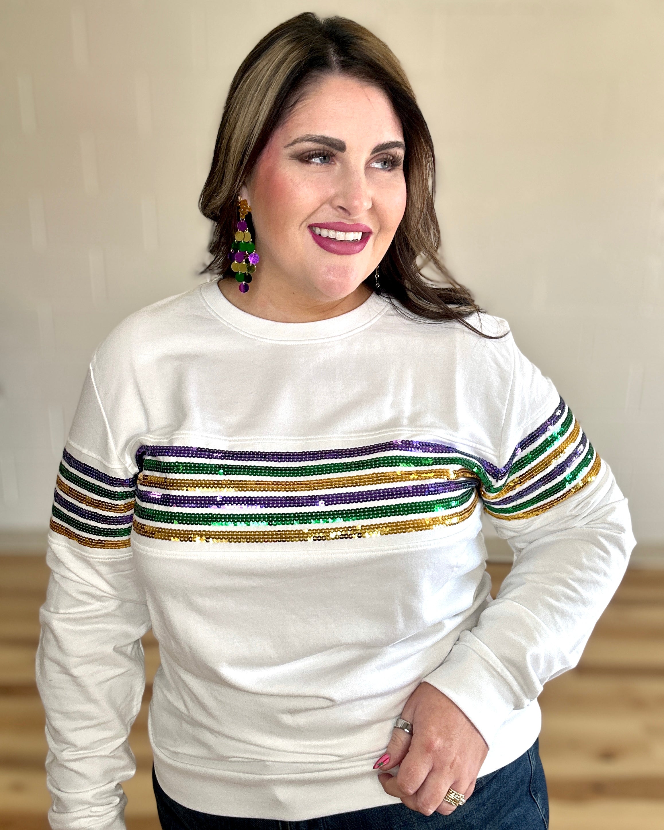 Cannot get enough of our sequin French Terry pullovers!! Celebrate Mardi Gras with this fabulous long sleeved top! This is french terry material with classic purple green & gold sequin stripes across the chest. Crew neck with purple, green, gold sequin stripes across the arms. This one is sure grab attention wherever you go!