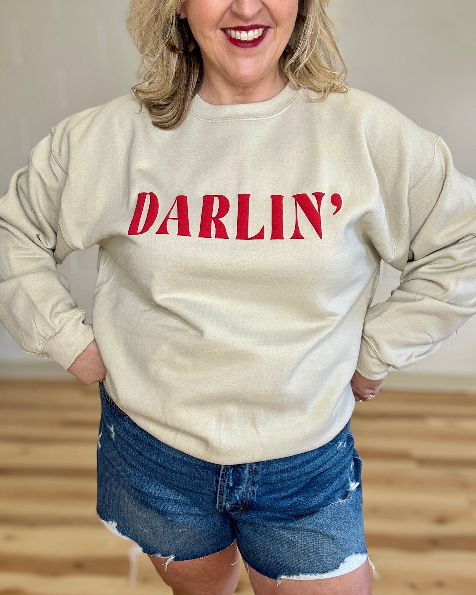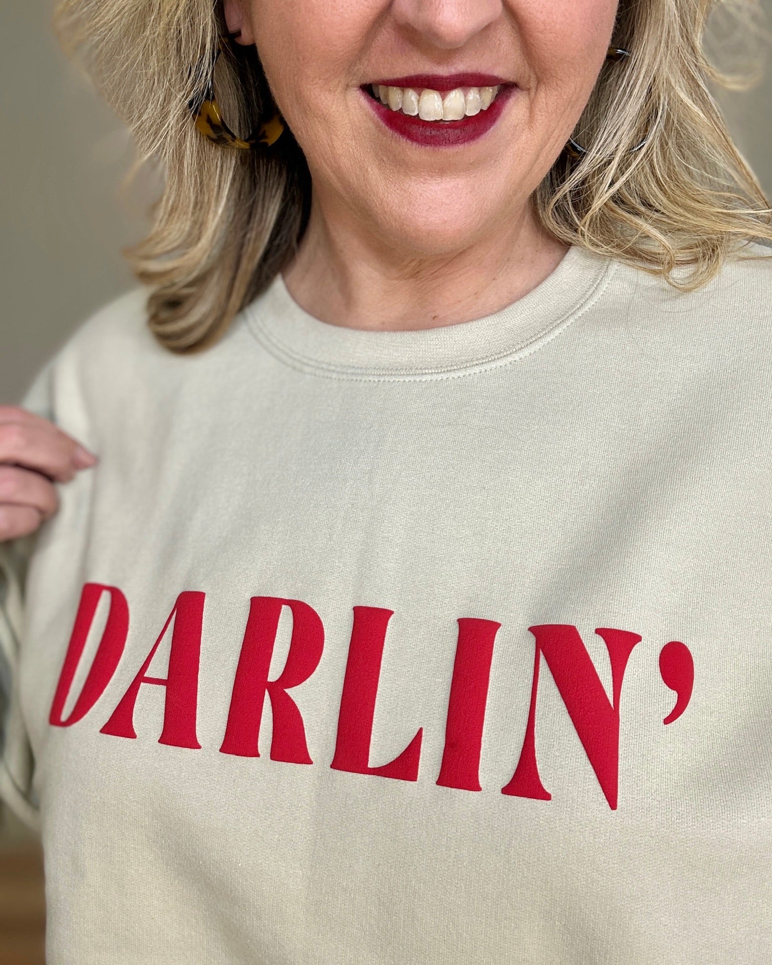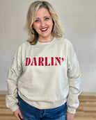Elevate your everyday comfort with our "Darlin" Oversized Puff Print Sweatshirt. This isn't just another pullover; it features a vibrant red 3D puff-texture graphic that adds a pop of Southern charm to a classic neutral tan base. Designed with a generous, relaxed fit and crafted from ultra-soft fabric, it’s the ultimate "grab-and-go" piece for coffee runs, weekend lounging, or casual dates. Specifically curated for a flattering fit in sizes XL-3X, this sweatshirt proves you never have to choose between cozy and cute.