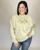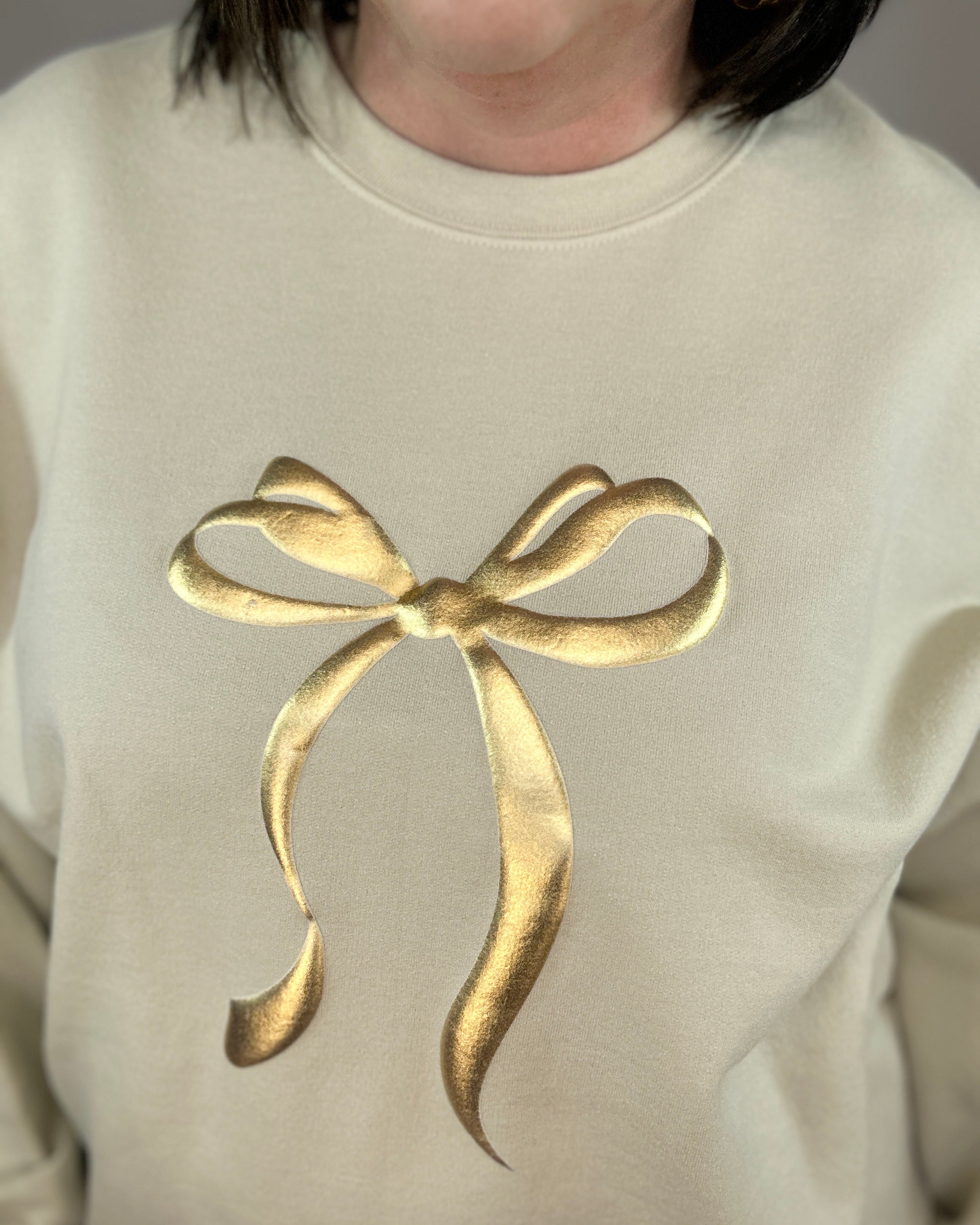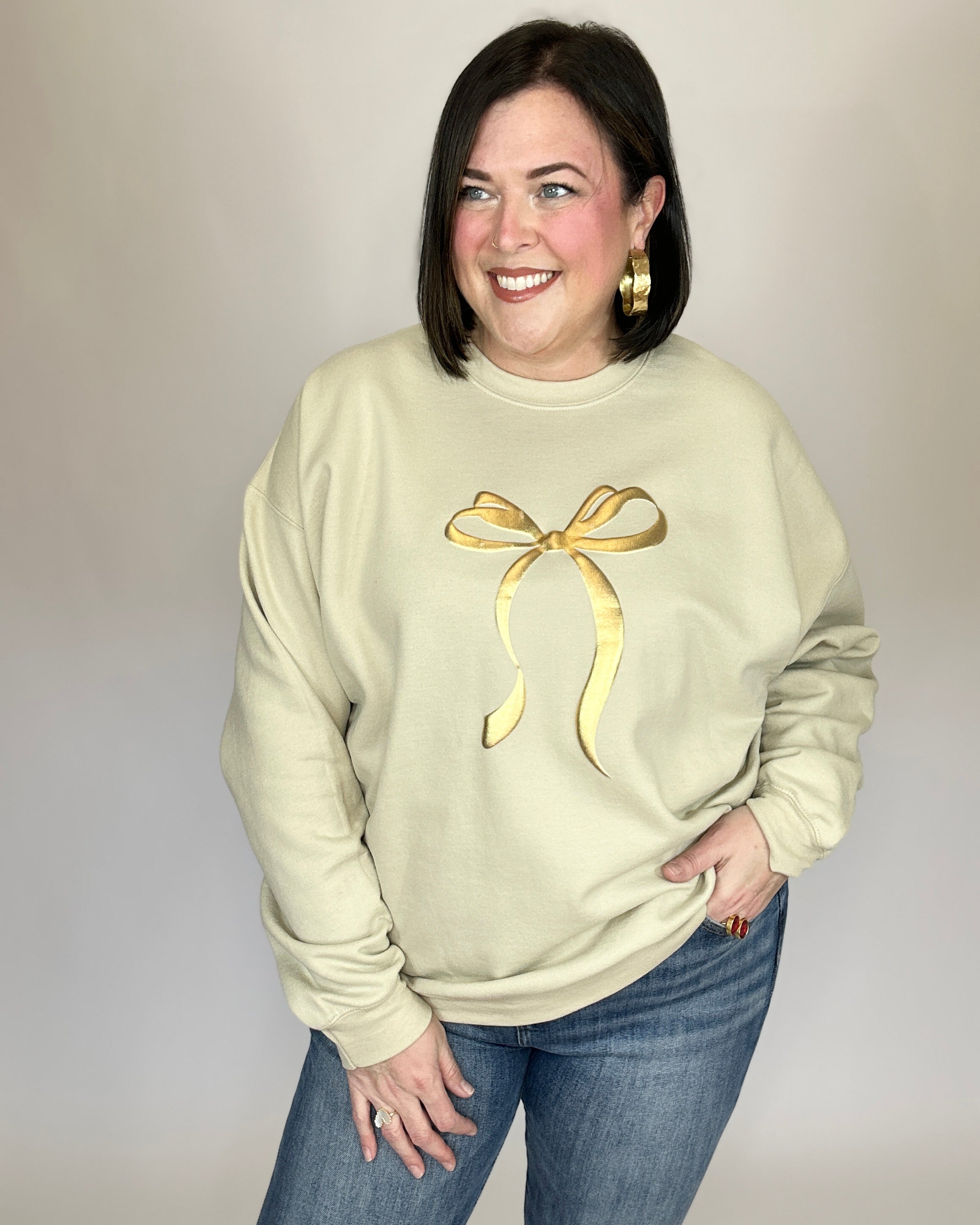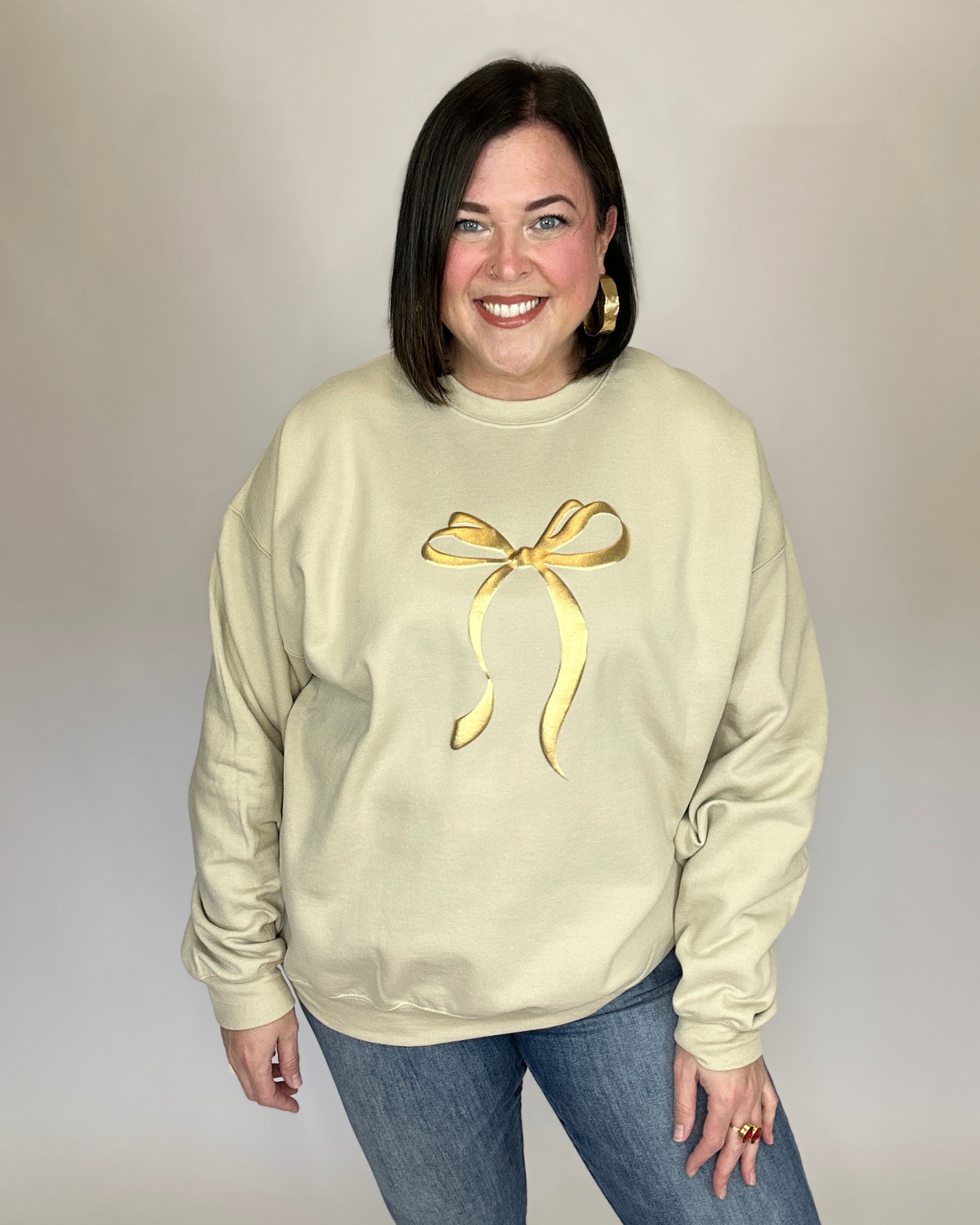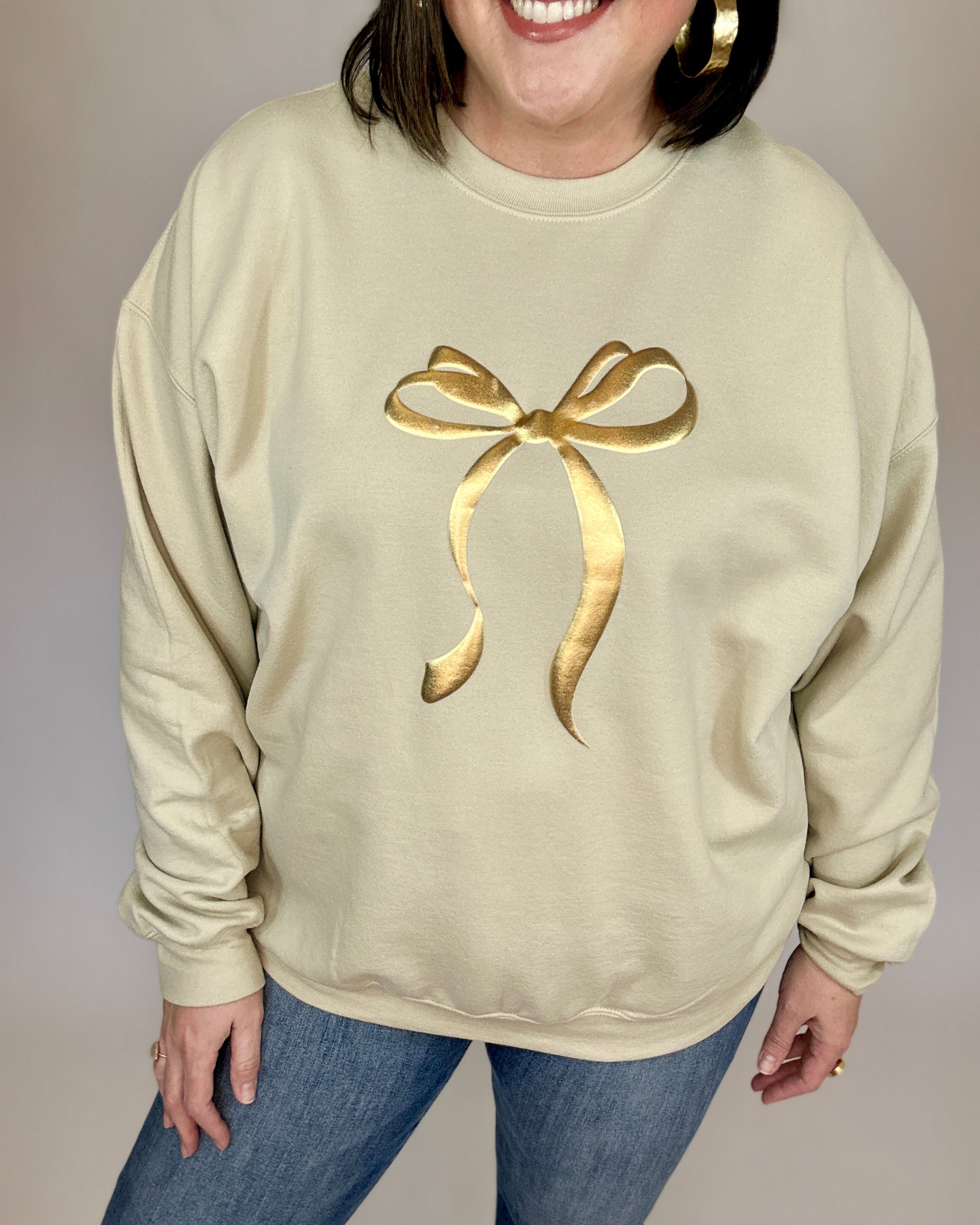 This soft neutral sweatshirt features an elegant raised metallic gold bow detail on the center front, adding a touch of charm and sophistication to an everyday essential. Designed with a relaxed fit and classic crew neckline, this piece blends comfort with elevated style. The subtle sheen of the bow creates a beautiful contract against the muted taupe base, making it an easy standout without being overdone. Perfect for casual days, holiday layering, or dressing up with denim and boots, this sweatshirt is cozy, stylish, and effortlessly feminine.
