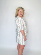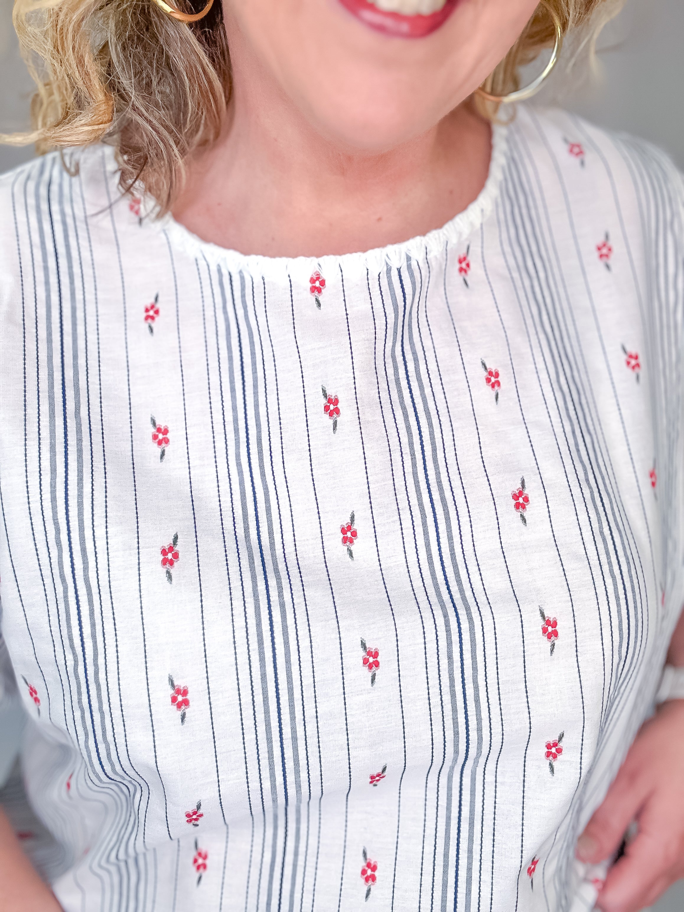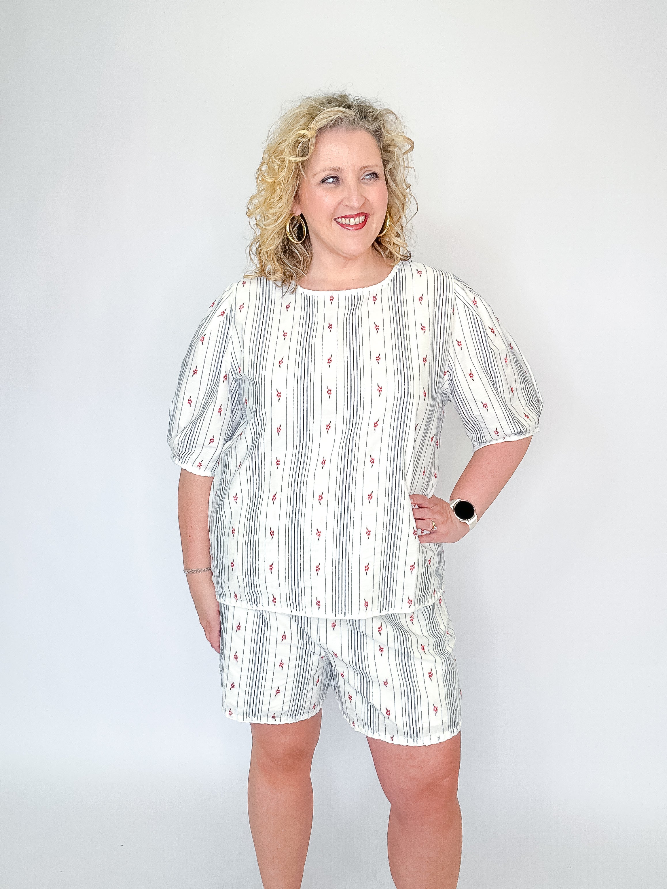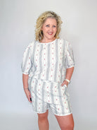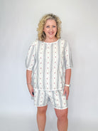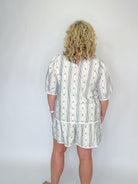 Elevate your warm-weather wardrobe with this refined two-piece set from GeeGee. The high-waisted shorts feature an intricate floral and stripe embroidered pattern with a coordinating lining for comfort and structure. Pair them with the included short-sleeved top, finished with a delicate keyhole closure at the back for an unexpected touch of elegance. The ivory and navy palette offers versatile styling for both casual outings and polished occasions. Perfect for those who appreciate thoughtful design details and quality craftsmanship.