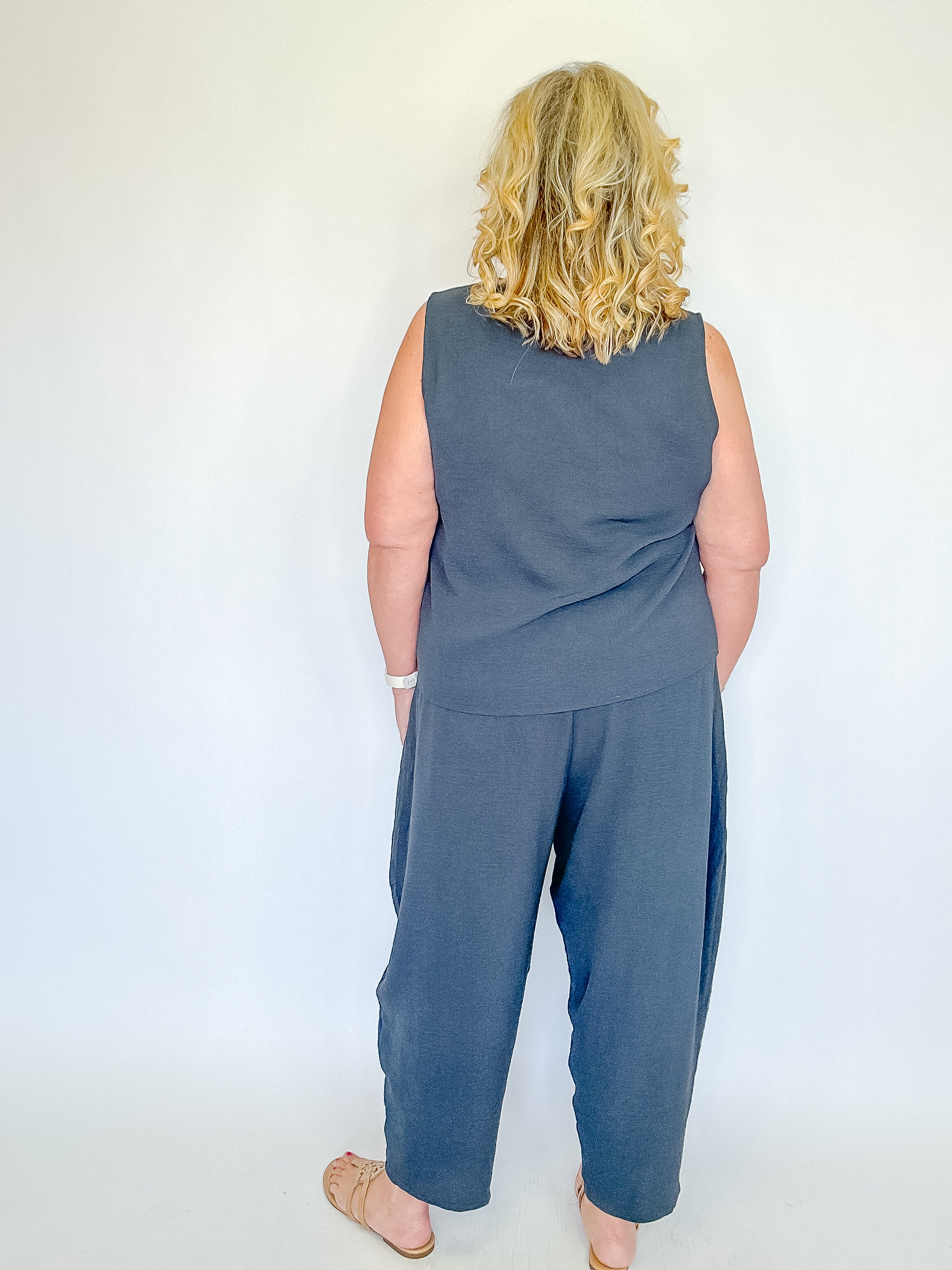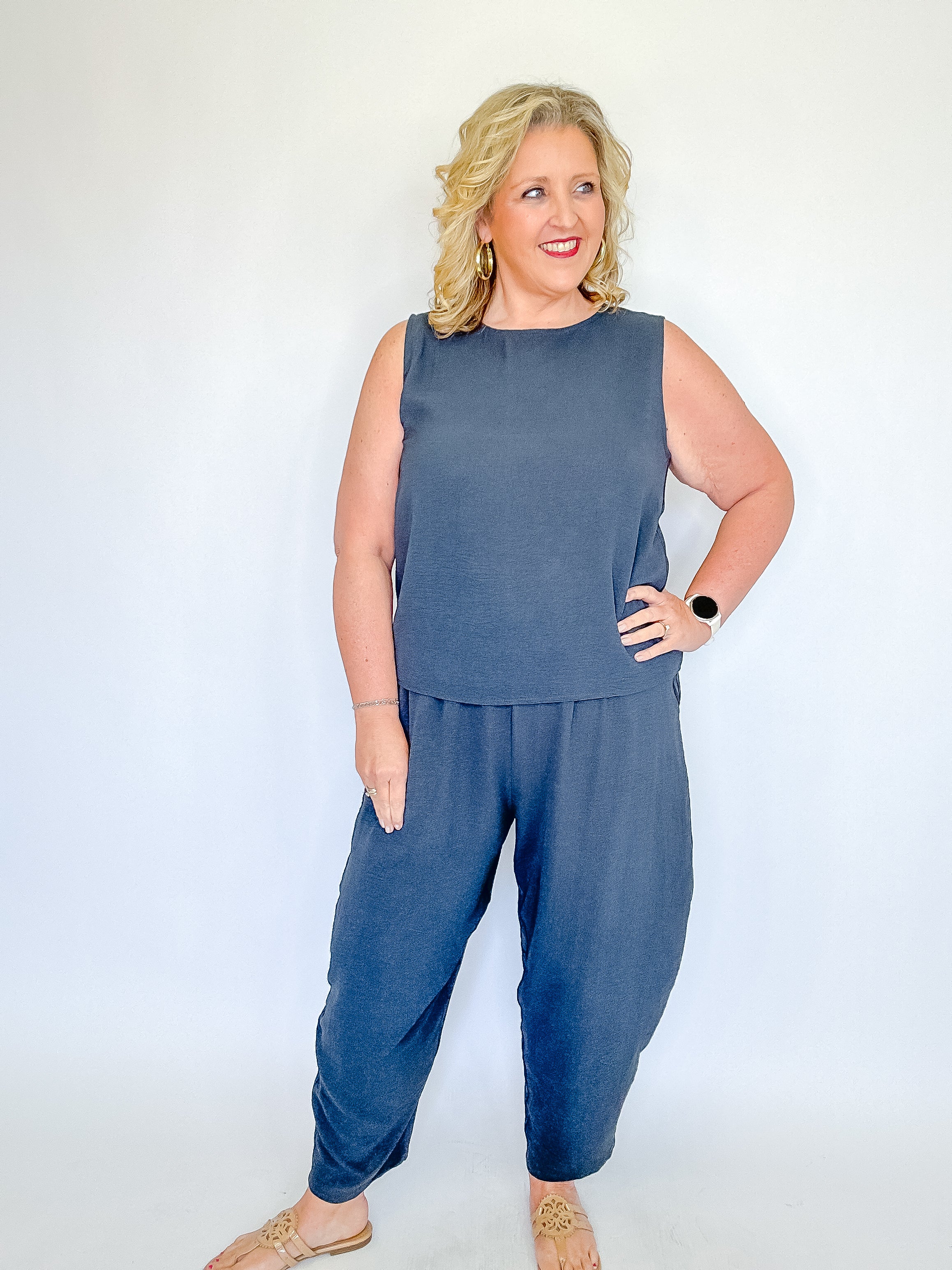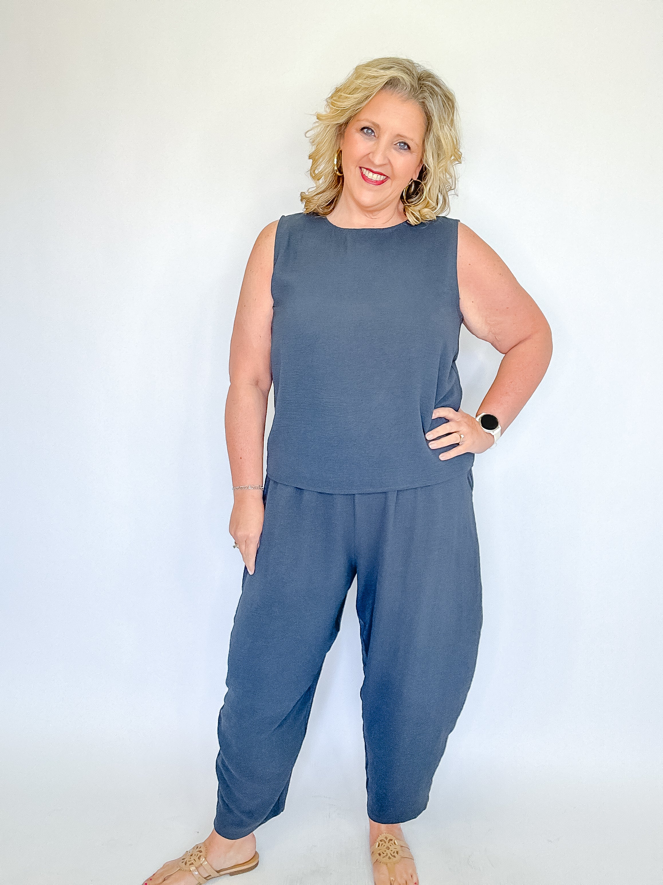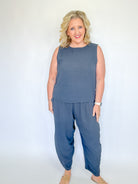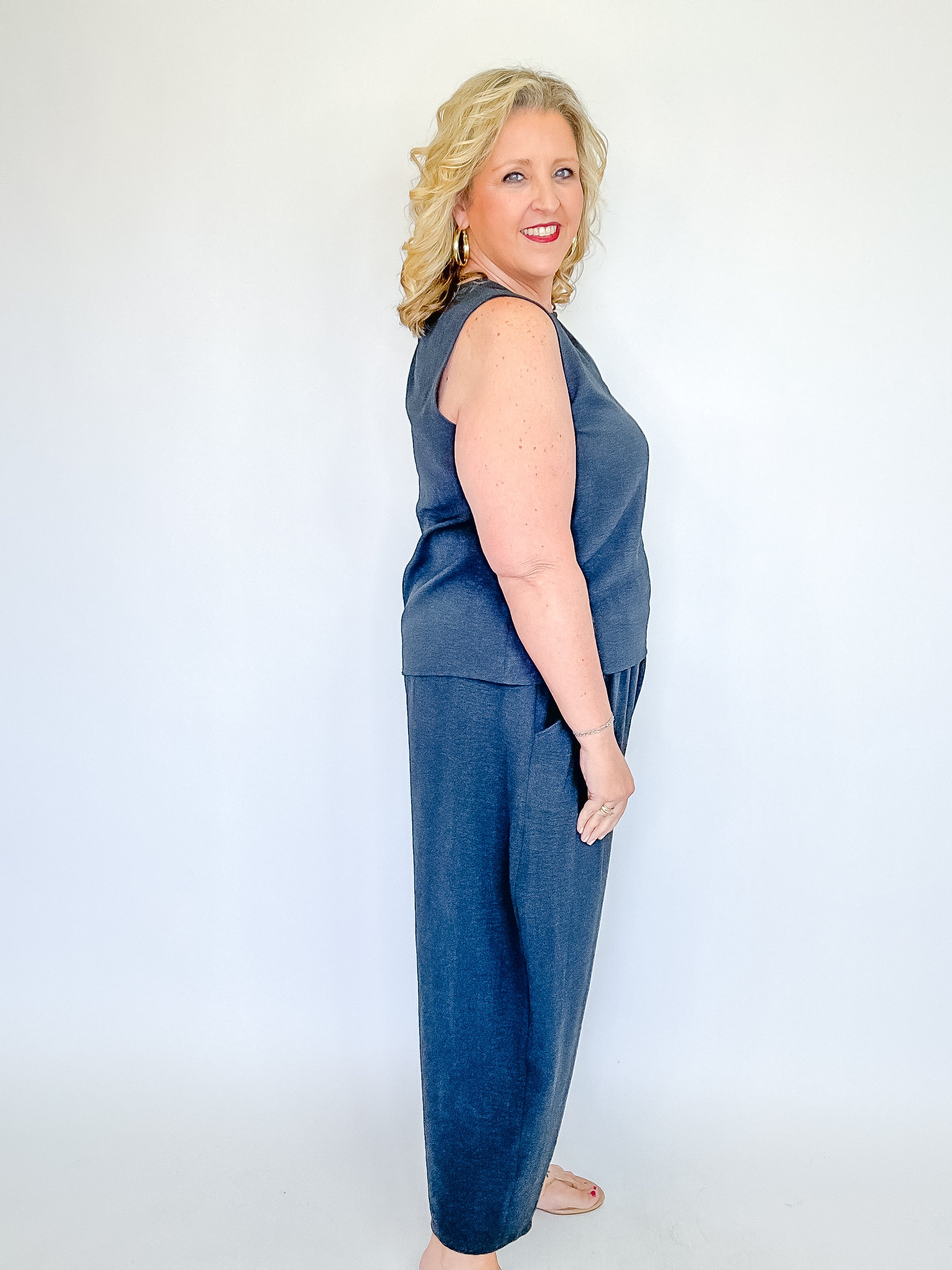 Effortless comfort meets understated style in this sleeveless textured knit lounge set. The easy-fit top features a clean, modern silhouette with a soft textured finish, perfectly paired with relaxed elastic-waist pants for all-day comfort. Designed to move with you, this versatile set transitions seamlessly from lounging at home to casual outings with a quick change of accessories. Wear together for a polished, laid-back look or mix and match with your favorite basics.