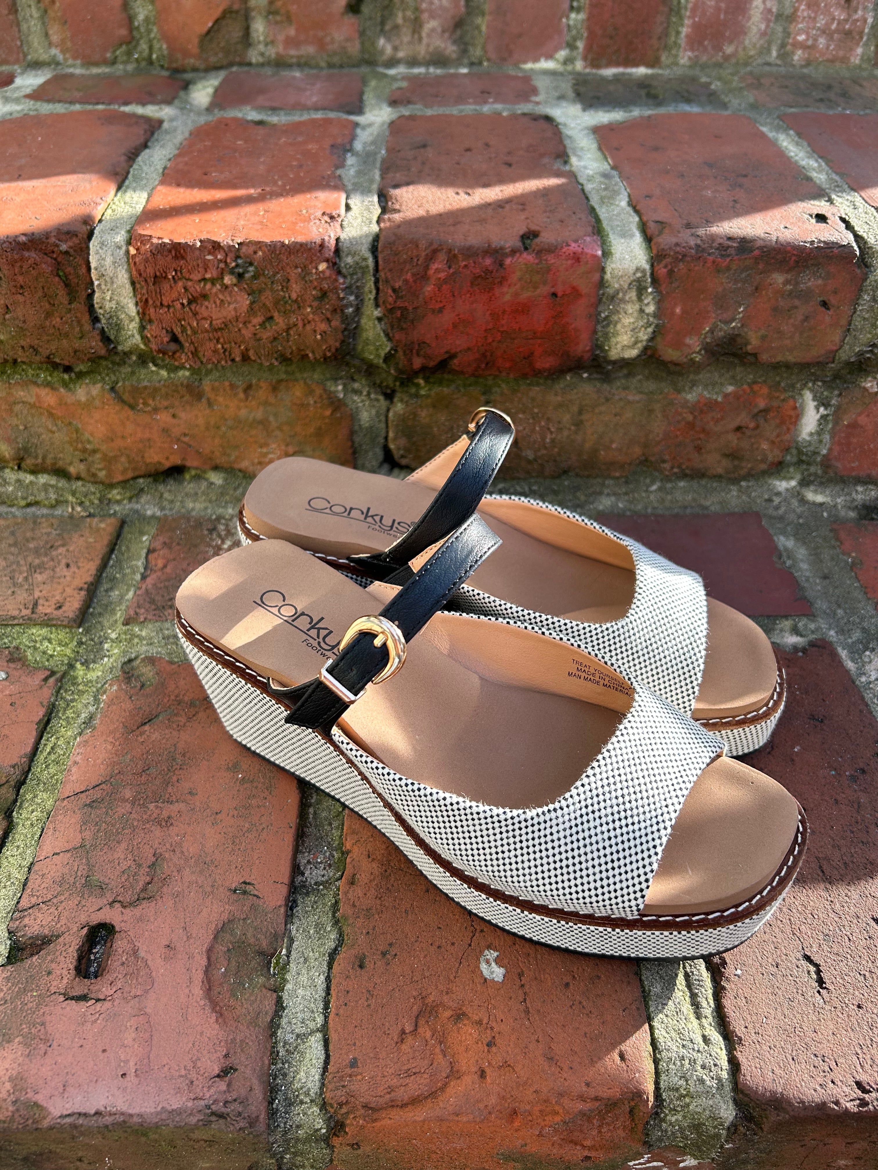 Your new favorite wedge is here. Corky's Treat Yourself combines a sophisticated textured neutral upper with a bold black ankle strap—the perfect pairing for any occasion. The signature cushioned foam footbed and lightweight cork-style platform deliver comfort that lasts from morning to night, so you can walk with confidence whether you're tackling your to-do list or stepping out for dinner. Versatile, flattering, and genuinely comfortable—this is the wedge you'll keep coming back to.
