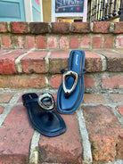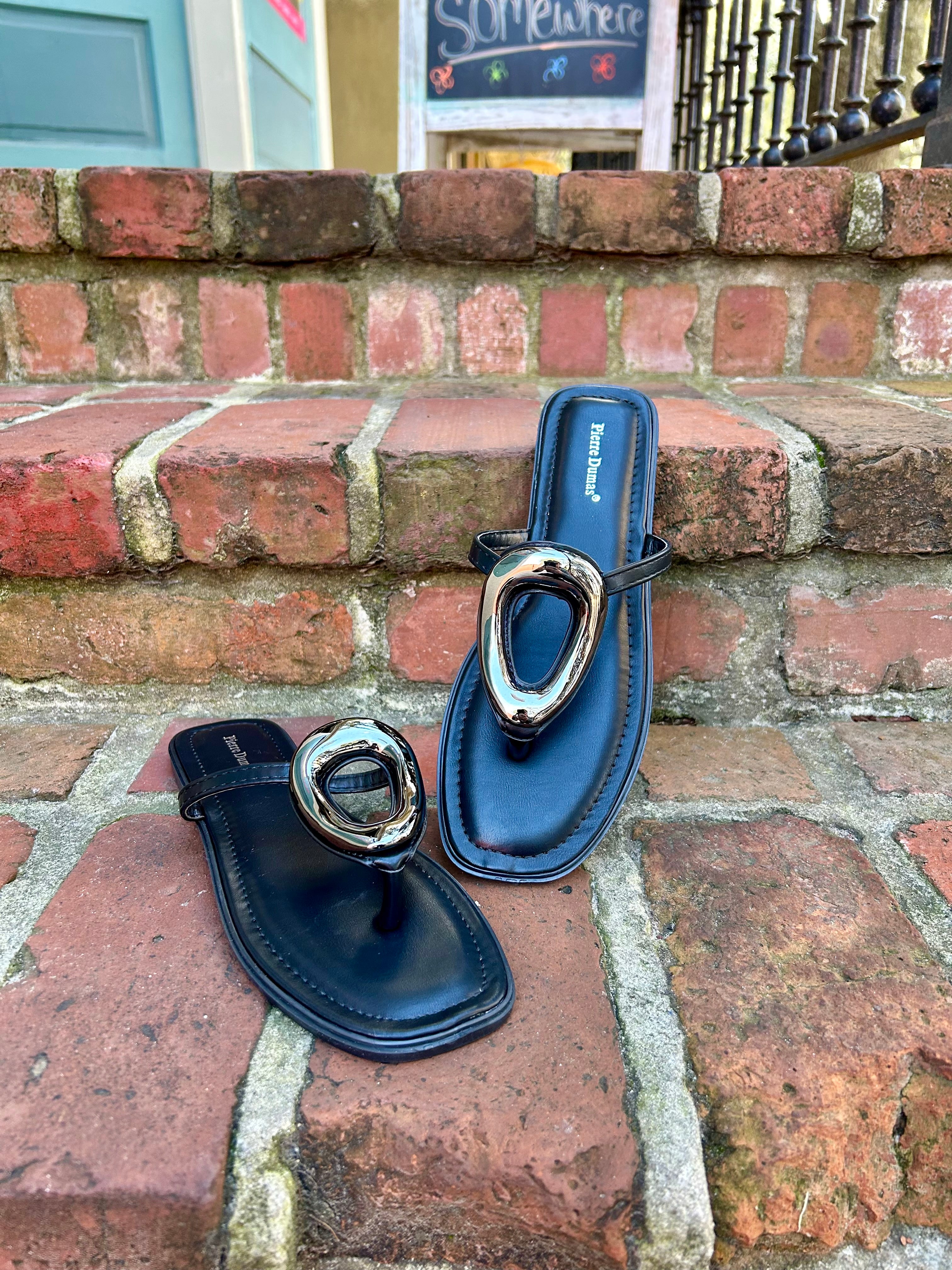 Clean, chic, and effortlessly cool. This black flat sandal features a modern toe-ring design finished with a bold gunmetal statement loop for a sleek, contemporary edge. Minimal yet striking, it’s the kind of sandal that pulls an outfit together without trying too hard.
