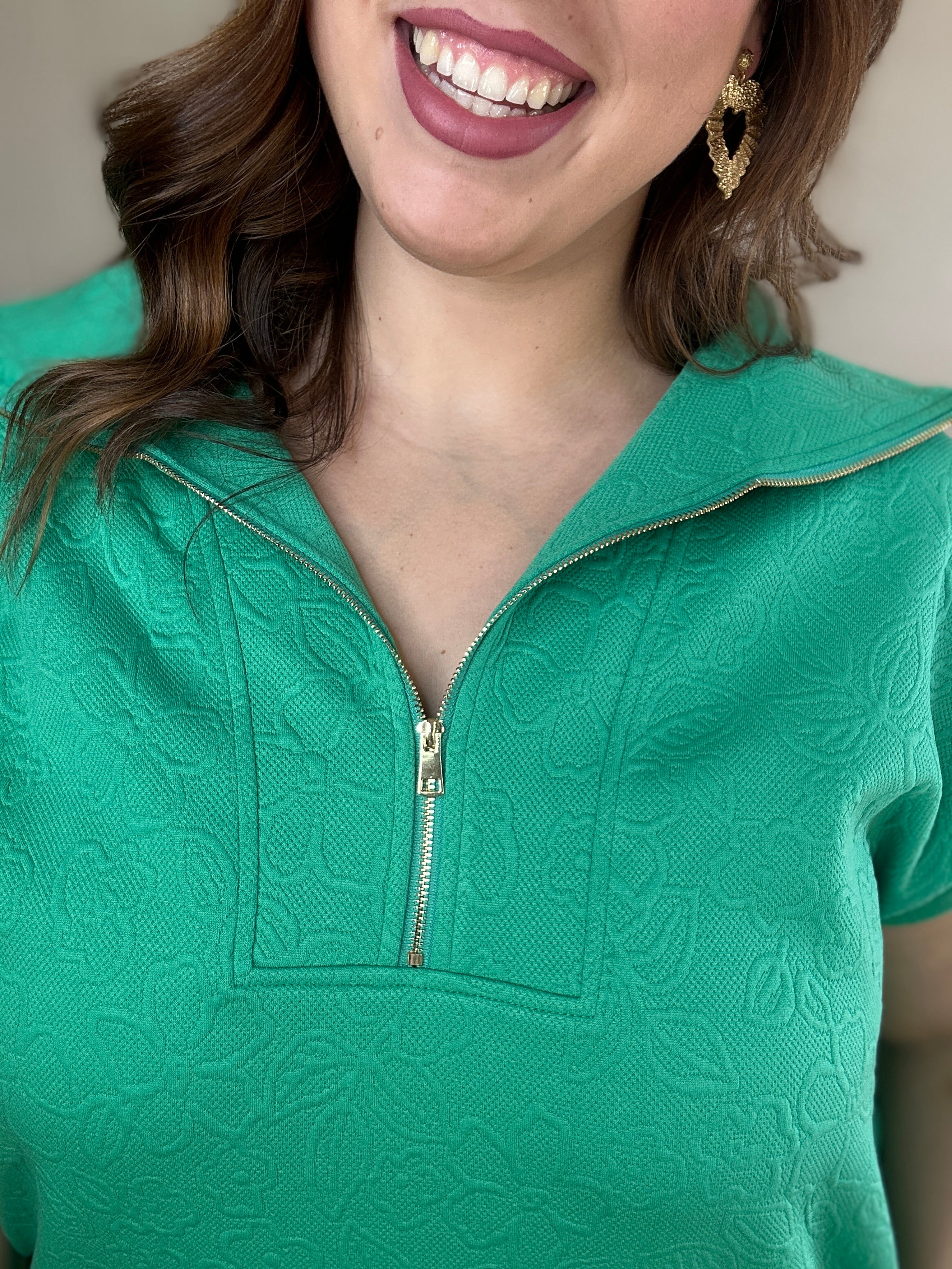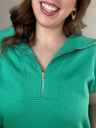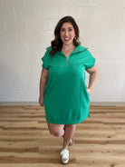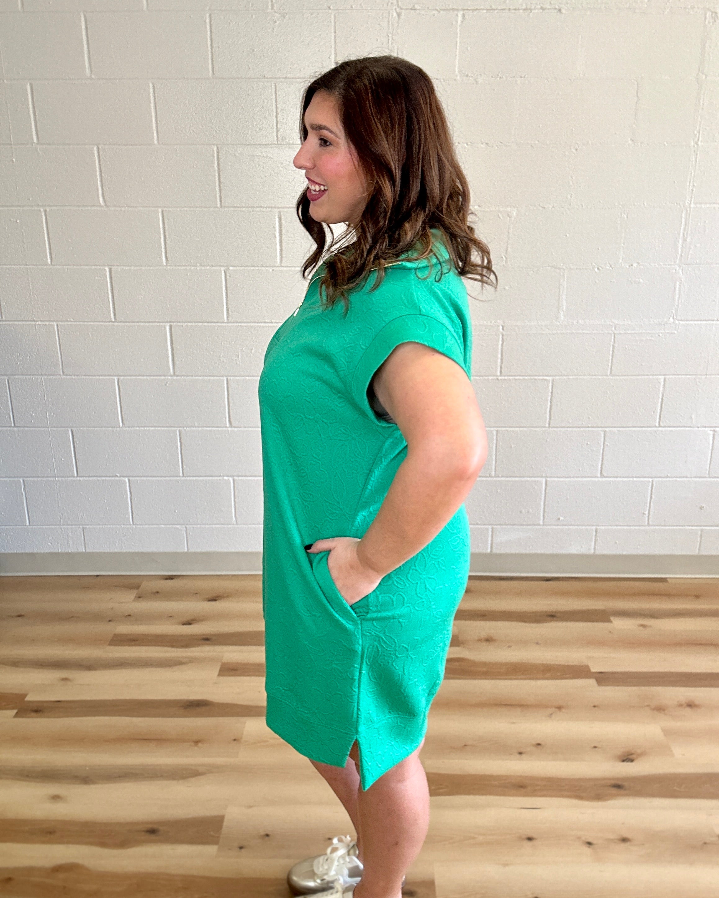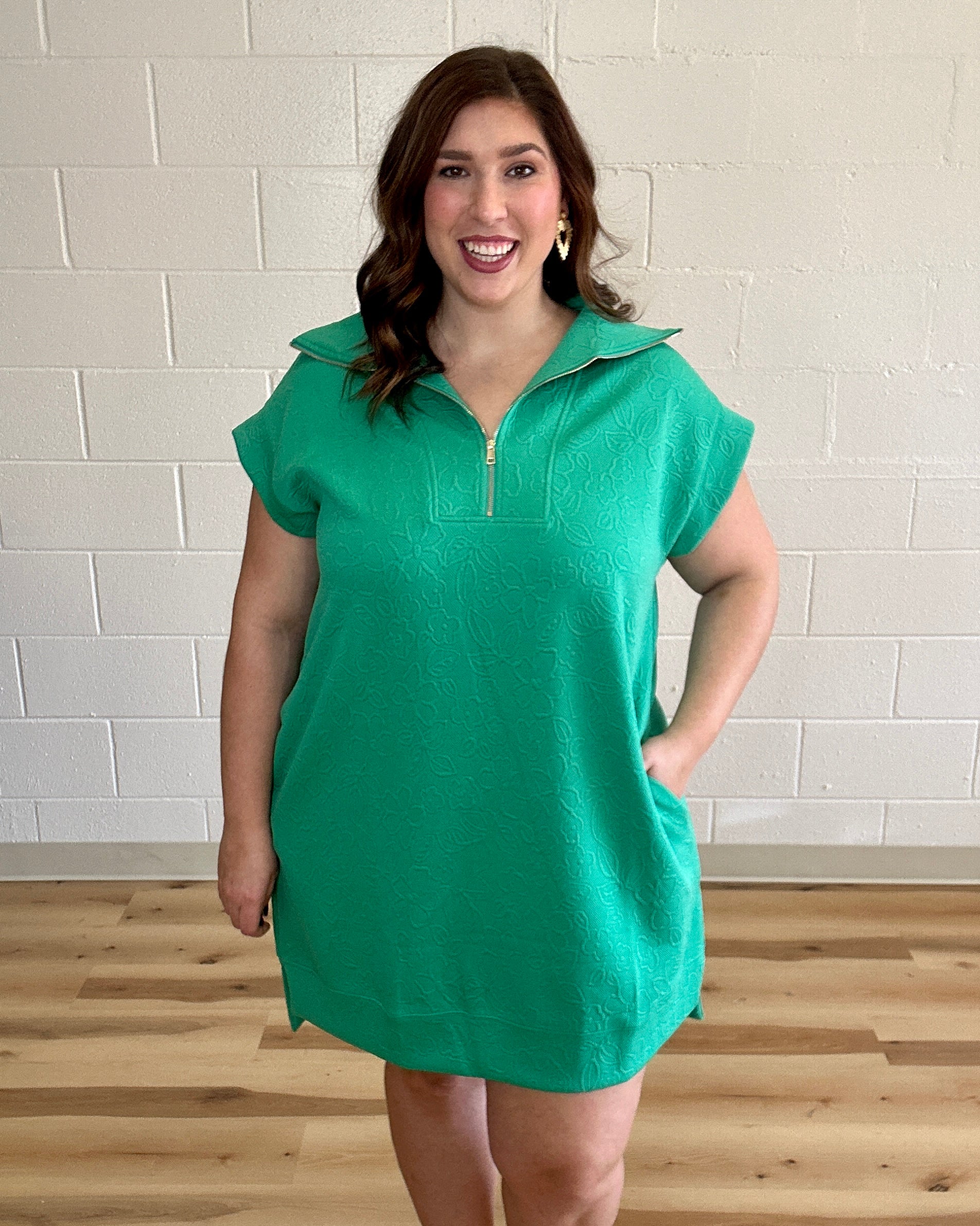 Effortless style meets comfort in this jacquard dress. The front zipper and cap sleeves create a relaxed, put-together look, while hidden side pockets add practical charm. Generous stretch fabric moves with you all day, making this the go-to piece for casual outings and laid-back weekends. Simple, flattering, and endlessly wearable.